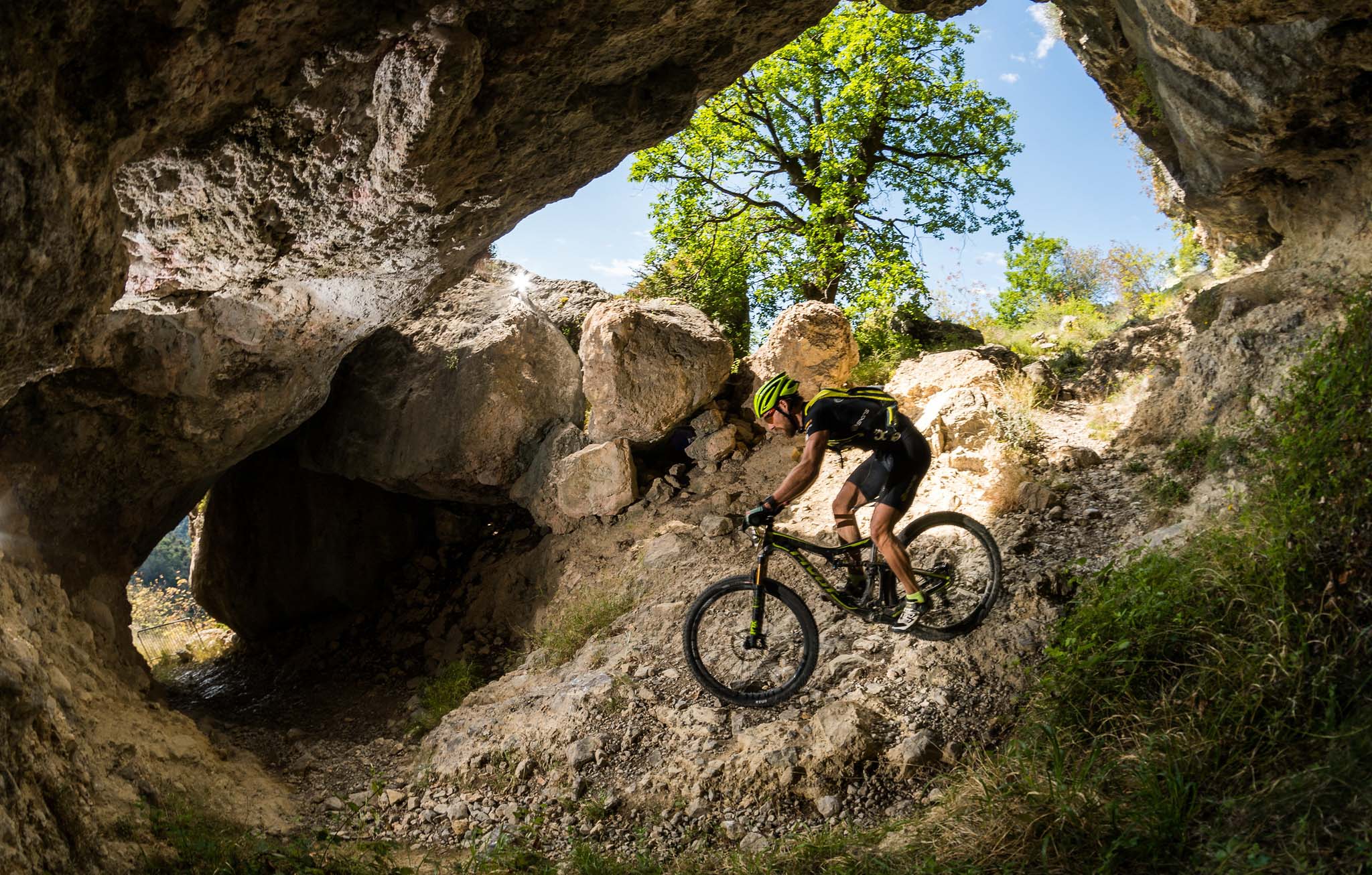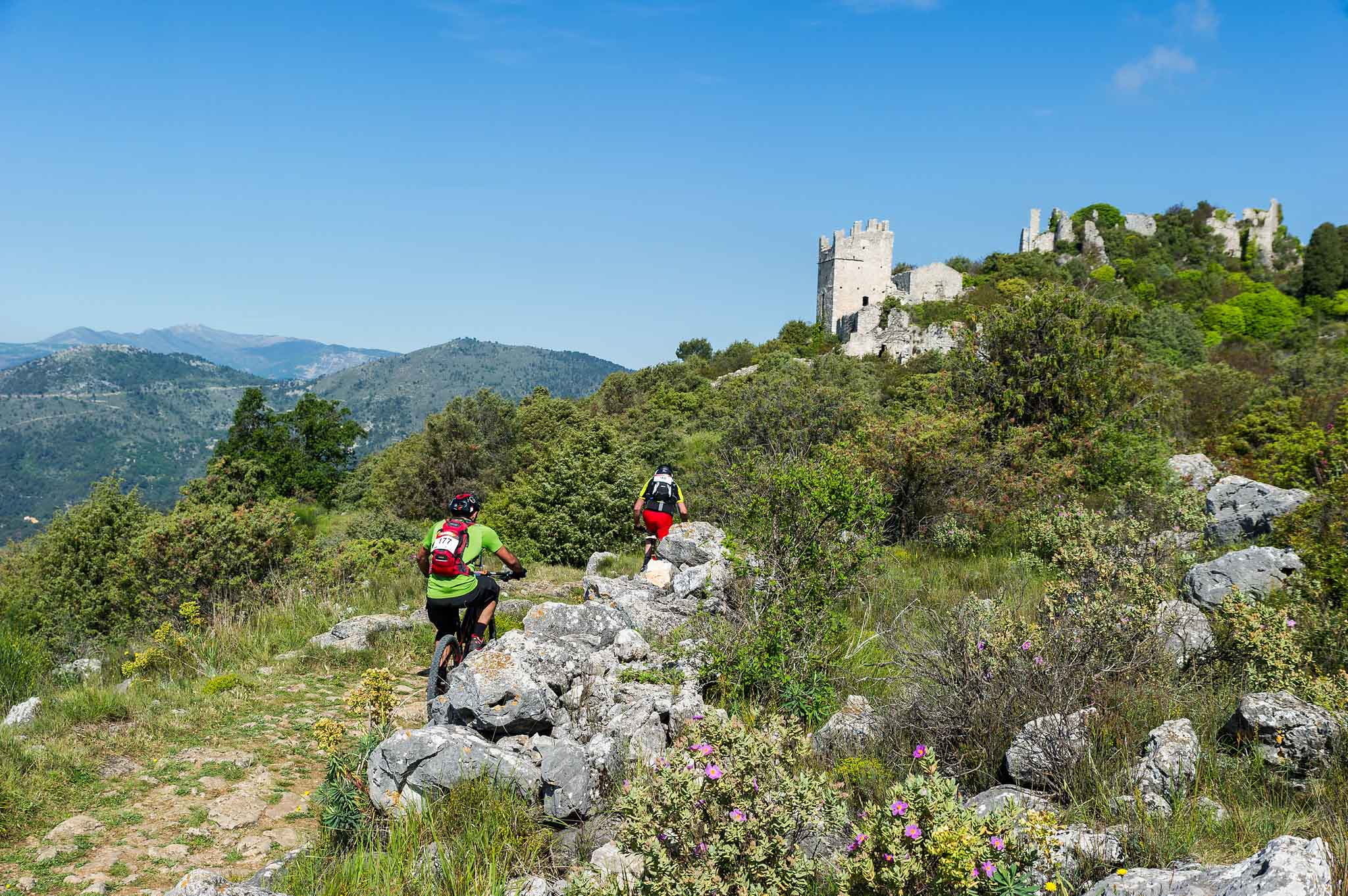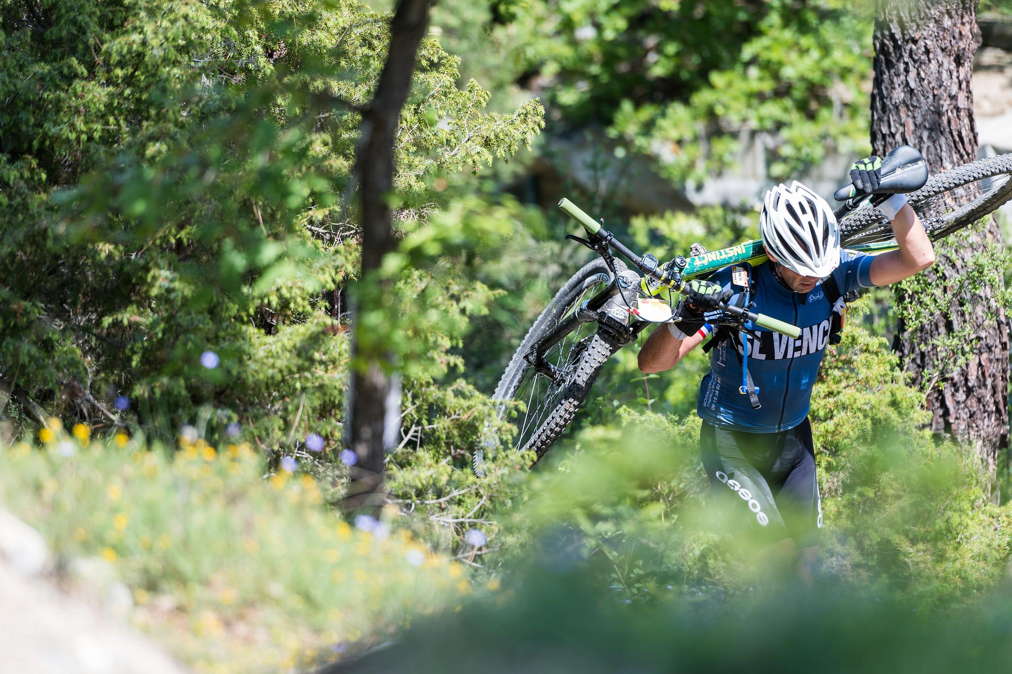 En tant que novices sur notre première TransV, on nous avait prévenu d’en garder « sous la pédale » pour la montée jusqu’à Levens et on va vite comprendre pourquoi. Nous faisons face à un interminable portage où nous allons reprendre quasi 650 m de dénivelé positif. Etrangement, les jambes vont de mieux en mieux, notre entrainement pour du long semble payer. De retour sur le vélo, la végétation a bien changé. On roule maintenant au milieu des forêts de pins et des genêts en fleur.