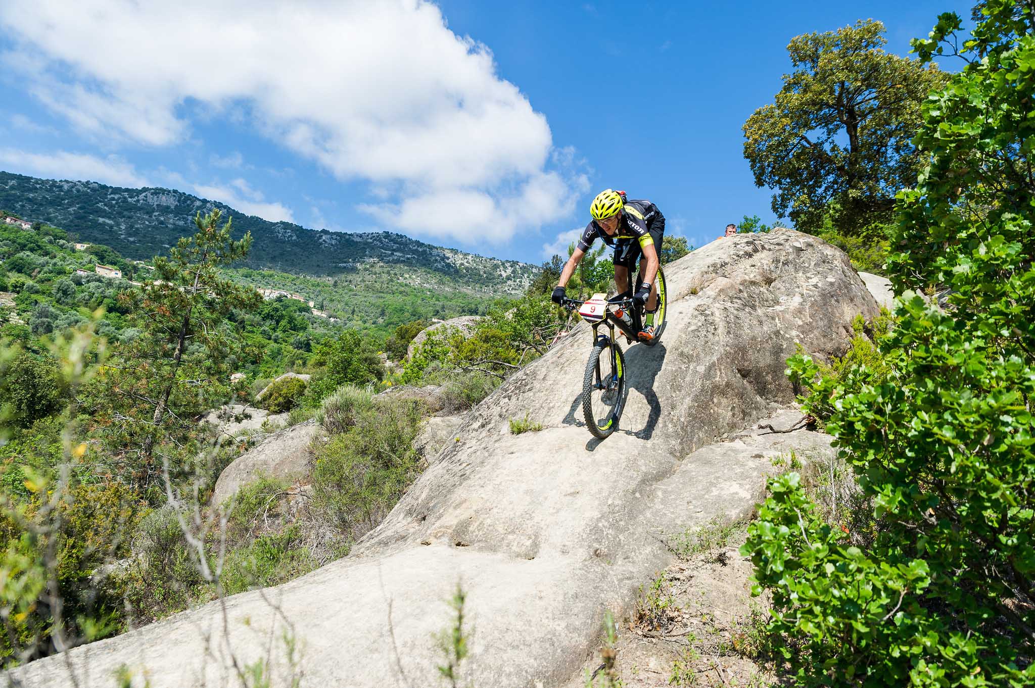 Arrive le premier ravito à Andrion qui nous permet de récupérer un peu. Une fois nos bras retrouvés, nous voilà repartis sur un single toujours aussi technique qui se transforme en une longue traversée en dévers pour rejoindre le Brec d’Utelle. Il faut être attentif afin d’éviter les nombreux pièges sur lesquels il est facile de taper un pédale, on peut vite se retrouver dans le ravin !