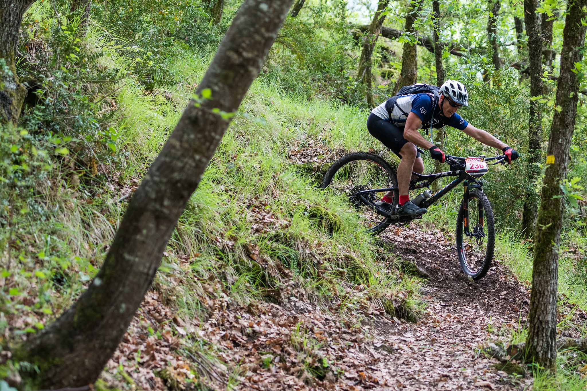 Le gros du paquet est déjà bien étiré et nous basculons vers la première descente technique qui se compose d’un savant mélange de terre, de racines humides et de cailloux. Nous comprenons mieux maintenant pourquoi une majorité des participants optent pour des vélos avec du débattement (n’est-ce pas Matthieu ?). Christof Sauser était une nouvelle fois présent sur la Transvésubienne, mais en vélo électrique ! Et, encore une fois, il a été maudit puisqu’il s’est perdu, prenant du même coup 1h dans la vue. Caramba, encore raté.