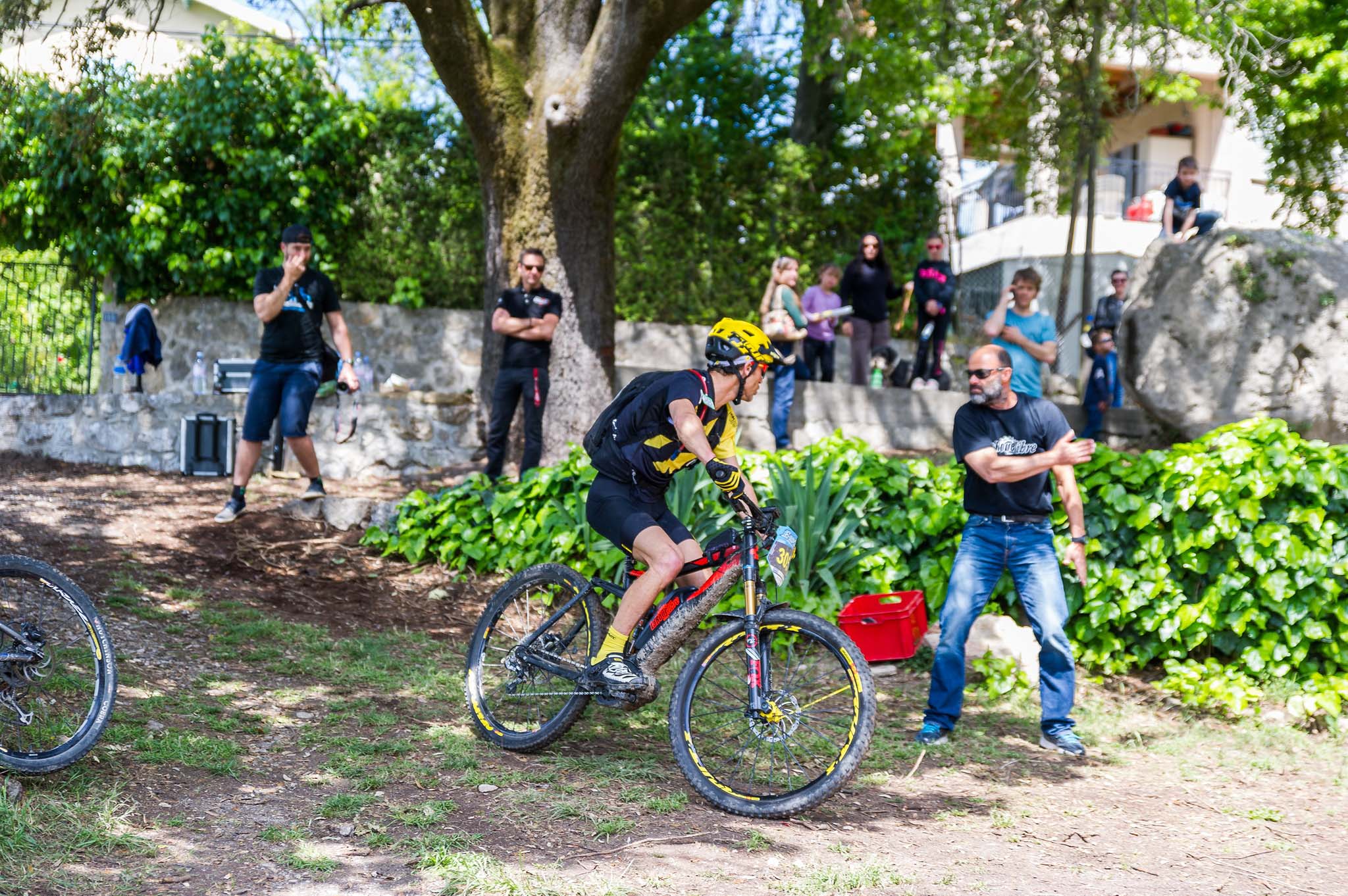 Une belle descente s’offre ensuite à nous jusqu’à Utelle. Là, on change légèrement de registre avec toujours des cailloux, certes, mais le rythme est plus rapide et de la terre grise qui donne envie d’attaquer. Nous arrivons dans une belle section avant le 3ème ravitaillement où le public est très nombreux.