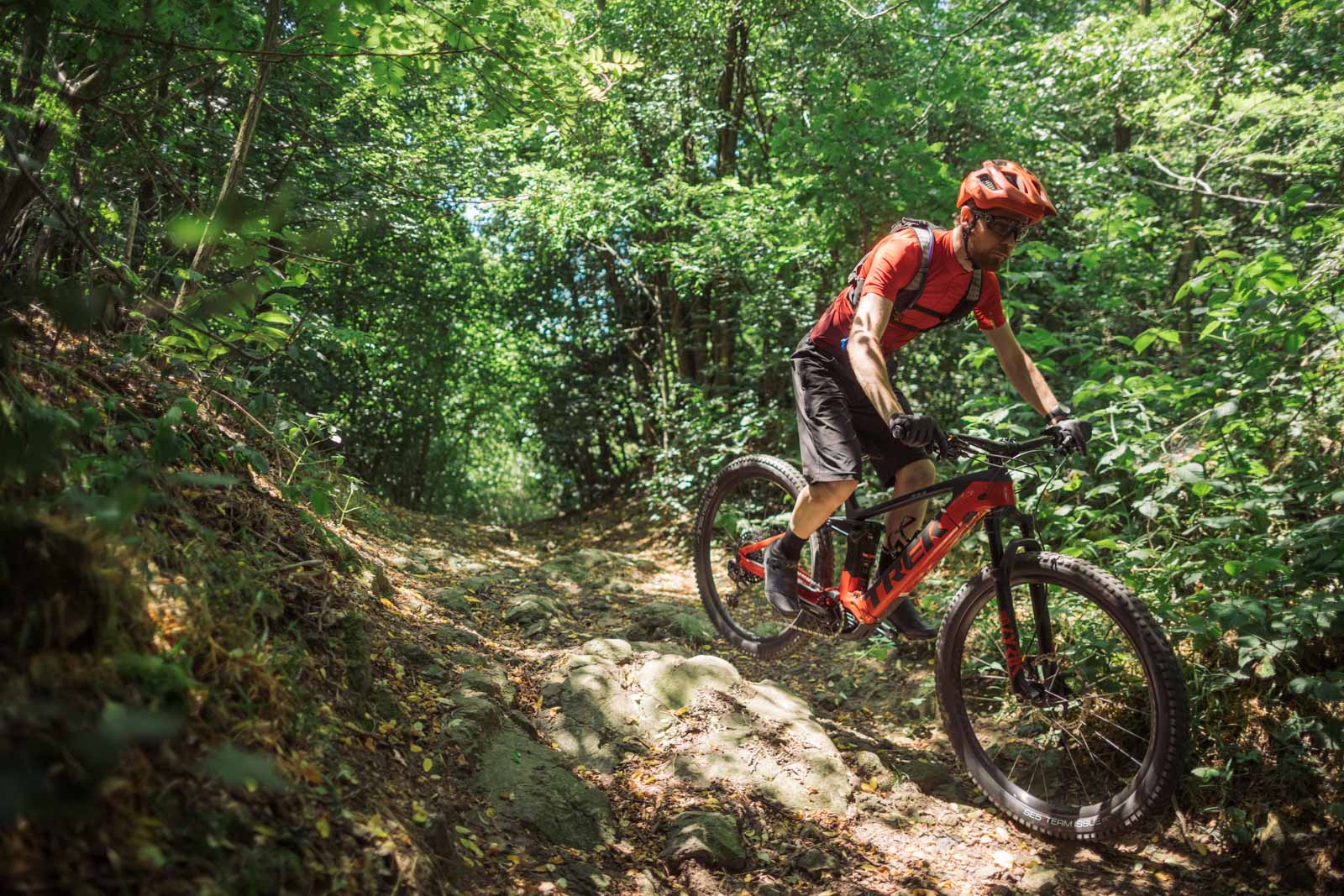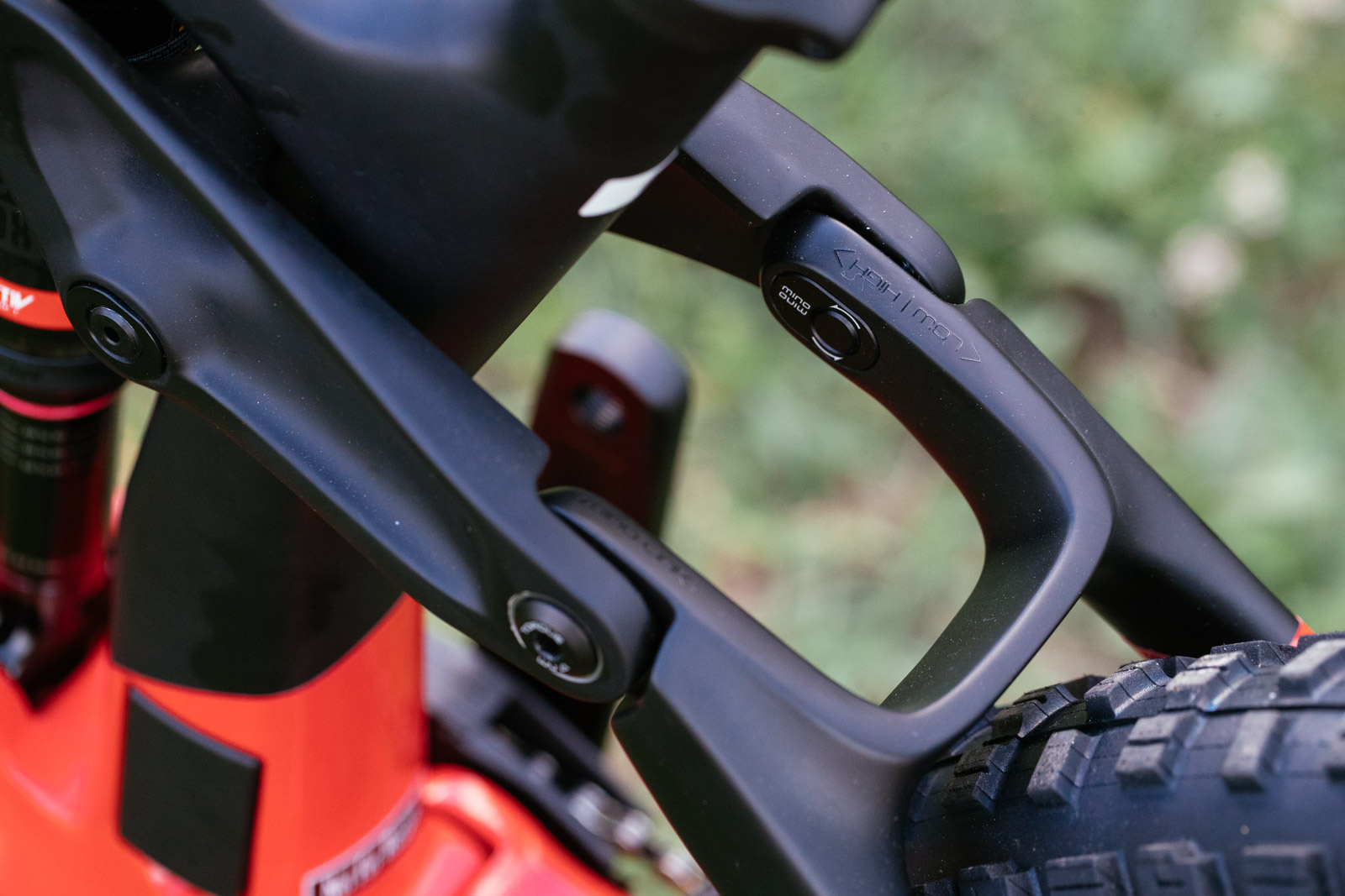 Notre monture d’essai est un Rail 9.8. C’est le deuxième modèle en carbone, équipé d’une commande Purion, d’une transmission Sram GX Eagle et d’une fourche RockShox Lyrik Select+. Pour cette sortie, nous laisserons le Mino-Link en position Low.