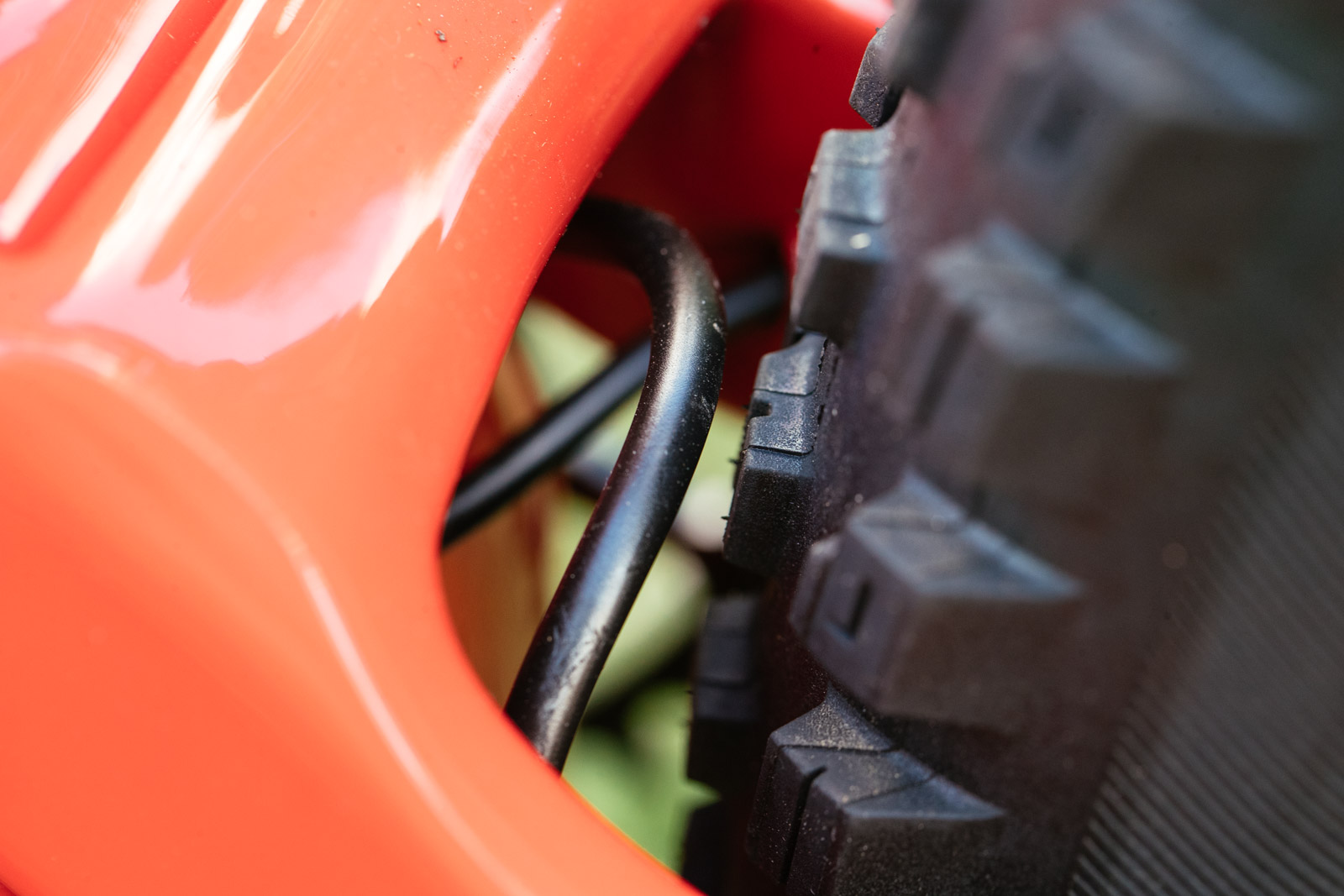 Nous sommes en revanche plus dubitatifs quant aux passages internes du câble de dérailleur et de la Durit de frein dans le triangle arrière. Ils passent très près du pneu arrière en 29×2.6 et nous n’avons pas vraiment réussi à les bouger.