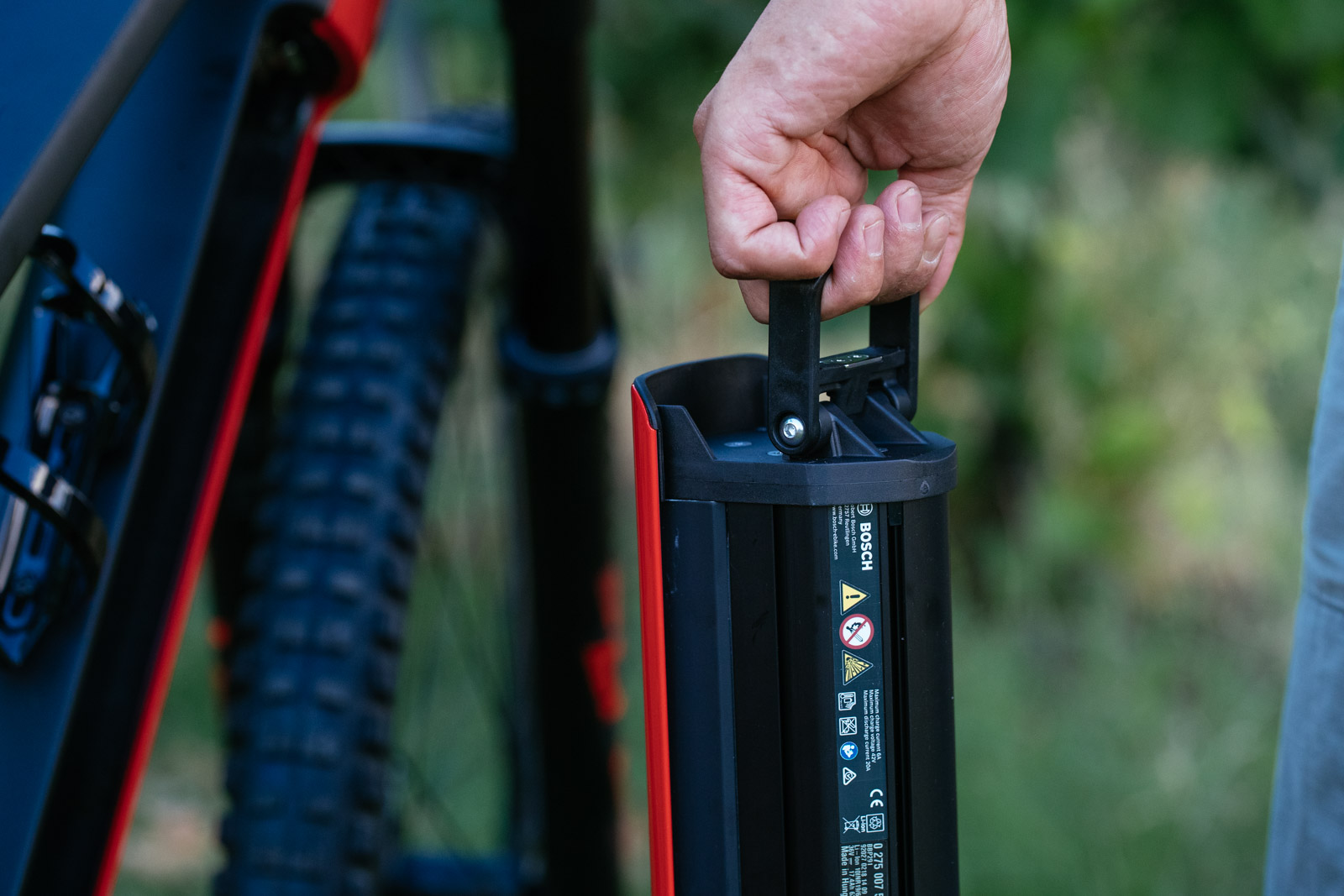 Par ailleurs, la protection est fixée à la batterie, ce qui fait toujours une pièce de moins à stocker lorsque la batterie est démontée. Ce démontage se fait d’ailleurs sans autre outil que la clé de déverrouillage, fournie avec le vélo. Pour faciliter le transport, une petite poignée bien pratique est intégrée à une extrémité de l’ensemble batterie + protection.