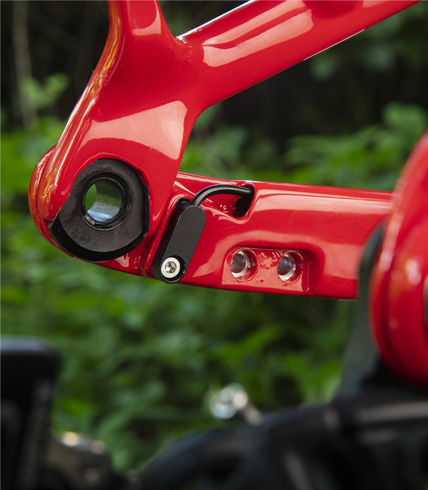 De plus en plus de marques développent leurs propres solutions pour sécuriser et cacher au maximum le capteur de vitesse sur la roue arrière et Trek n’est pas en reste. La solution proposée par la marque américaine est d’ailleurs particulièrement réussie, avec un capteur semi-intégré dans la base et un aimant qui prend la forme d’une entretoise entre deux vis du disque.
