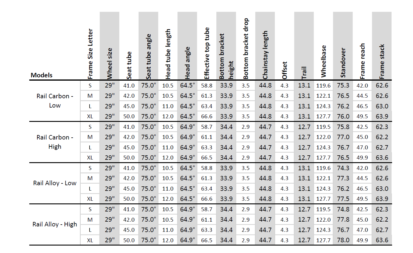 En ce qui concerne la géométrie, la marque américaine s’était fixé un objectif clair : transférer la géométrie du Slash d’enduro sur un VTTAE. Vis-à-vis de l’ancien Powerfly LT, ce Rail dispose donc de bases plus courtes (- 27 mm), d’un reach plus long (+11 à 27 mm) selon les tailles et d’un angle de direction plus couché (-1,5°).