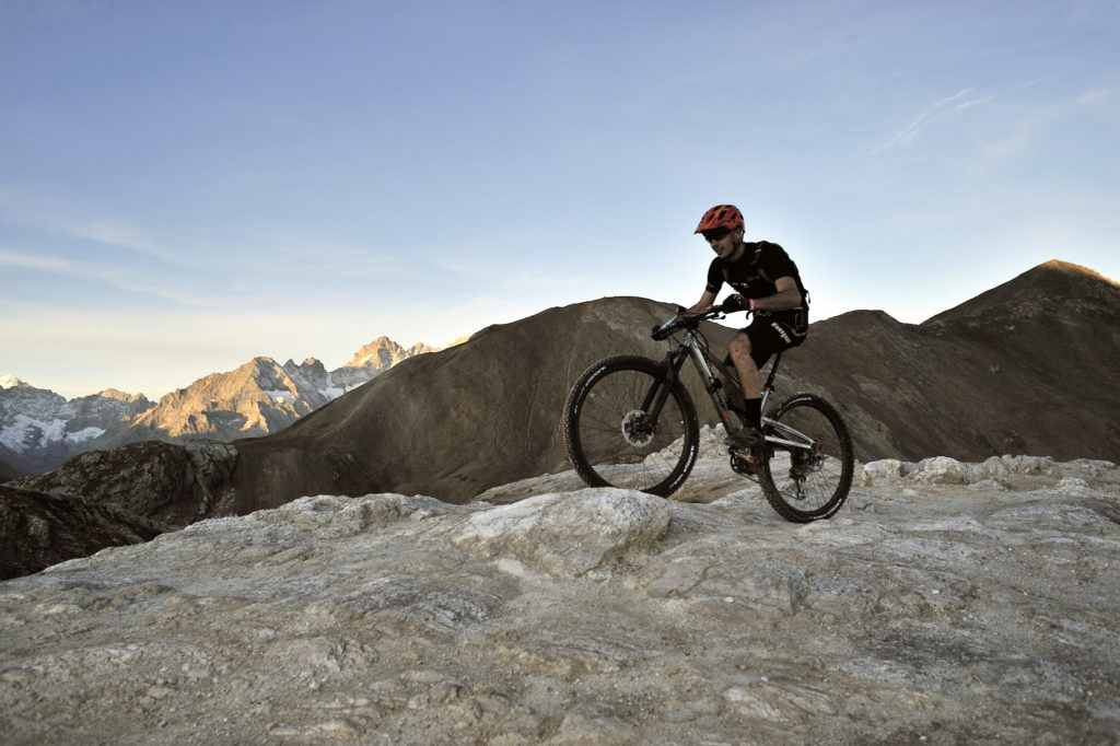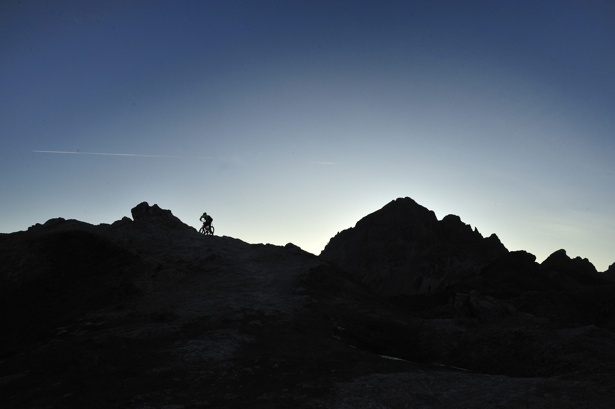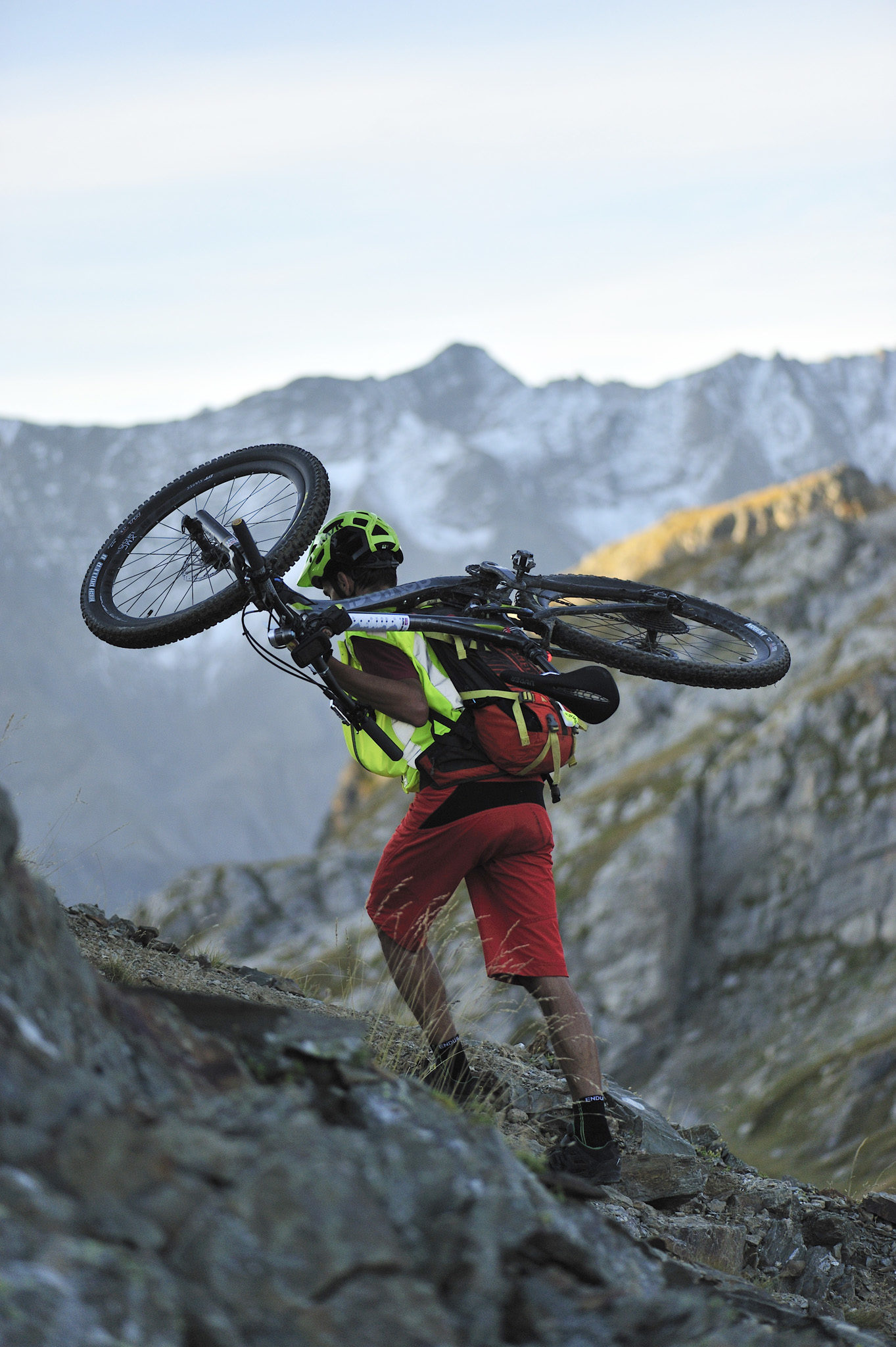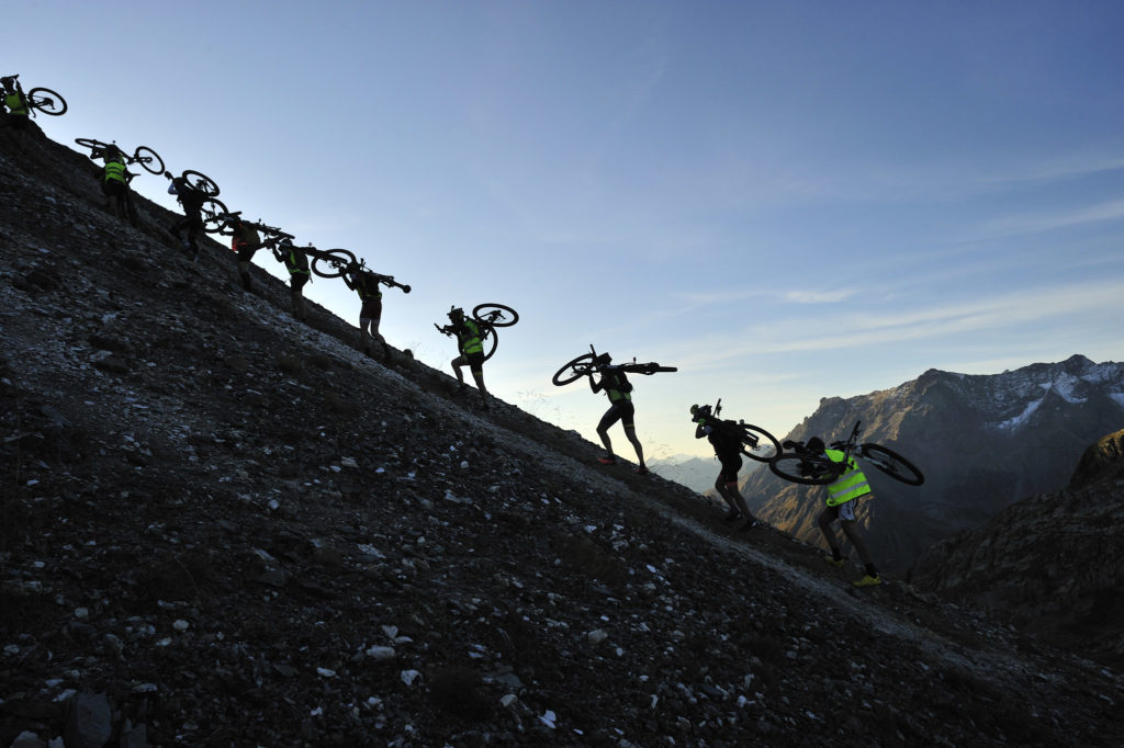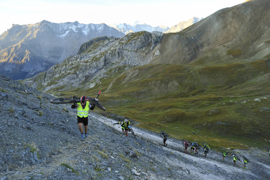 Le lever du jour accueille les bikers qui portent leur VTT sur la pente de la pyramide menant au Galibier.