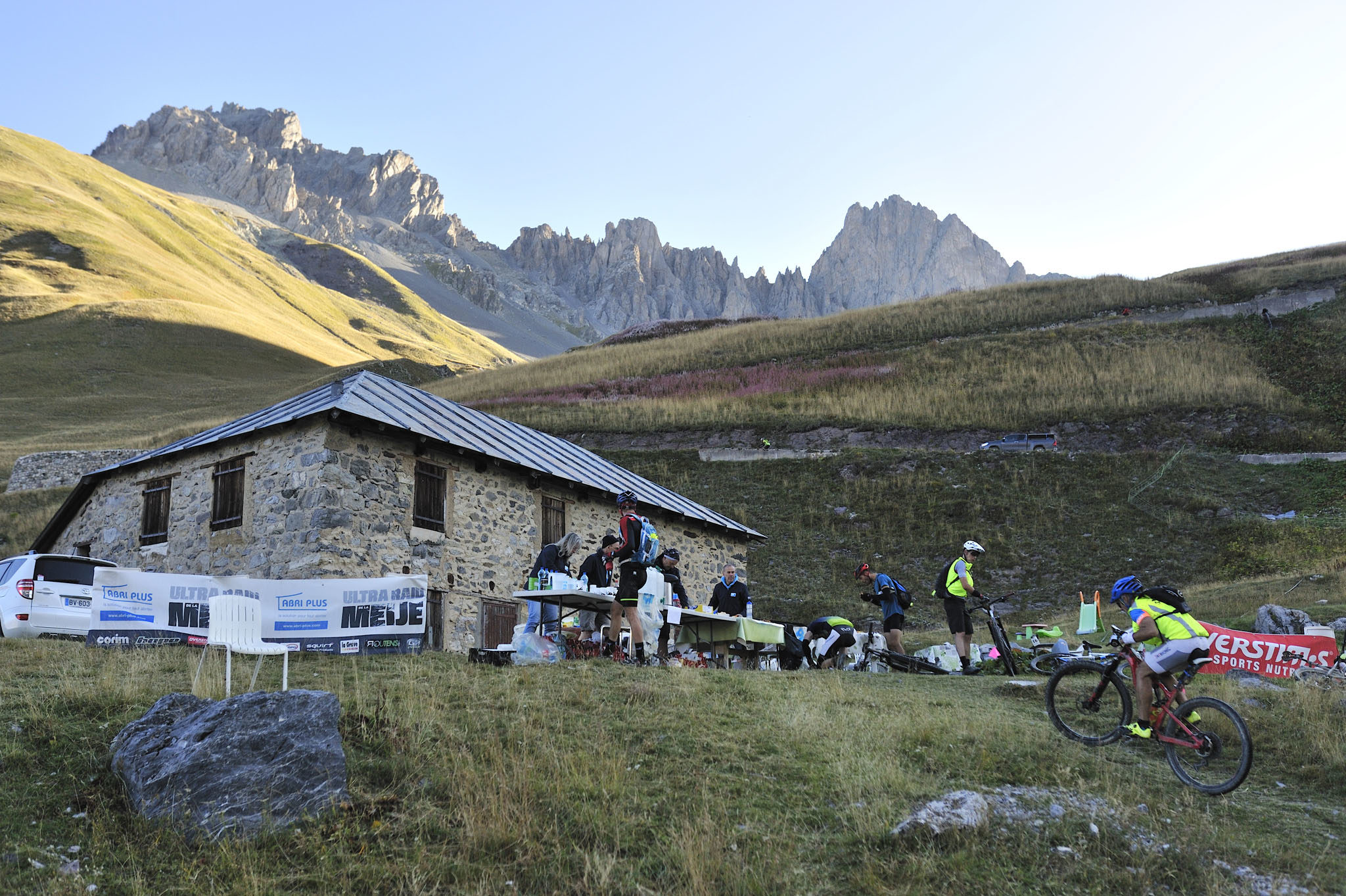 Aux chalets d’estive de l’Alpe du Lauzet, le ravitaillement est le bienvenu. Les freins ont eu chaud et les corps ressentent doucement la fatigue s’immiscer.