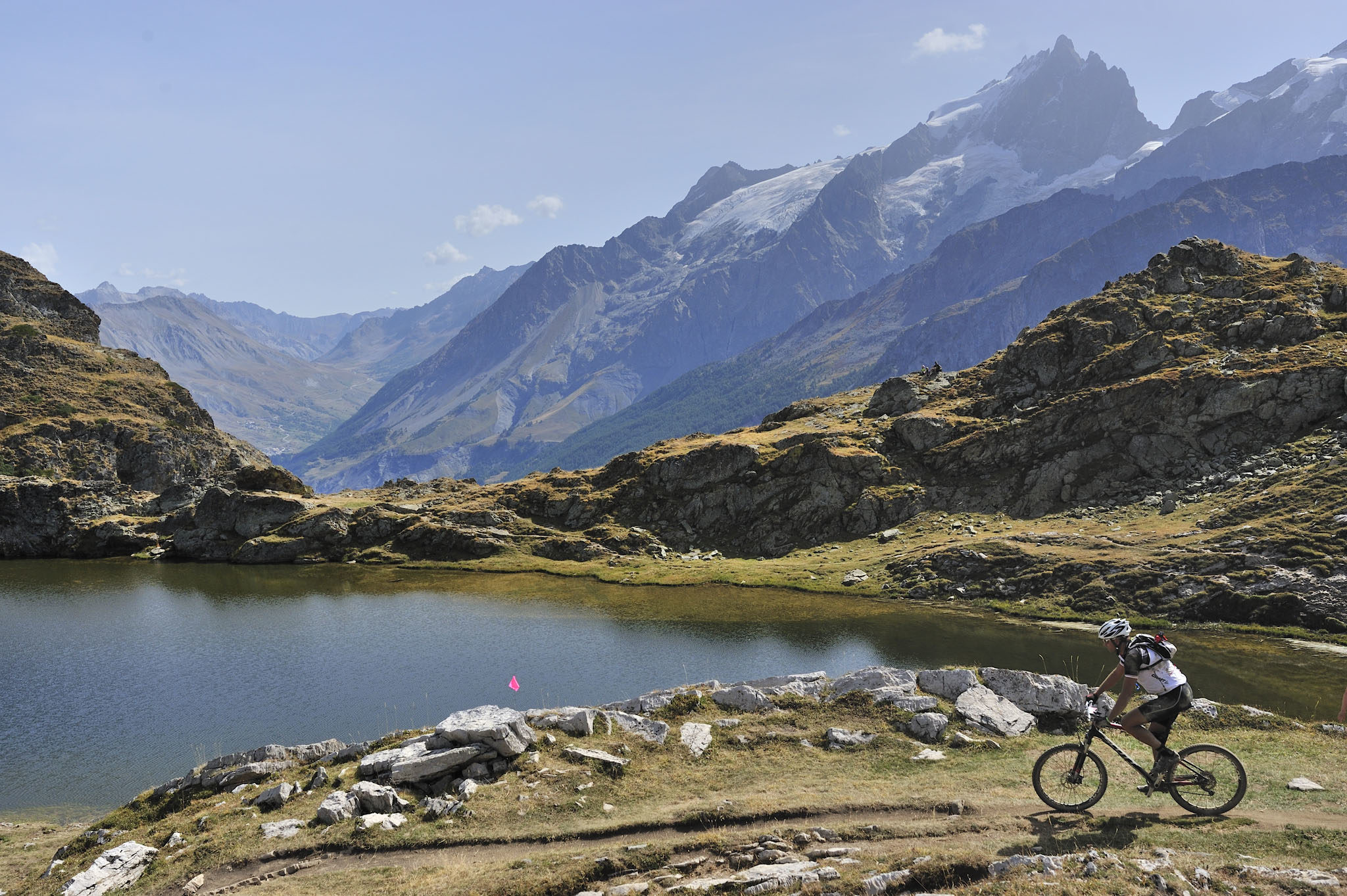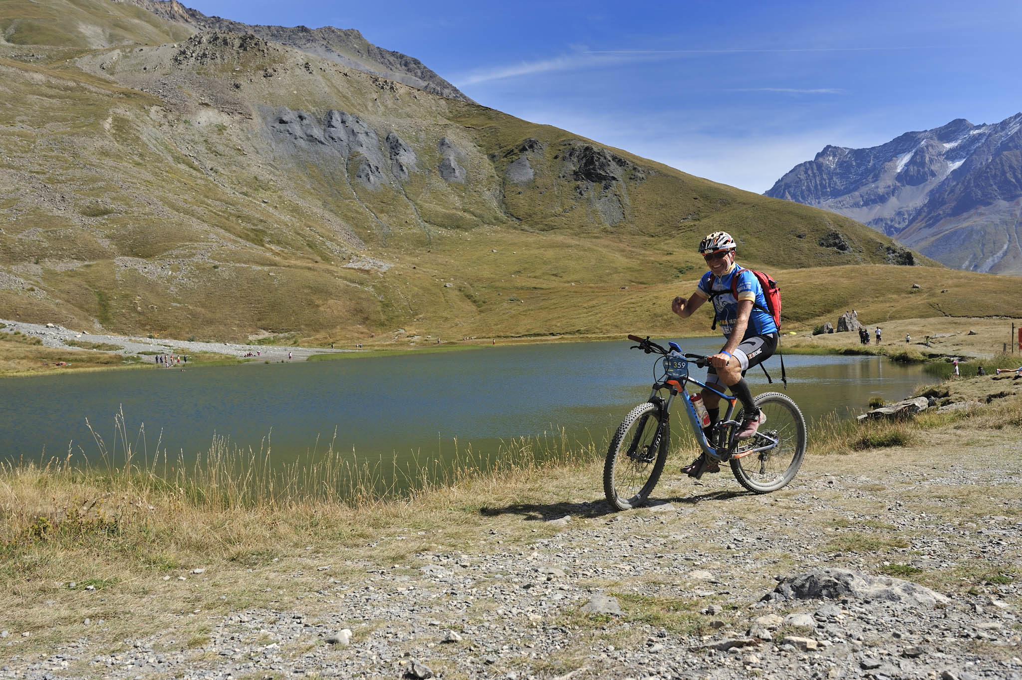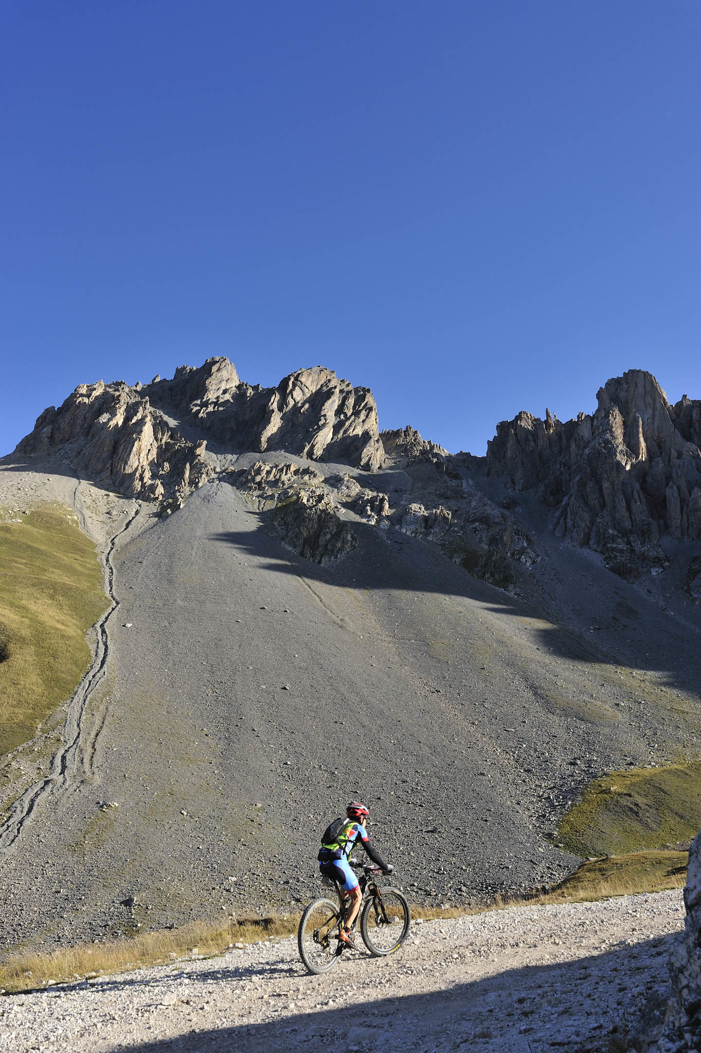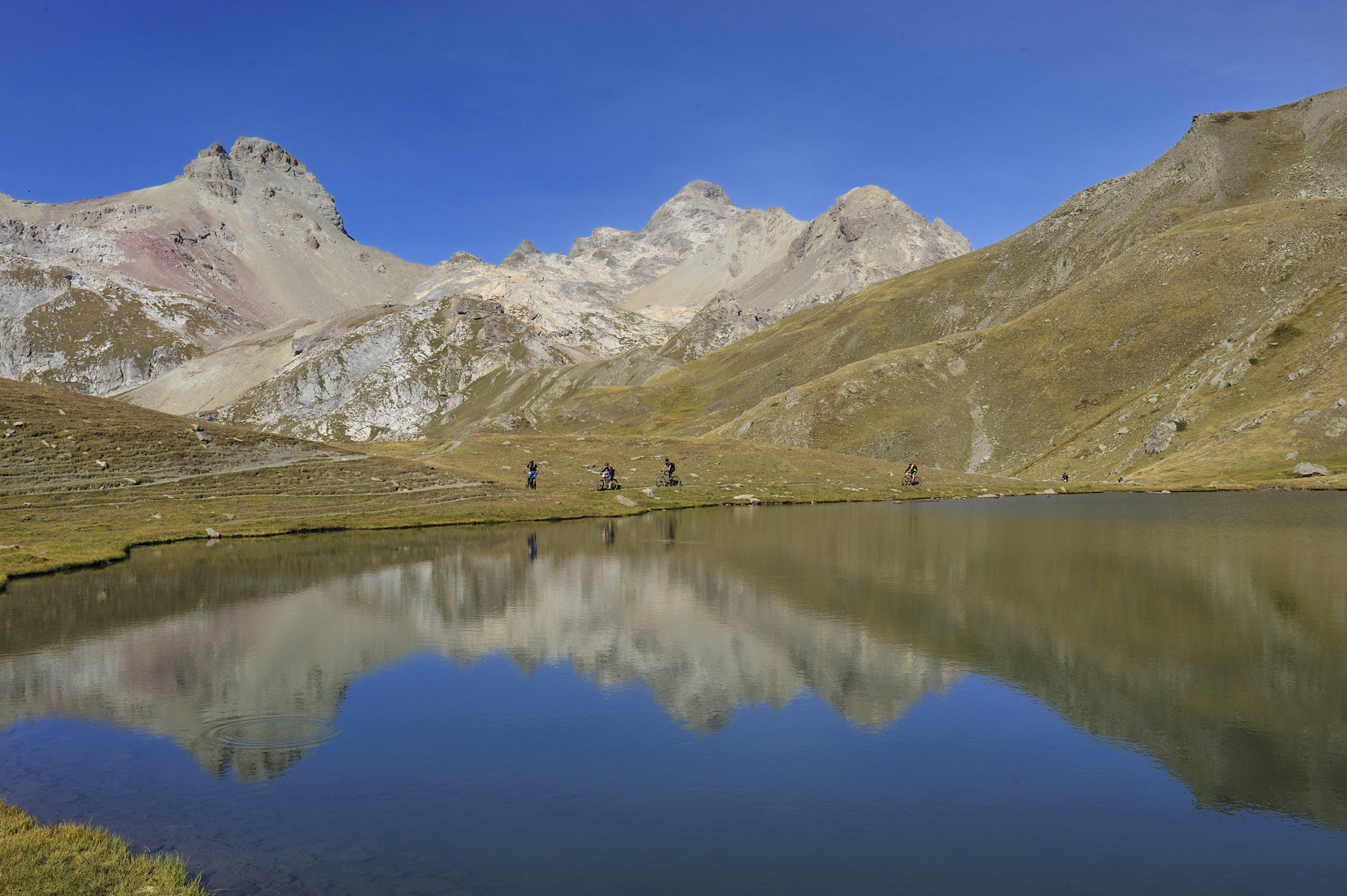 D’une piste, l’itinéraire se mue en sentier sillonnant les flancs des Tours de Notre-Dame et du Pic de la Ceinture. Il n’y a pas de vide à droite mais chaque biker doit placer la roue avant pour éviter le moindre faux pas qui pourrait vous faire basculer dans la ravine. Le 50 dents est mis à contribution : on force, on se hisse vers le lac des Cerces, à 2410 m.