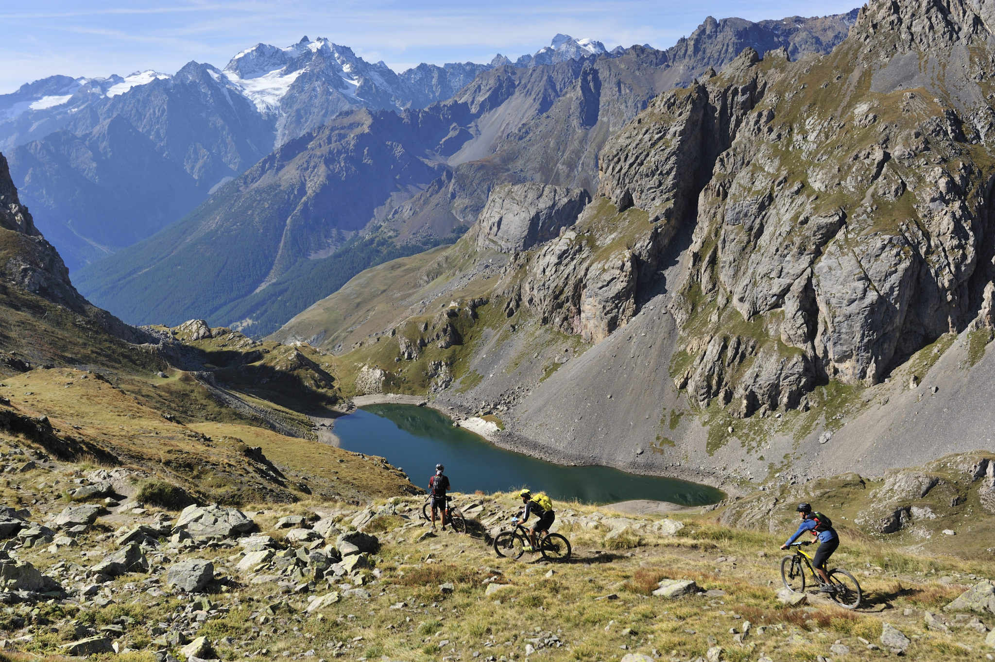 Au sommet, c’est le retour vers le plateau. Au col du Souchet, les rescapés basculent de l’autre côté, versant vallée de la Romanche. Plus loin, le lac Noir reflète avec fidélité les sommets. Face aux vététistes, la Meije, le Râteau ou le Pic Gaspard imposent leur verticalité.