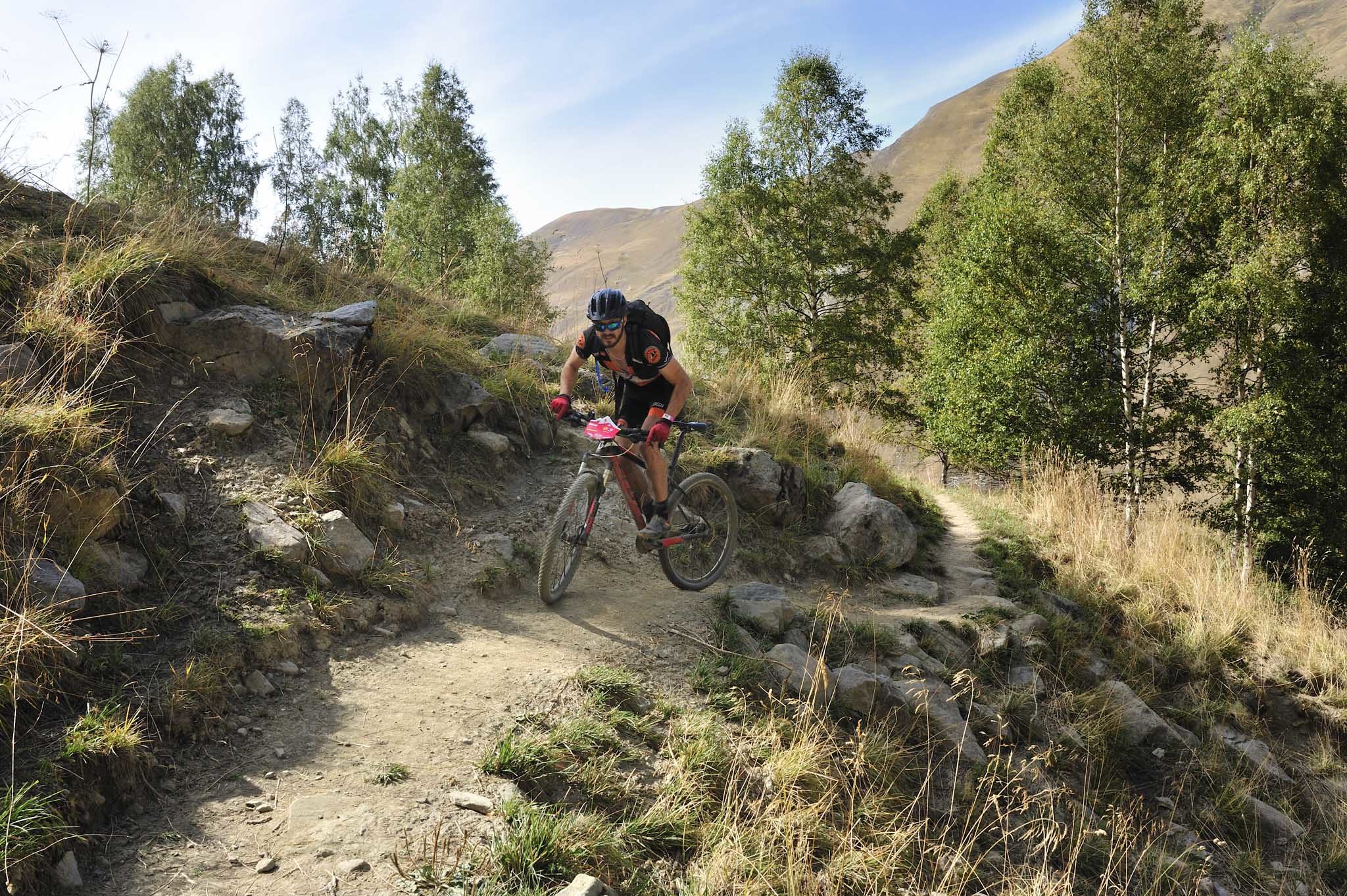 Le long du torrent du Rif, la trace devient même quelque fois enduro, avec marches et passages étroits. Les appuis et le basculement des masses du corps sont de mise afin d’éviter de se trouver planté dans une épingle.