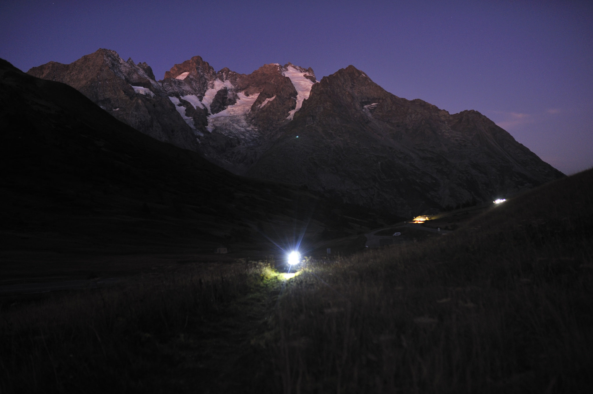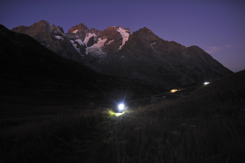 Dans le village encore endormi de Villar-d’Arêne, les concurrents se rassemblent et se postent sur la ligne de départ. 750 femmes et hommes font face à leur défi personnel, à ce raid hors norme : 117 km pour un cumul de dénivelé positif de 5300 m… A 6 heures, le départ est donné et la nuit est toujours d’encre. Les flancs sombres des montagnes happent les petits points lumineux qui se suivent en file indienne, à former une cordée que rien ne semble rompre.