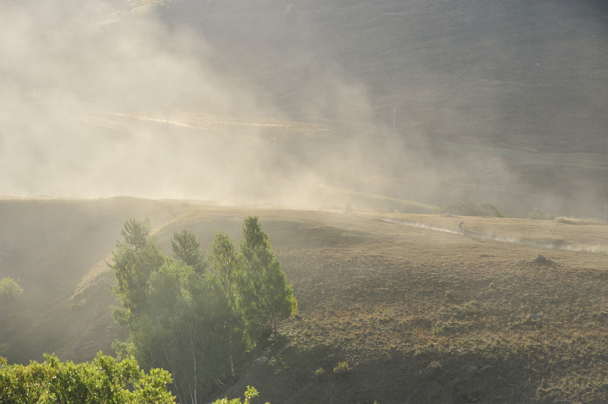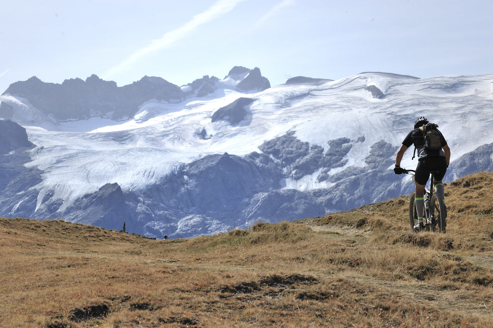 Le dimanche, le départ à La Grave est moins tonique que la veille : il faut y aller, chercher au bout de l’effort cette deuxième journée. Alors, on prend le cintre à pleine main et on tire dessus pour s’arracher vers les hauteurs du Chazelet. L’alpage porte encore les stigmates de la canicule de l’été. L’herbe est roussie et les raiders mordent la poussière dans la descente rapide vers le Rivet du Pied.