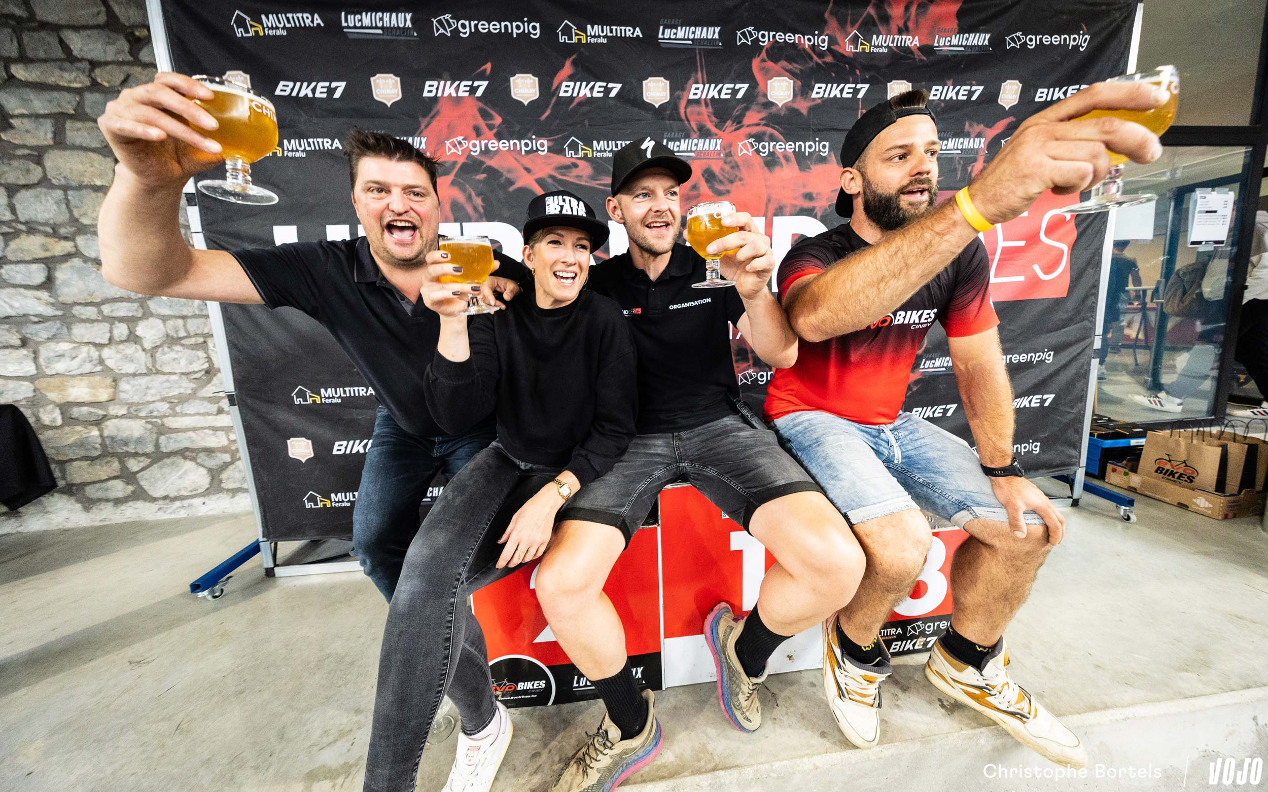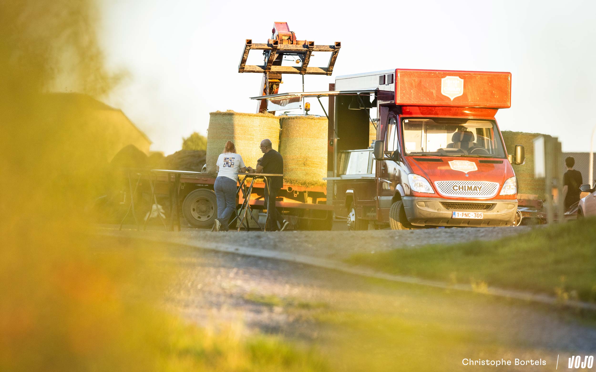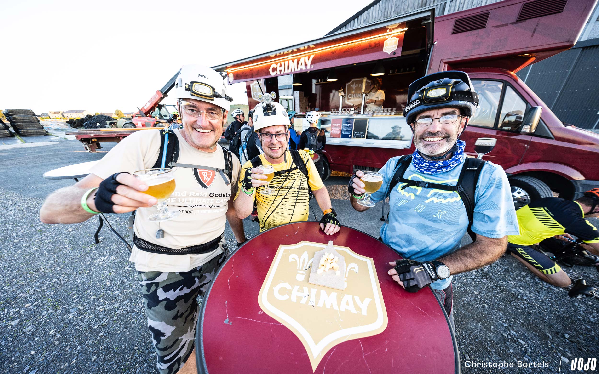 Après seulement 6 kilomètres, le camion Chimay attend les concurrents avec bière et fromage. Car oui, on ne l’a pas encore précisé, mais ce prologue est aussi une rando gourmande !