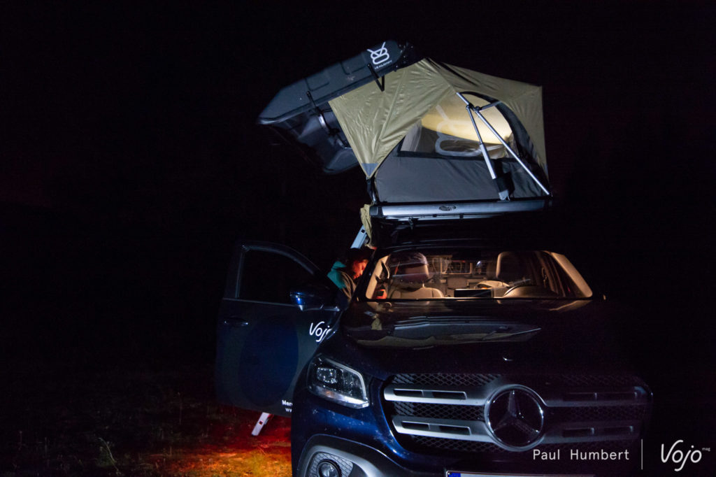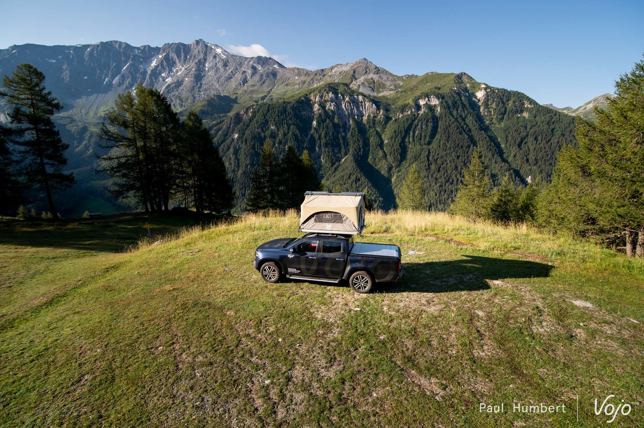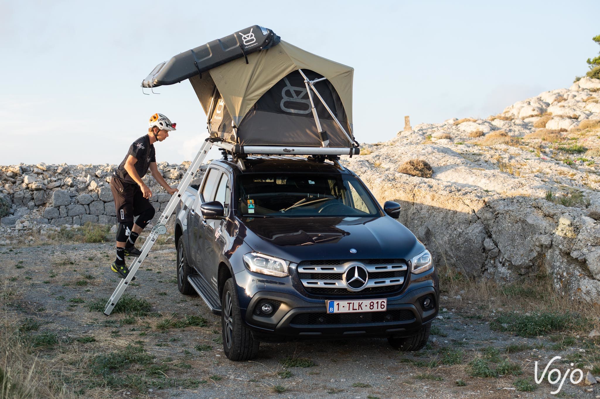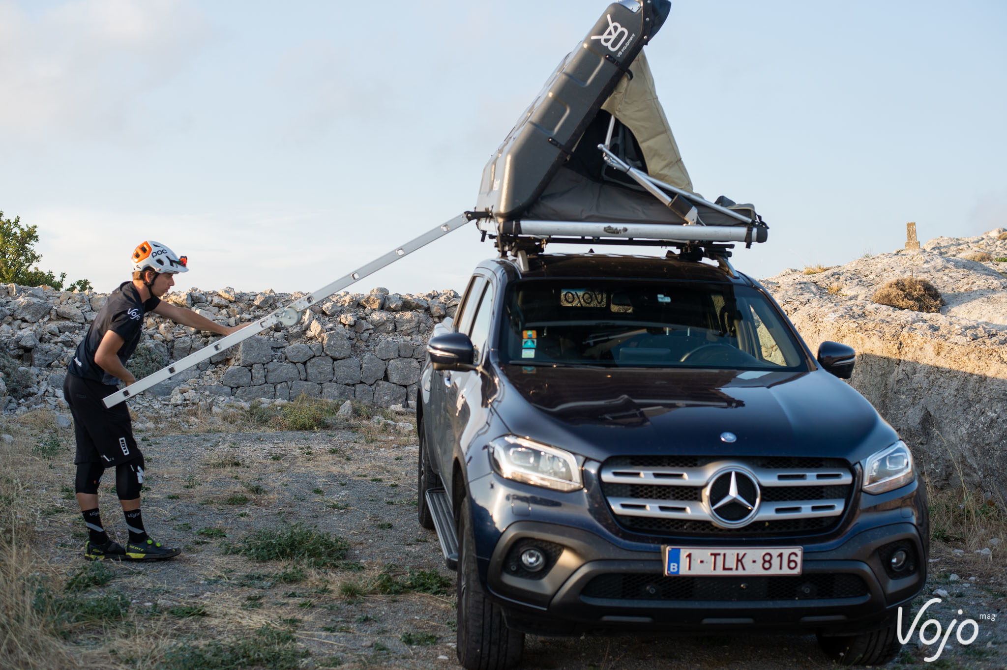 Cette tente est également une belle alternative aux vans, aménagés ou non, qui équipent bon nombre de nomades modernes. Moins chère et plus pratique, elle permet de conserver un véhicule propre et de se déplacer partout. L’inconvénient sera de trouver un endroit où la vision d’une tente dépliée ne gênera personne. L’isolation au bruit sera également moins bonne et il ne sera pas confortable de s’installer sur un parking en milieu urbain par exemple. Aucun souci pour nous. Installé sur notre Mercedes-Benz Classe X, l’ensemble est vraiment tout-terrain et nous avons pu accéder à des zones où la majorité des autres véhicules n’aventureront pas leurs roues.
