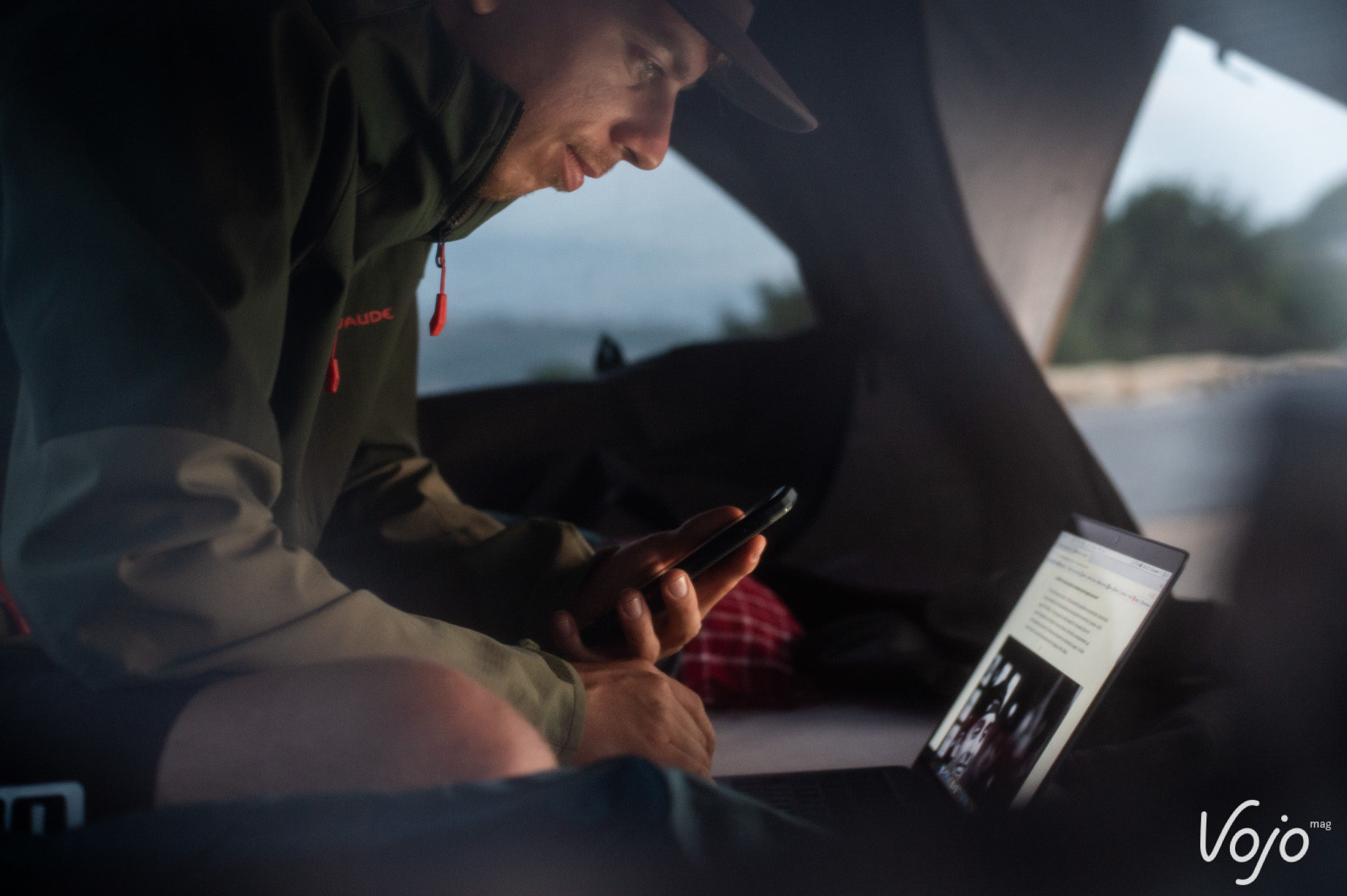 En bon nomade moderne, il est primordial pour nous de rester connecté pour continuer à travailler et à faire tourner vojomag.com. La technologie est bien faite et il s’est avéré très facile de combiner travail et plaisir. Un ordinateur, des batteries de secours et un téléphone connecté à internet permettent dans l’immense majorité des cas de faire tout ce qu’un travail de bureau impose.
