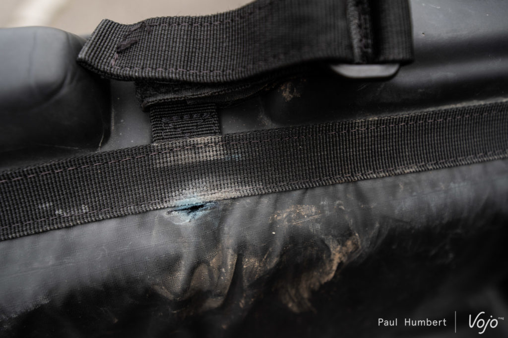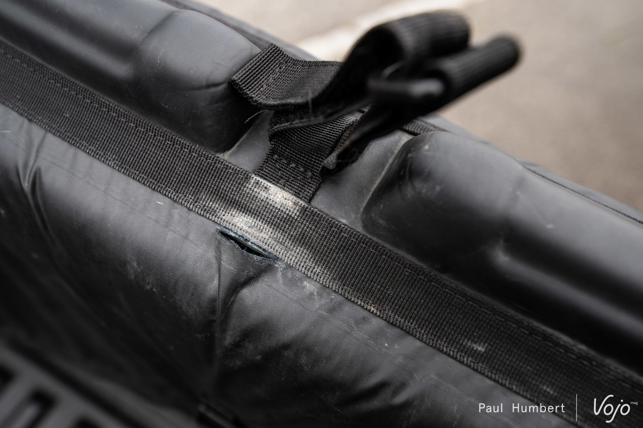 Après à peine 3 mois, de gros points noirs sont cependant mis en évidence et ION devra très clairement revoir sa copie. Alors qu’elles ne sont que peu sollicitées, une des trois sangles de fixation du pick up saver est à moitié arrachée, avec le revêtement de la protection.
