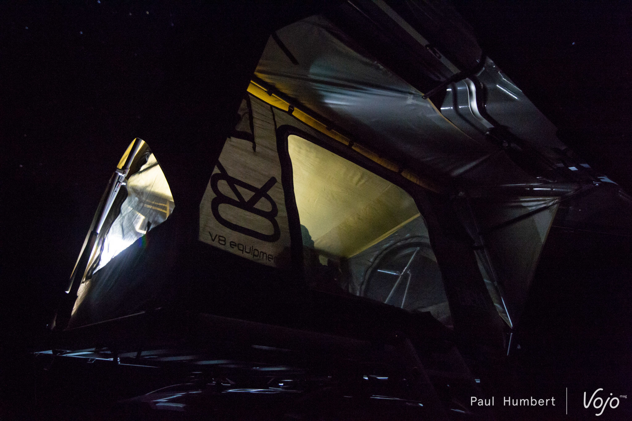 La tente V8 E.BEX.1, nous l’avons dépliée au bord de la mer comme à la montagne. Dans tous les cas, elle s’est révélée très confortable. Le matelas offre le confort d’un véritable lit. Le jour s’y fait une place au petit matin mais la luminosité n’empêche pas de continuer sa nuit. Il en va de même pour la chaleur qui n’a jamais été écrasante. Pour le froid, les nuits les plus fraîches ont été passées entre 5 et 10 degrés à la montagne et dans un bon duvet, tout s’est bien passé. V8 travaille d’ailleurs à la conception future d’une membrane thermique qui permettra une utilisation prolongée de la tente, à travers les saisons.