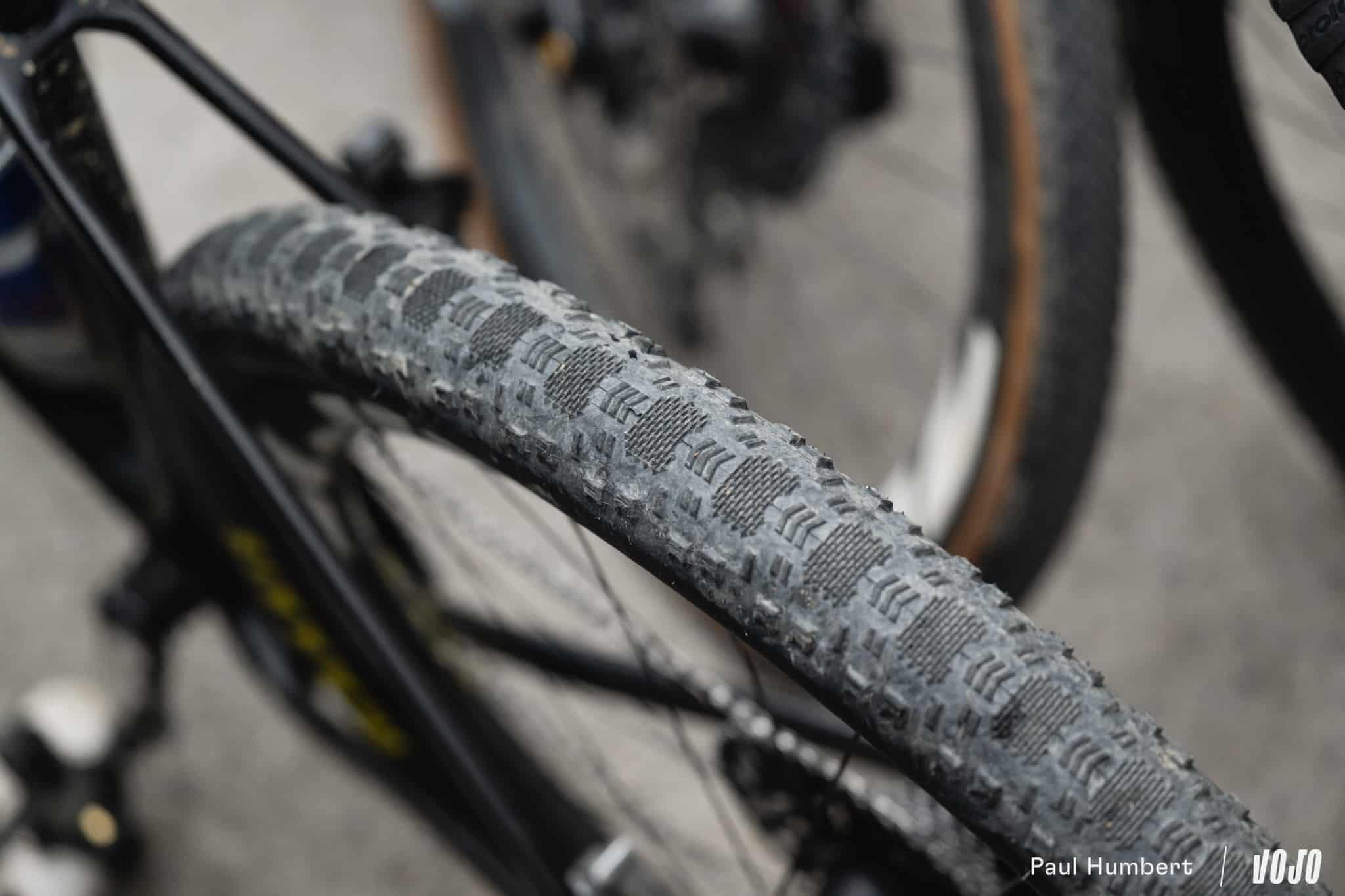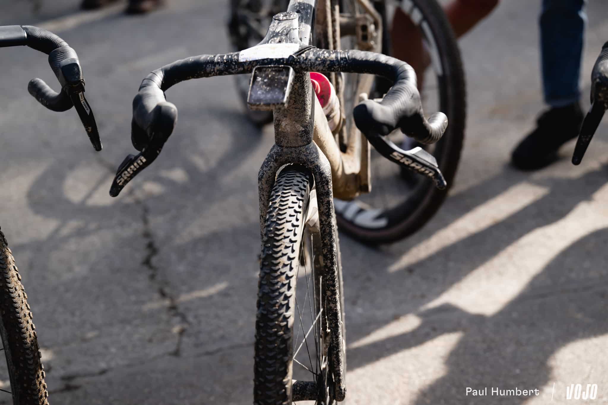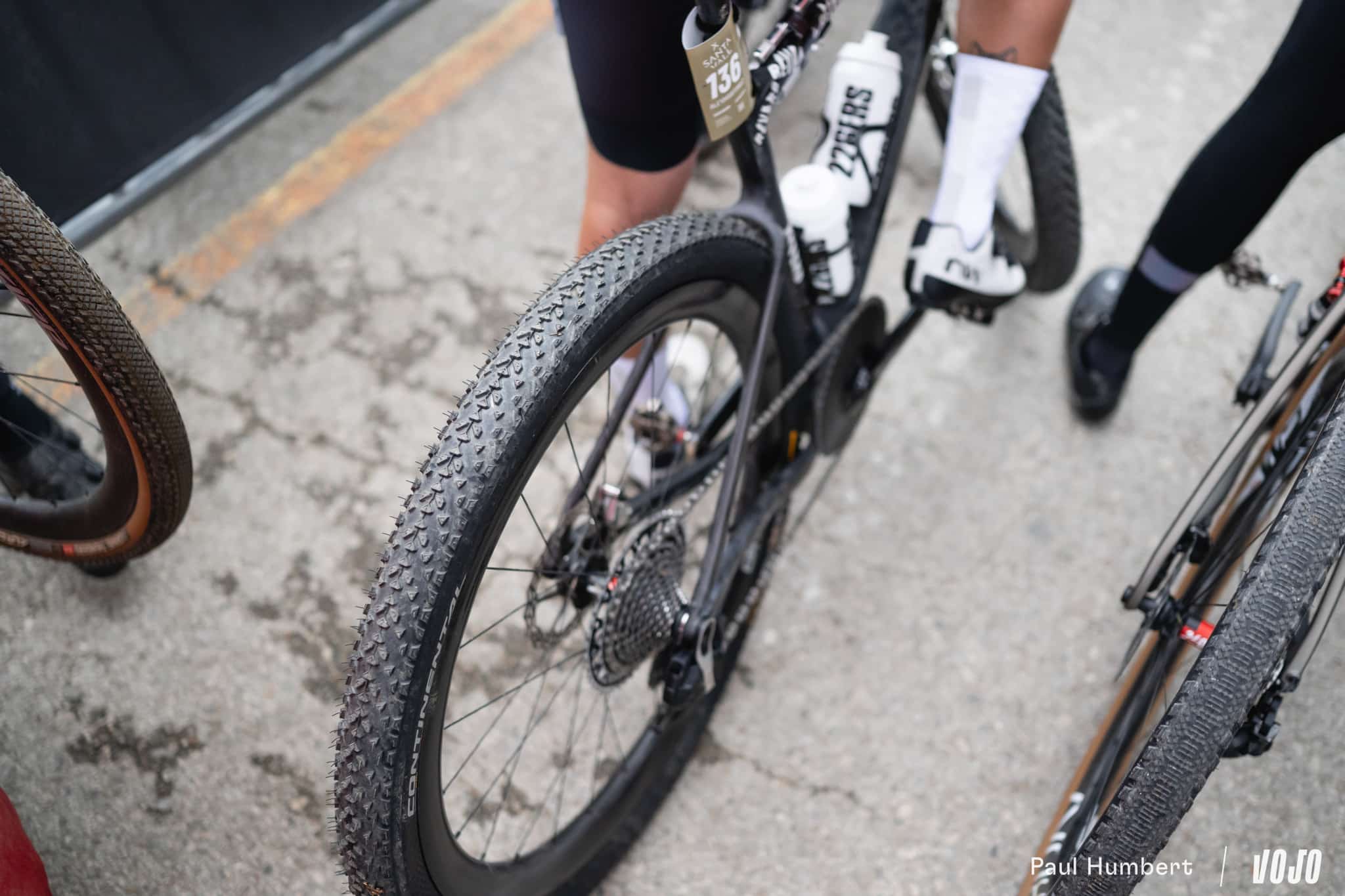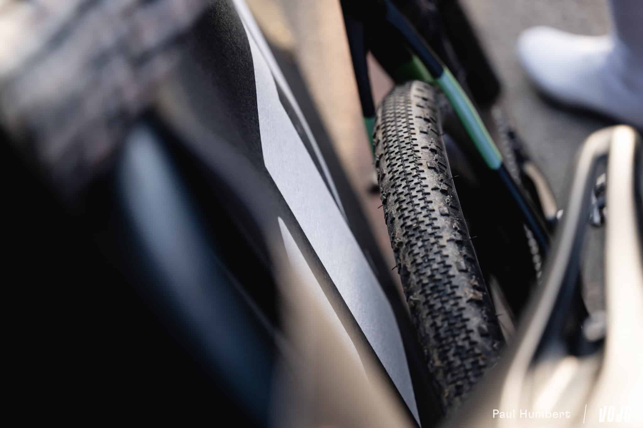 On observe également des Schwalbe Thunder Burt 2.10. Globalement, que ce soient des pneus de VTT ou de gravel, les profils sélectionnés sont très, très, très roulants, voire presque lisses. On devine que les coefficients de résistance au roulement sont scrutés par les coureurs. On constate également que la largeur du pneu importe peu sur le rendement du pneu, contrairement au cramponnage de ce dernier. Un pneu avec un gros volume aura tendance à absorber les aspérités du terrain au lieu d’être ralenti par les sols rugueux rencontrés en gravel.