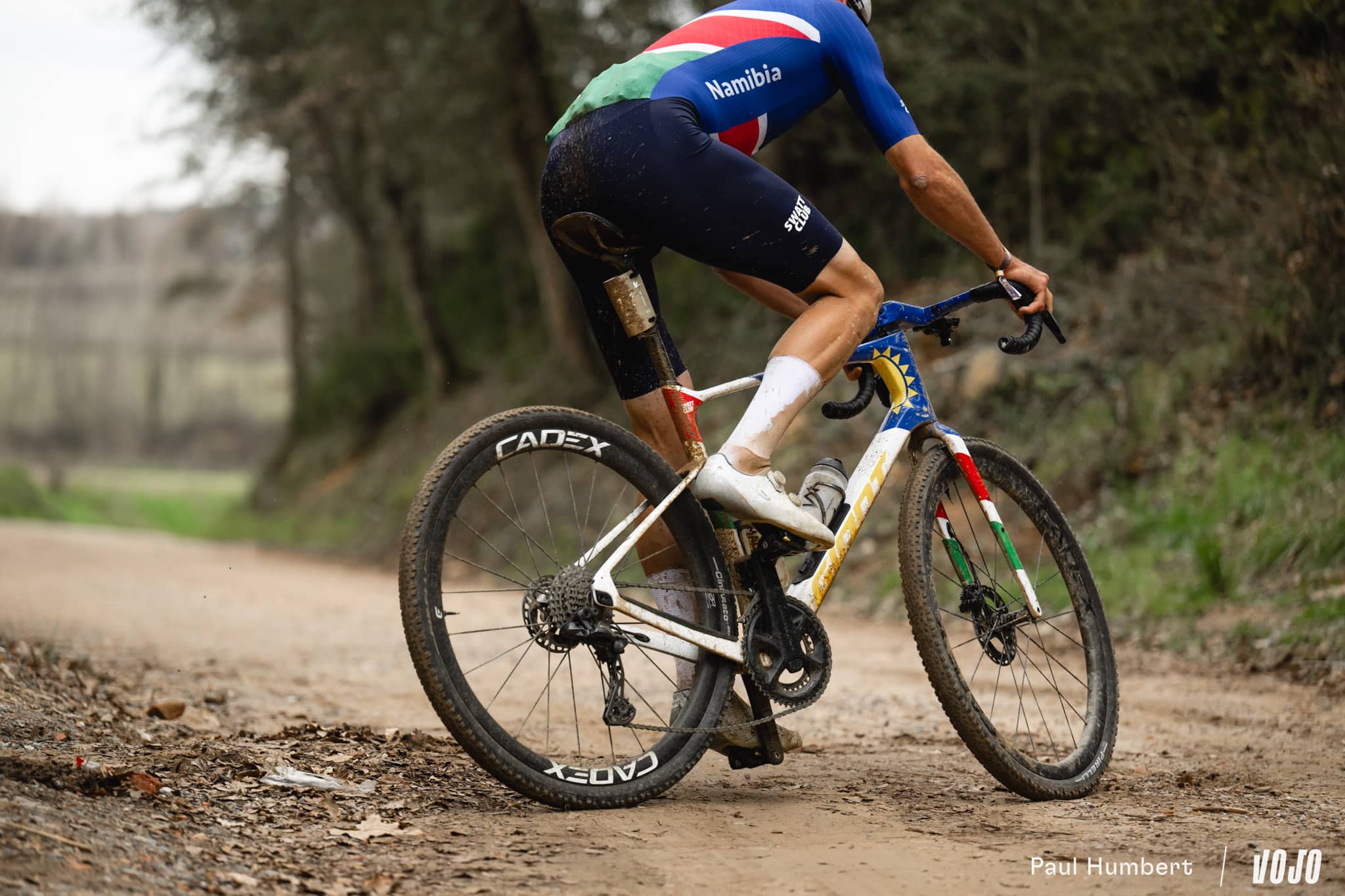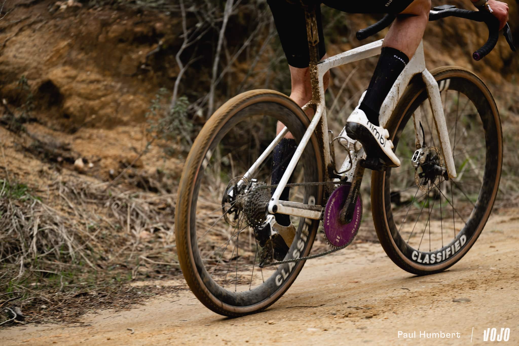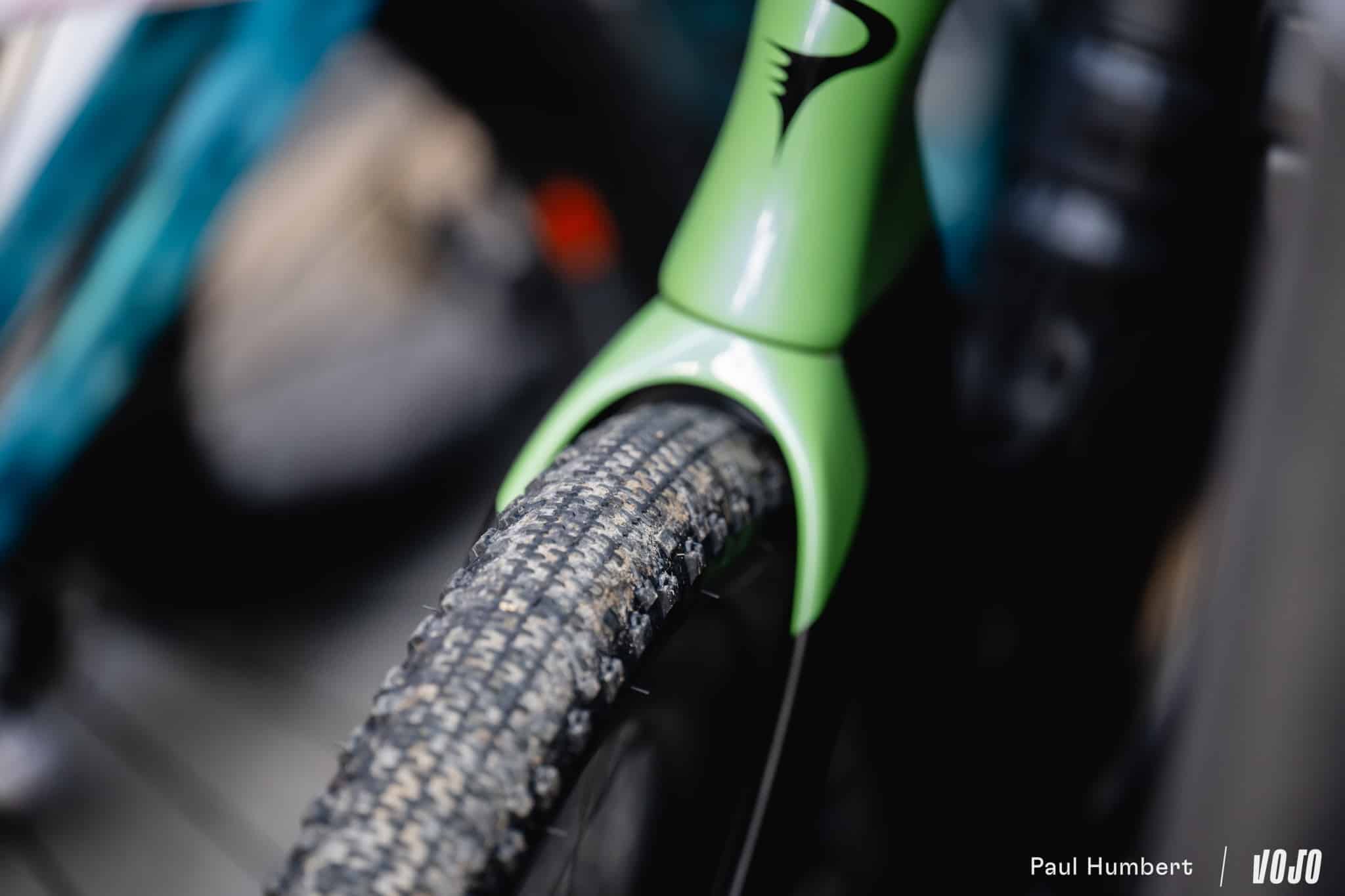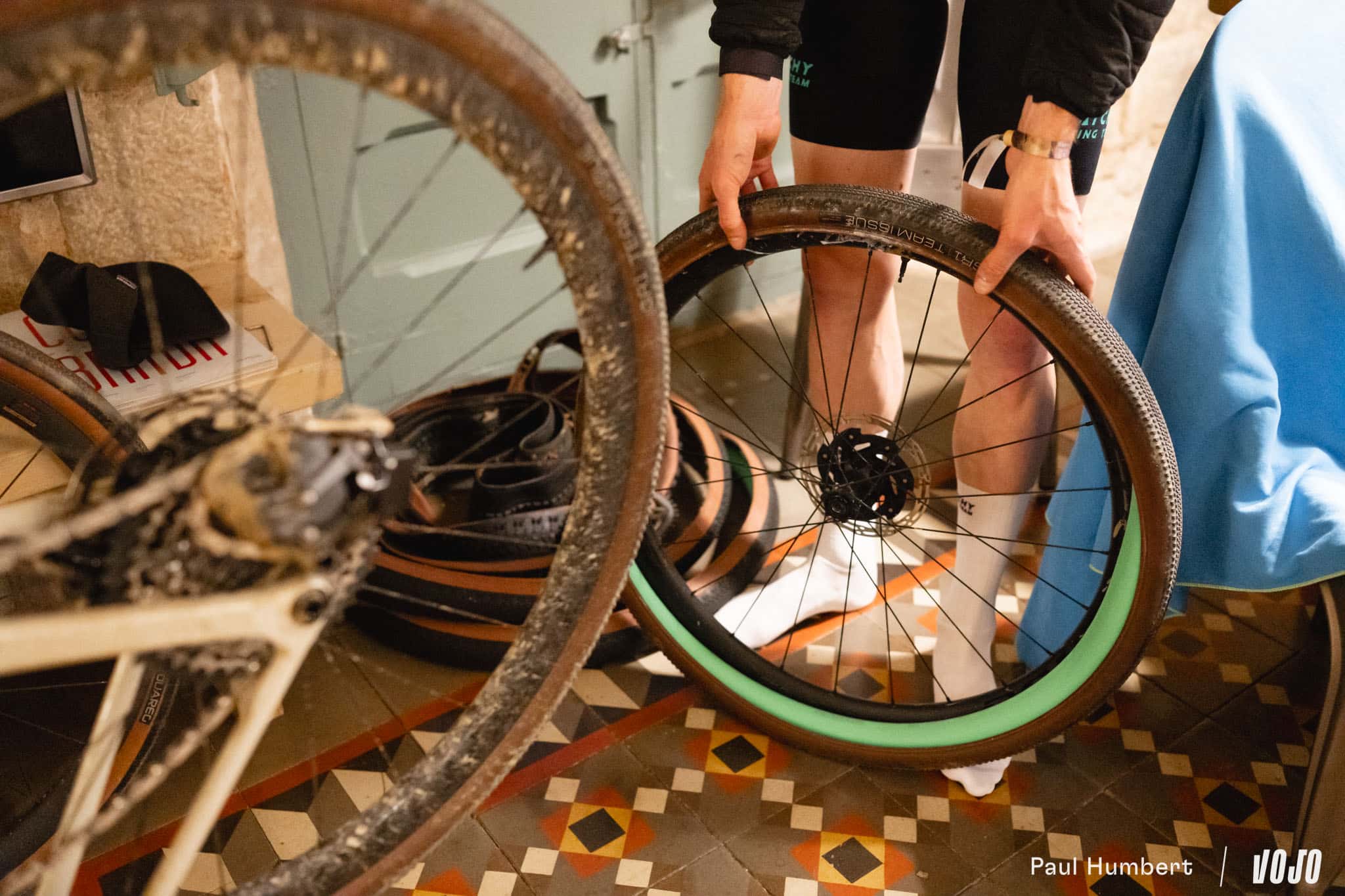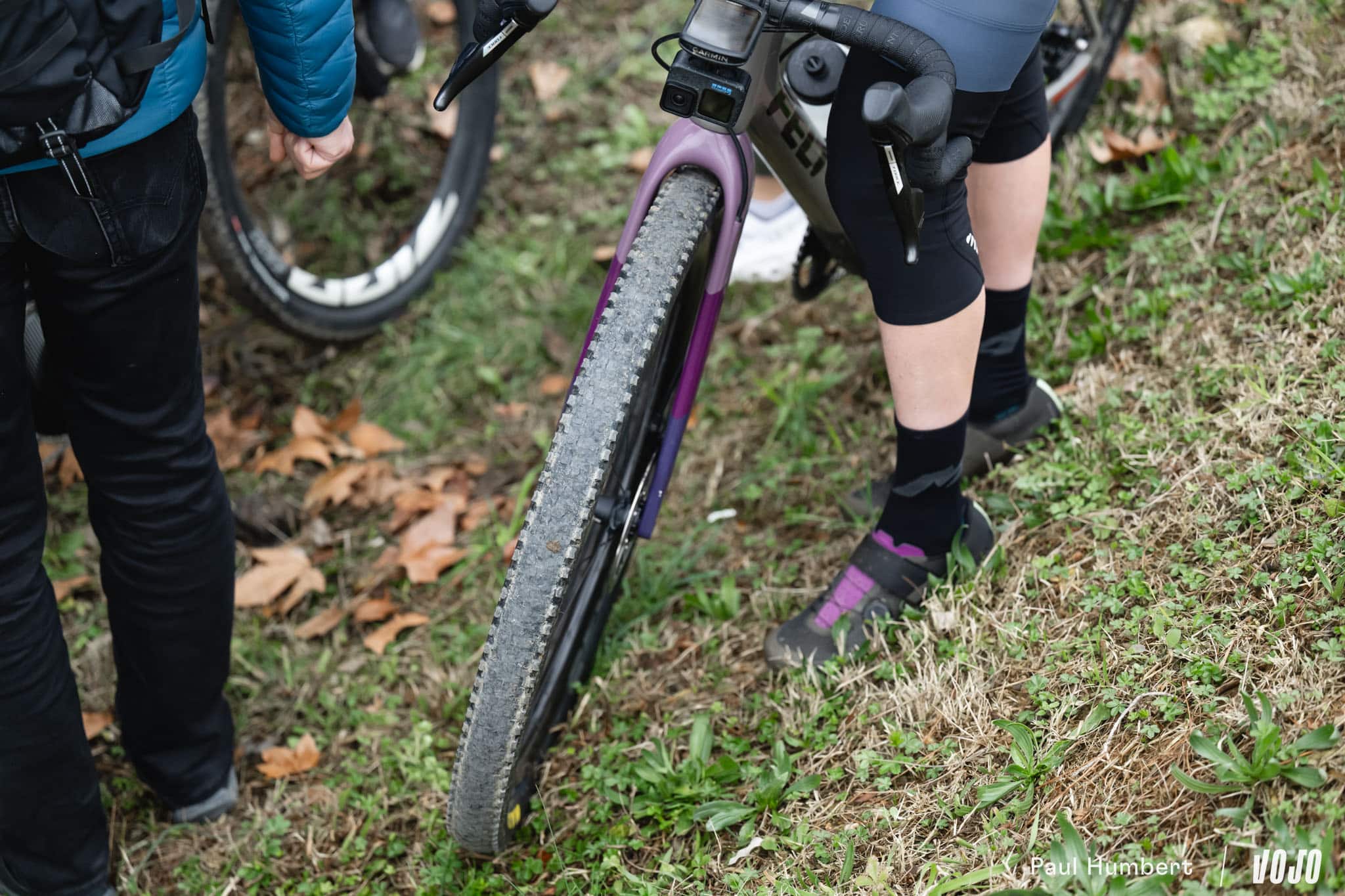 On observe également des Schwalbe Thunder Burt 2.10. Globalement, que ce soient des pneus de VTT ou de gravel, les profils sélectionnés sont très, très, très roulants, voire presque lisses. On devine que les coefficients de résistance au roulement sont scrutés par les coureurs. On constate également que la largeur du pneu importe peu sur le rendement du pneu, contrairement au cramponnage de ce dernier. Un pneu avec un gros volume aura tendance à absorber les aspérités du terrain au lieu d’être ralenti par les sols rugueux rencontrés en gravel.