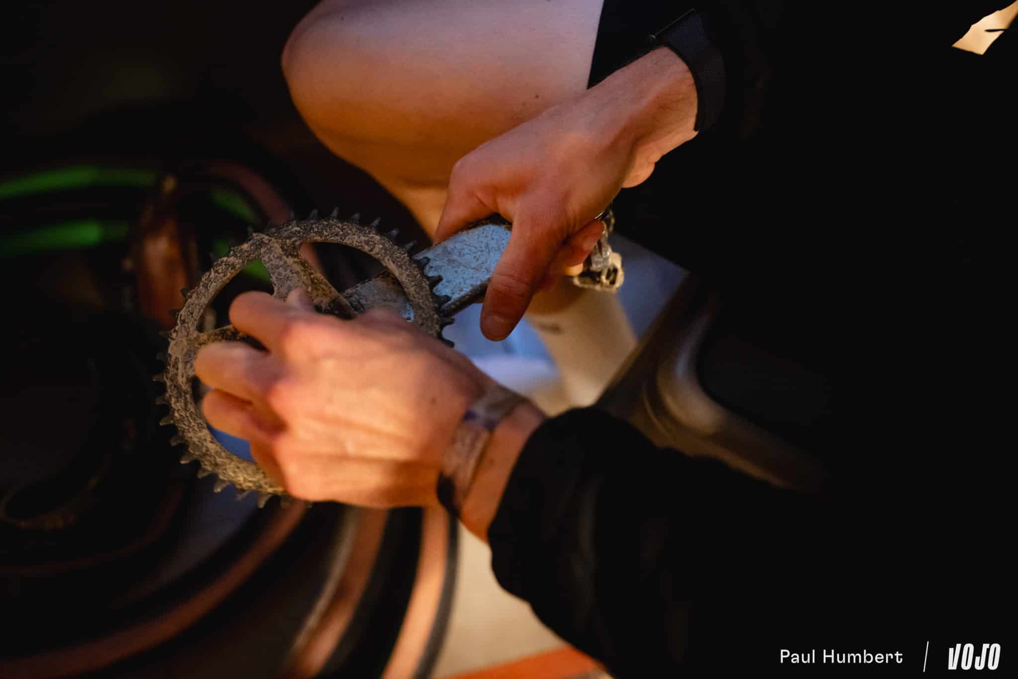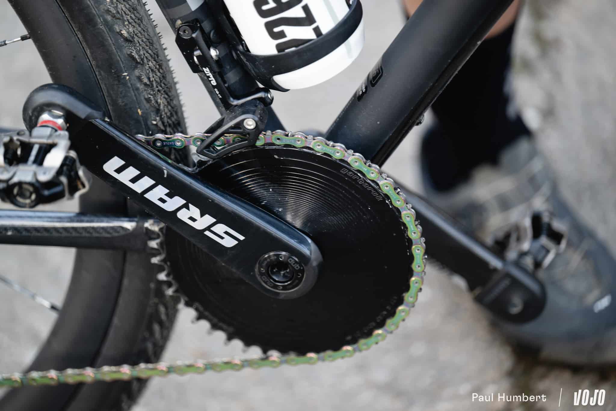 Pour ce qui est des concurrents en mono-plateau, nous sommes loin des plateaux de 40 ou 42 dents vendus habituellement en première monte. Nous pouvons observer des plateaux de 44, 46, 48 et même 50 dents! Effectivement, il est parfois dur de réaliser que les premiers bouclent ces épreuves à des vitesses moyennes supérieures à 33 km/h. Il est donc primordial d’avoir un braquet assez imposant pour avoir une bonne ligne de chaîne et surtout pour pouvoir suivre sur les portions les plus rapides. Il est bon de préciser que la quasi totalité des coureurs utilisent un capteur de puissance, soit dans le pédalier, soit dans les pédales.
