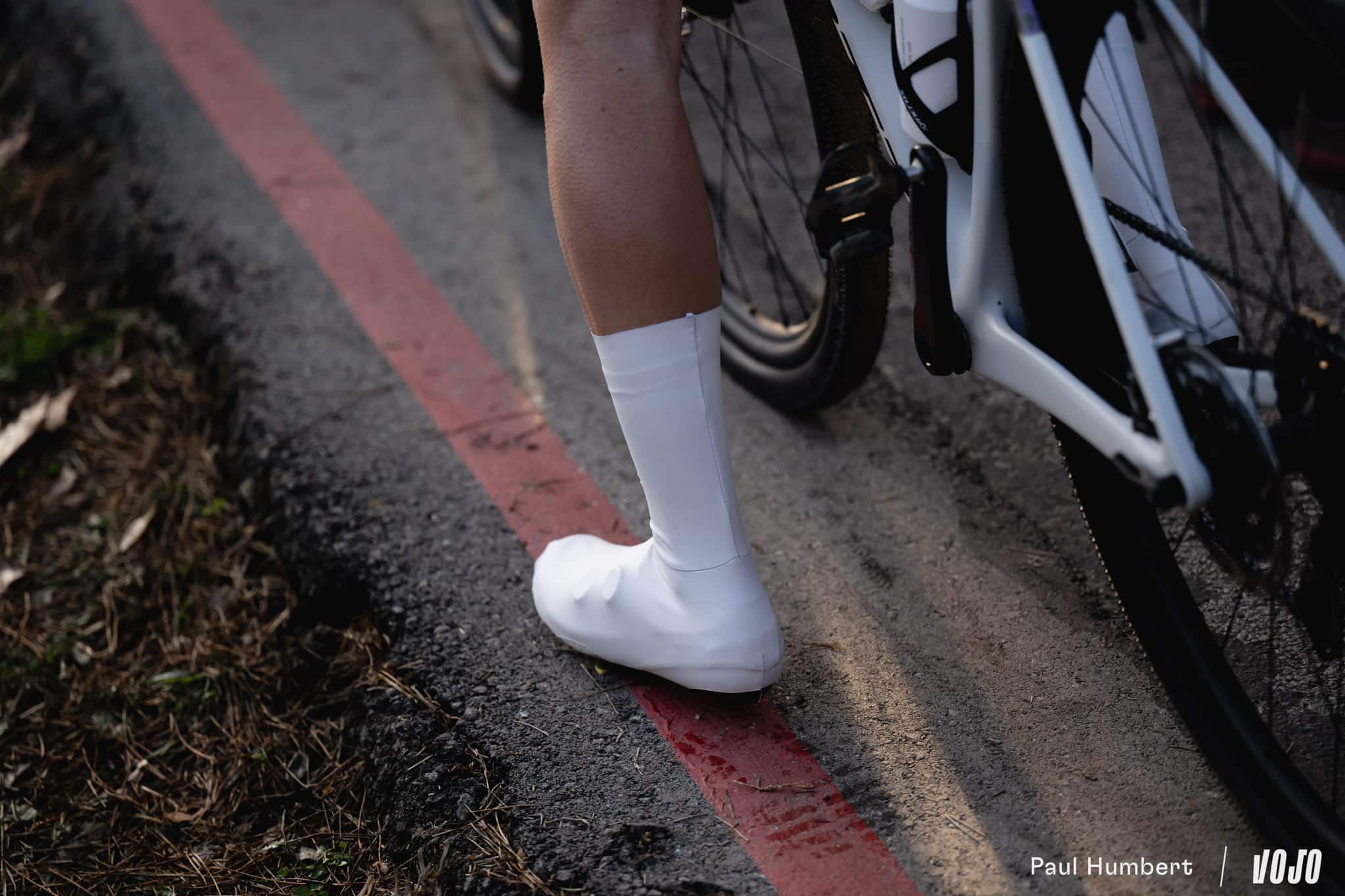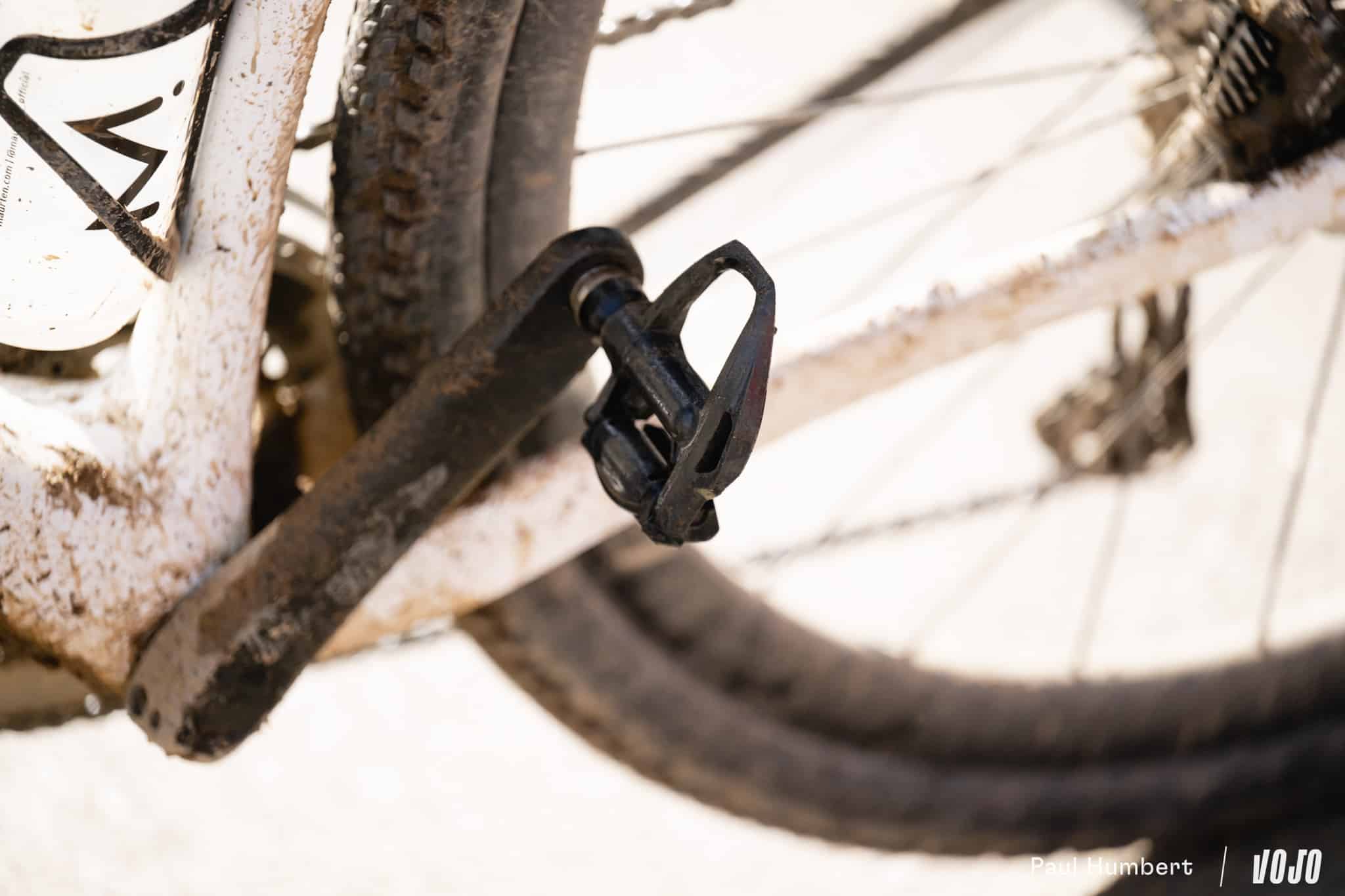 Il est toujours amusant d’essayer de deviner de quelle discipline arrive chaque coureur, en analysant uniquement leur matériel. En l’occurrence, pour les pratiquants venant du vélo de route, c’est assez aisé : la plupart préfèrent garder des pédales de route. Cela peut paraître surprenant de prime abord mais en y repensant, il n’y a pas ou quasiment pas de section à pied sur de tels parcours. Un cramponnage de la semelle n’est donc pas primordial. Ensuite, c’est plus une question d’habitude, avec également une plus grande surface d’appui, un stack un peu réduit et un meilleur aéro.