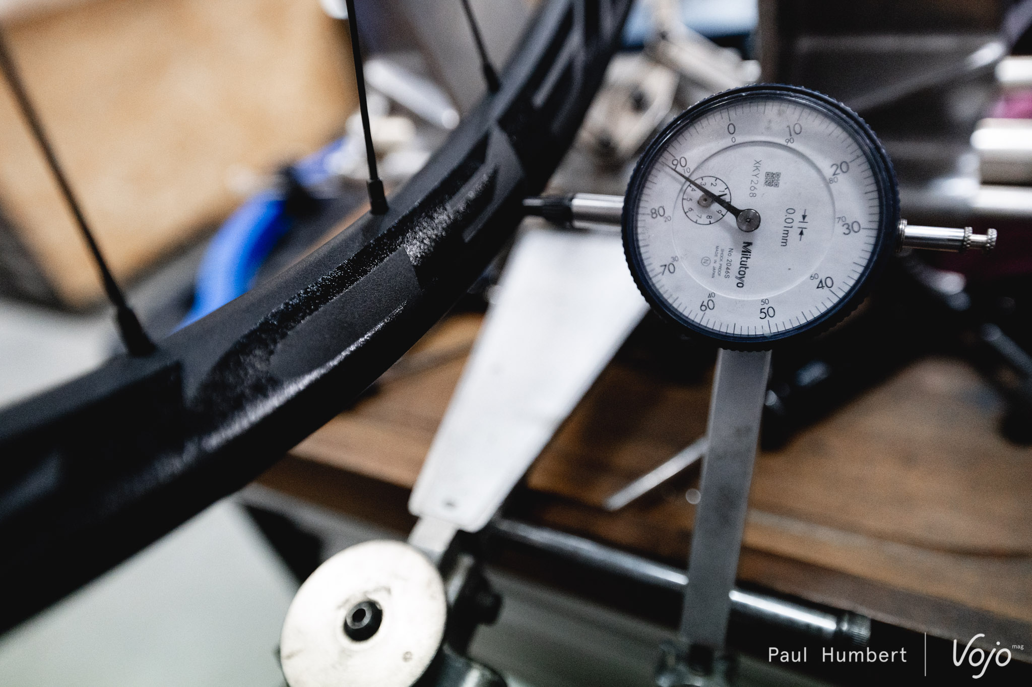On mesure ensuite le léger voile qui affiche 0,5mm en l’état. C’est correct, mais Benoît nous annonce ne pas laisser sortir de roue avec un voile supérieur à 0,2mm. On mesure également un décentrement de 1mm côté disque.