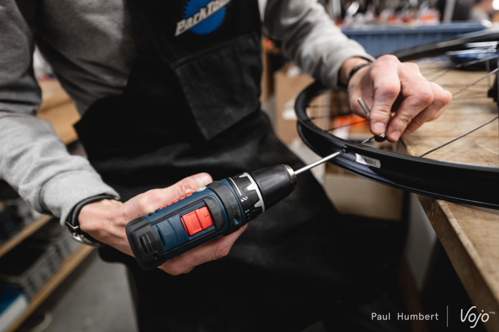 Le montage commence. Il n’y a pas de manière « académique » de monter une roue, mais Benoît a ses habitudes et commence toujours avec un repère par rapport à la valve.