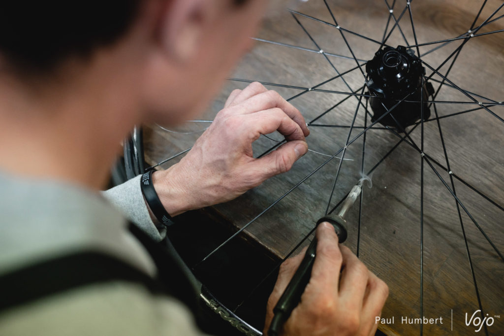 Après un contrôle des évolutions, un nouveau cycle reprend, deux fois, trois fois, jusqu’à arriver à une roue avec un centrage adéquat, sans voile ni saut, et qui ne bouge pas.