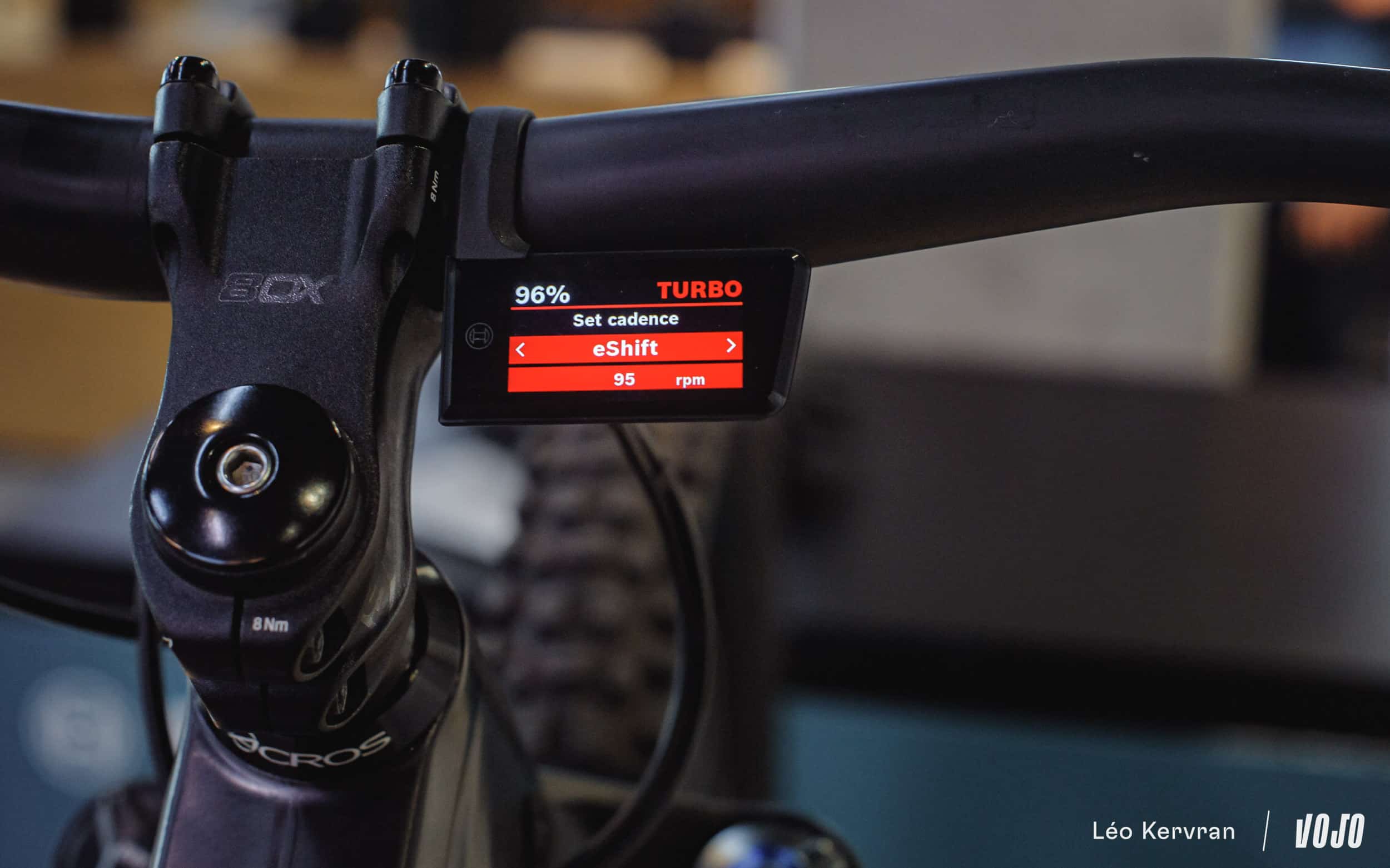 Comme chez ses deux concurrents, l’eShift est réglable et la voie choisie par Bosch est pile entre Sram et Shimano : plus variée et précise que le premier mais moins pointue et plus facile d’accès que le second. Ici, on règle sa cadence cible au choix entre 40 et 120 rpm par pas de 5 rpm (ce qui donne 17 réglages possibles) et en avant !