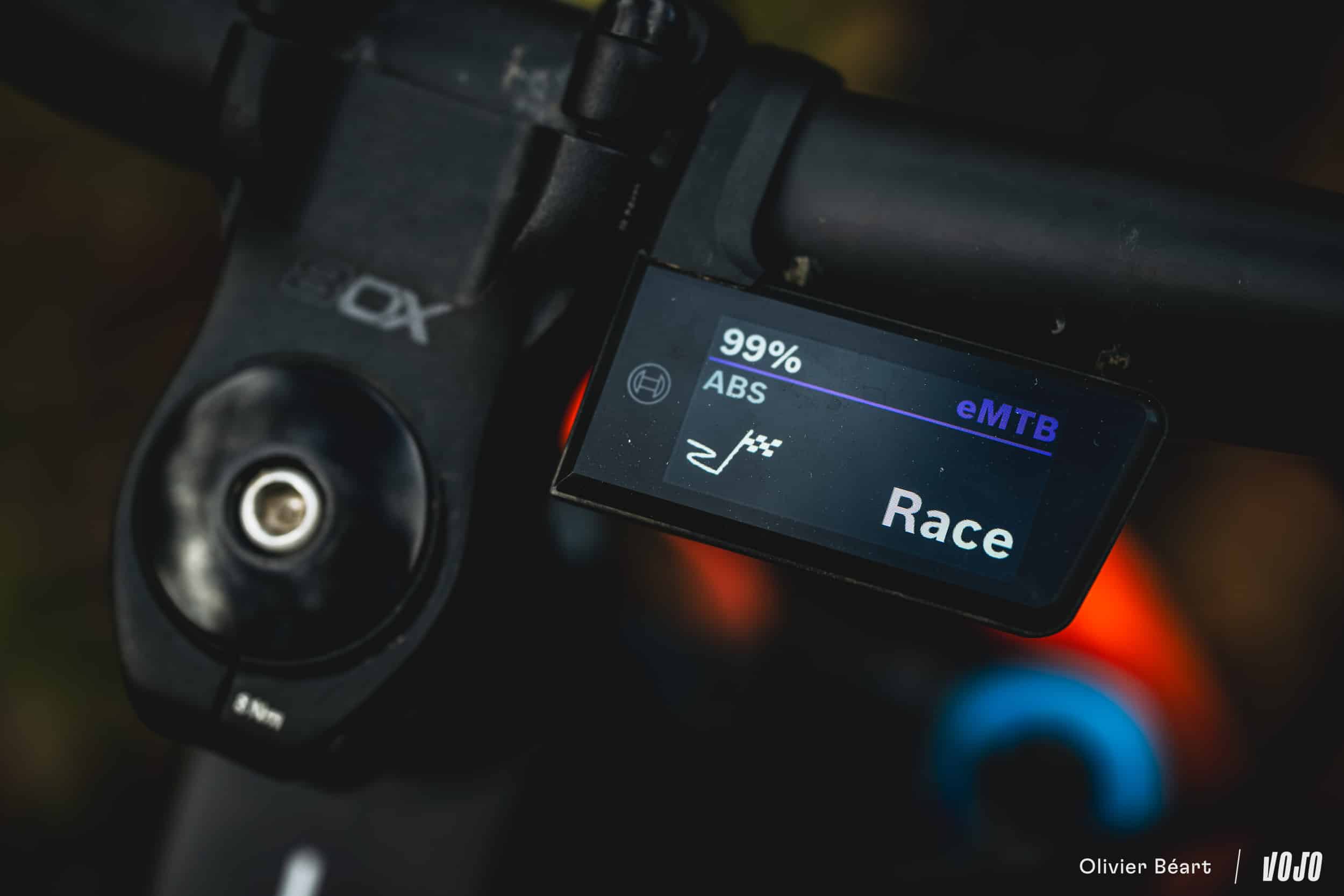 Ce mode performance, le voici ! Il est arrivé en même temps que la 5e génération du moteur Bosch Performance CX et, s’il repose sur les mêmes composants que l’ABS classique (le gros boîtier de régulation sur la fourche et un capteur sur chaque disque de frein), l’ABS Pro en est bien différent en pratique. Son objectif est simplement de limiter le risque « d’over-braking » à la prise des freins, c’est-à-dire une attaque un peu trop violente qui ferait décrocher brièvement la roue avant au plus mauvais moment, lorsqu’on a le plus de vitesse et d’énergie. On peut choisir entre deux modes de fonctionnement, Trail Pro qui se veut polyvalent mais déjà bien plus discret que le Trail de l’ABS classique, et Race dont l’intervention est vraiment réduite au strict minimum.