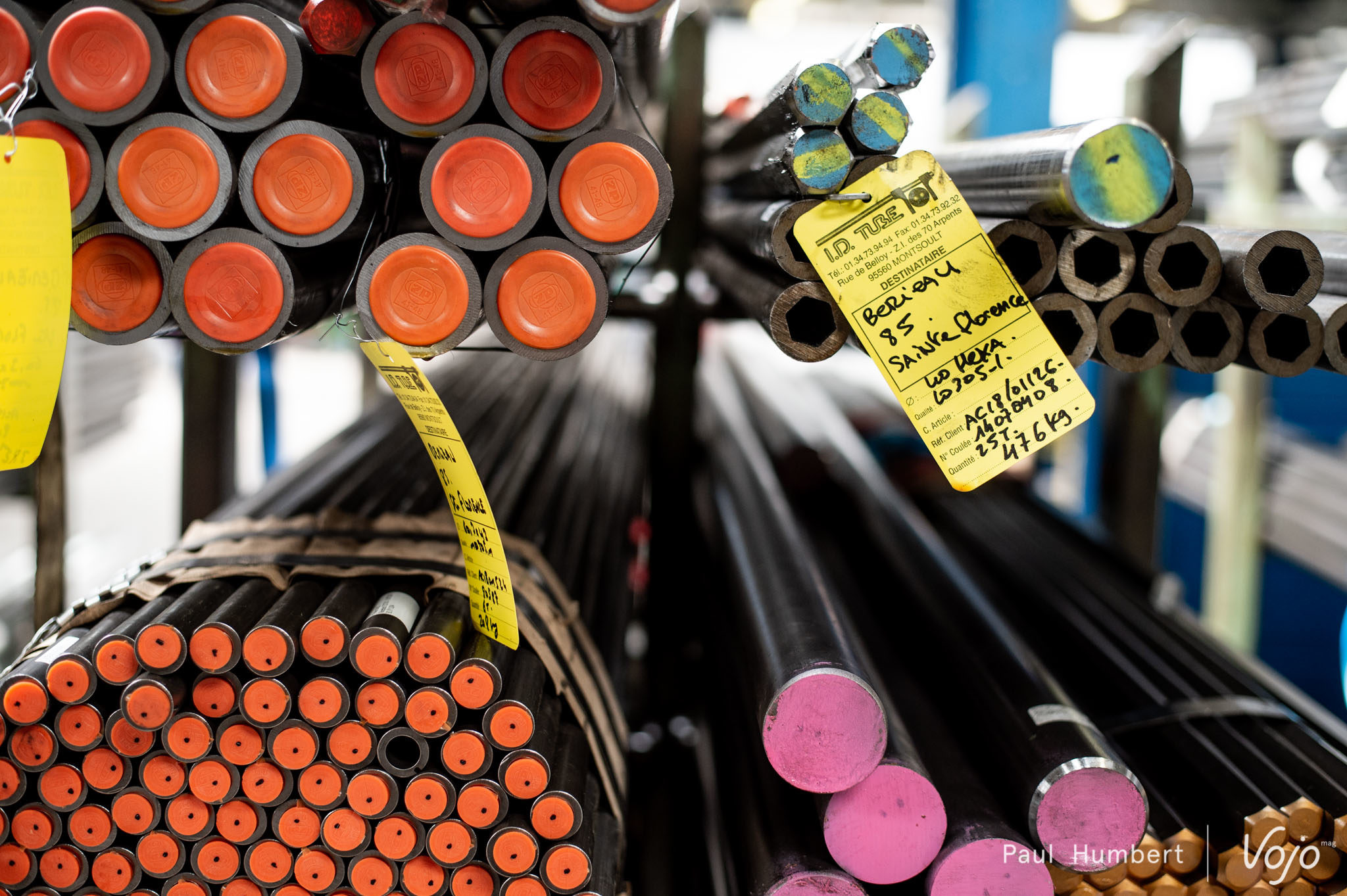 On déambule ensuite devant la zone de stockage des matériaux : aluminium, acier, titane, cuivre… On retrouve des barres de grandes et de petites sections, prêtes pour des opérations de décolletage ou d’usinage.