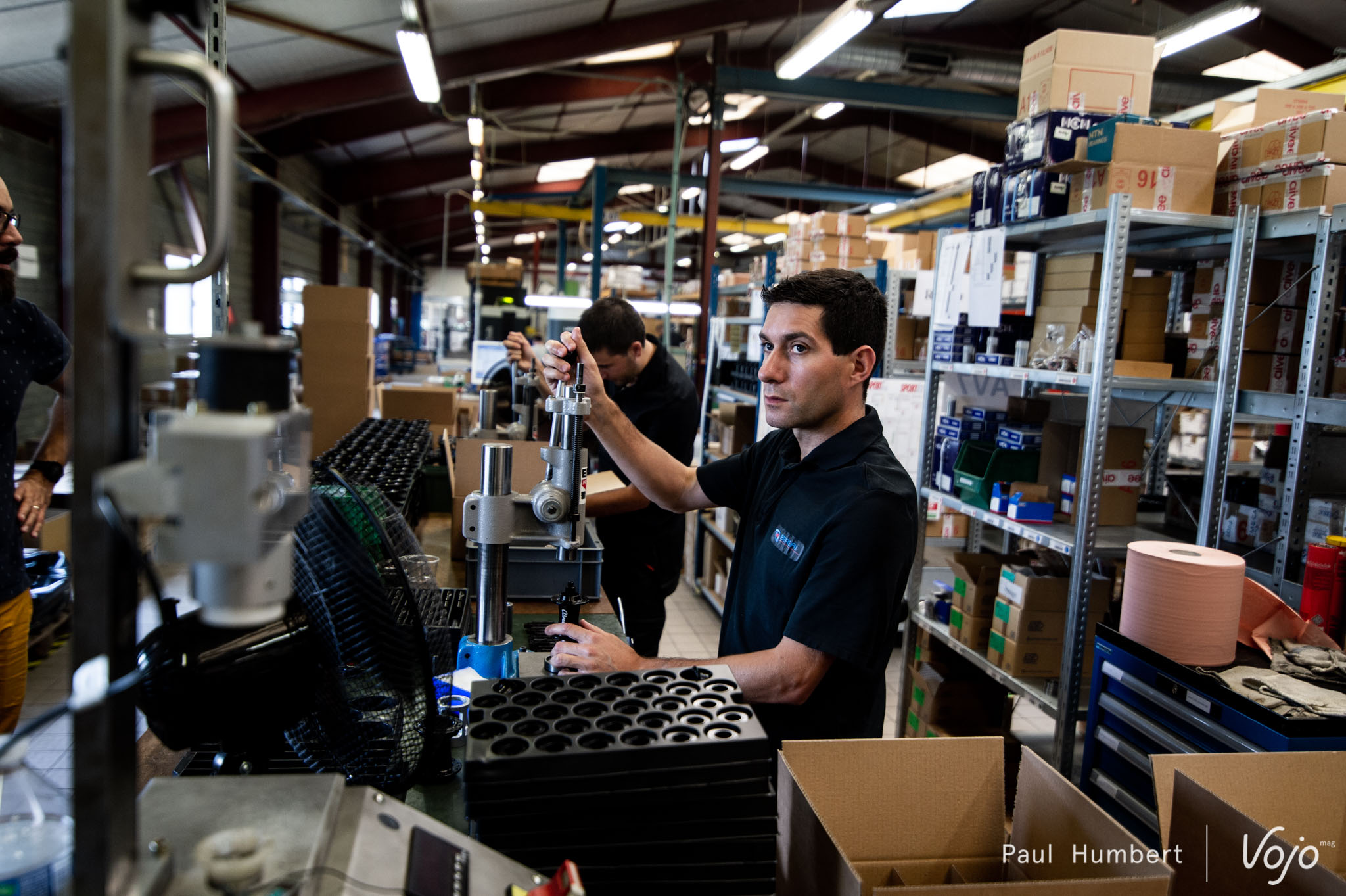 Conçus, anodisés puis marqués, ils sont ensuite assemblés à l’étage de l’atelier. On retrouve deux monteurs au milieu d’un stock de pièces Aivee. La petite bulle « vélo » au coeur de la grosse machine. Sur les rayons, on retrouve donc toutes les pièces qui composeront le coeur de nos roues. On pourrait sourire en pensant qu’Aivee n’est qu’une simple distraction pour les passionnés de vélos à la tête de Fidemeca-Bérieau, mais Aivee compte maintenant parmi les 6 premiers « clients » de l’entreprise, et quand on voit avec quels produits ces petits moyeux sont en concurrence, on prend vite les choses plus au sérieux.