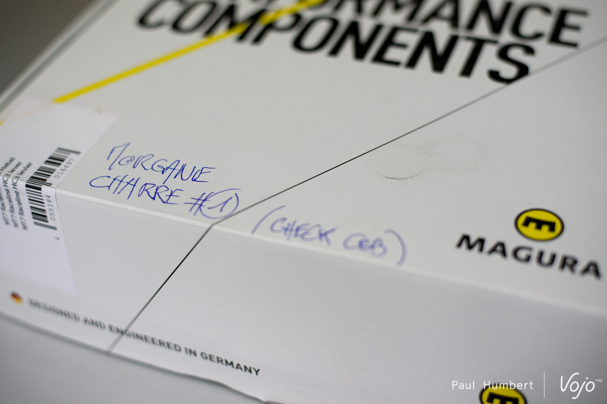 Sur une des premières tables en rentrant, on repère la boite de freins destinée à Morgane Charre. L’ambassadrice Bergamont est déjà là et son vélo de descente attend justement son nouvel équipement.