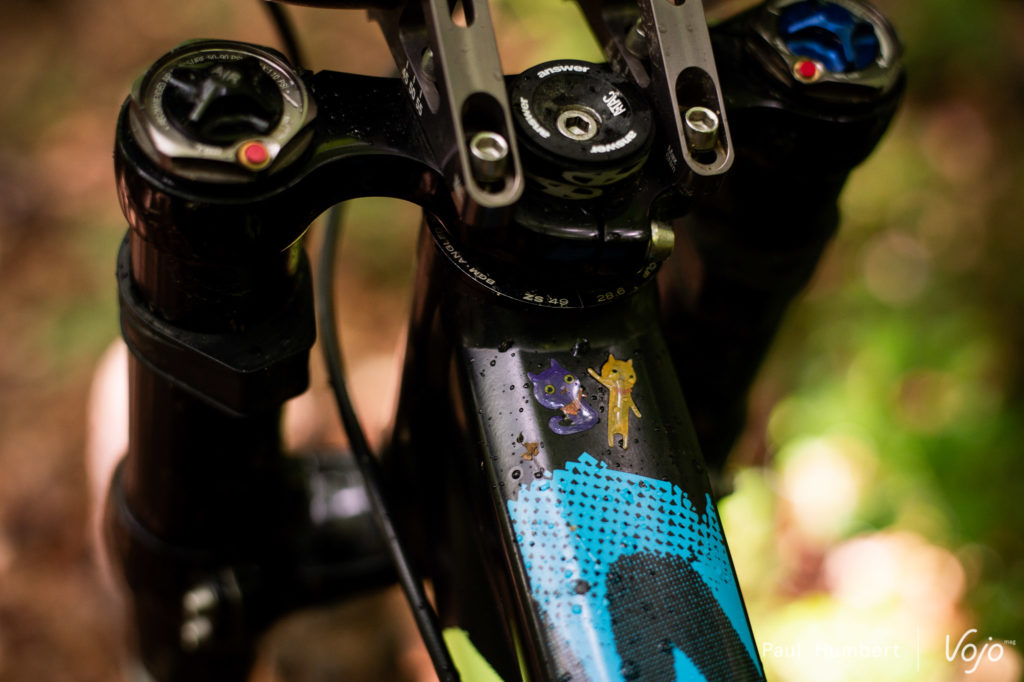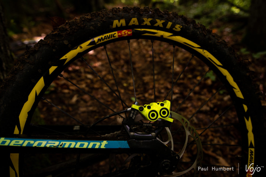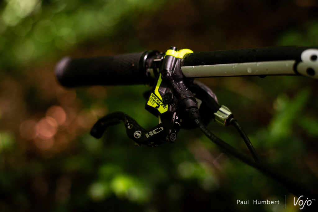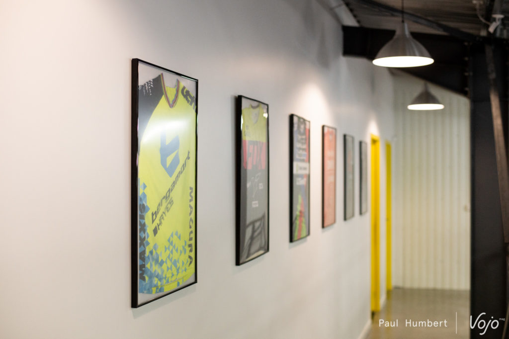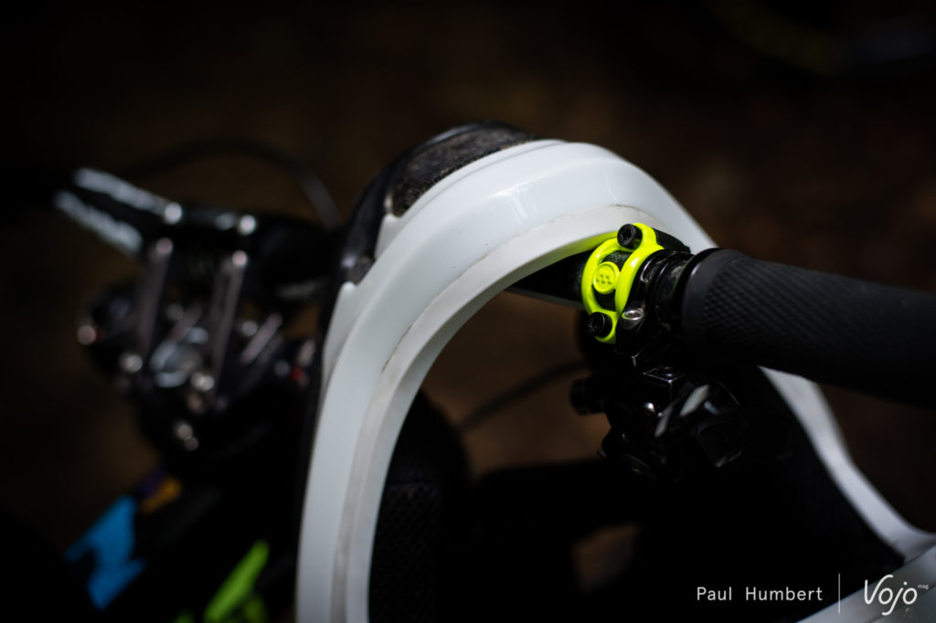 Le frein 4 pistons est mis en avant par la marque pour sa puissance et il équipe les vélos de la championne du Monde 2012. La marque compte plusieurs autres pilotes sponsorisés et on retrouve quelques maillots dans les allées du local. Pendant les Crankworx, nous découvrions également la modification apportée par Loïc Bruni à son levier de frein : https://dev.vojomag.com/loic-bruni-lexigence-au-bout-des-doigts/.
