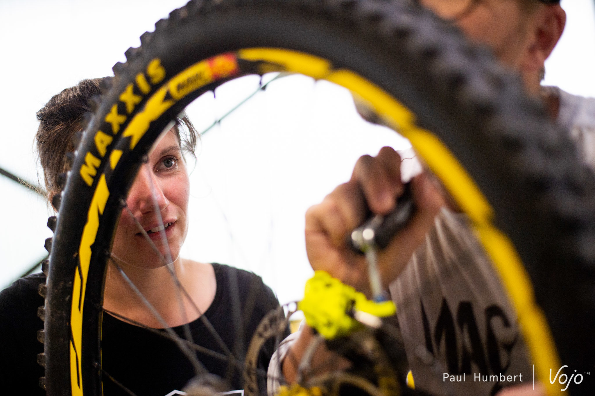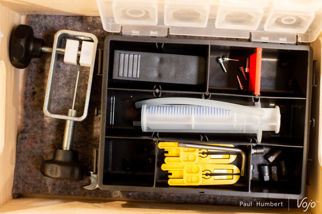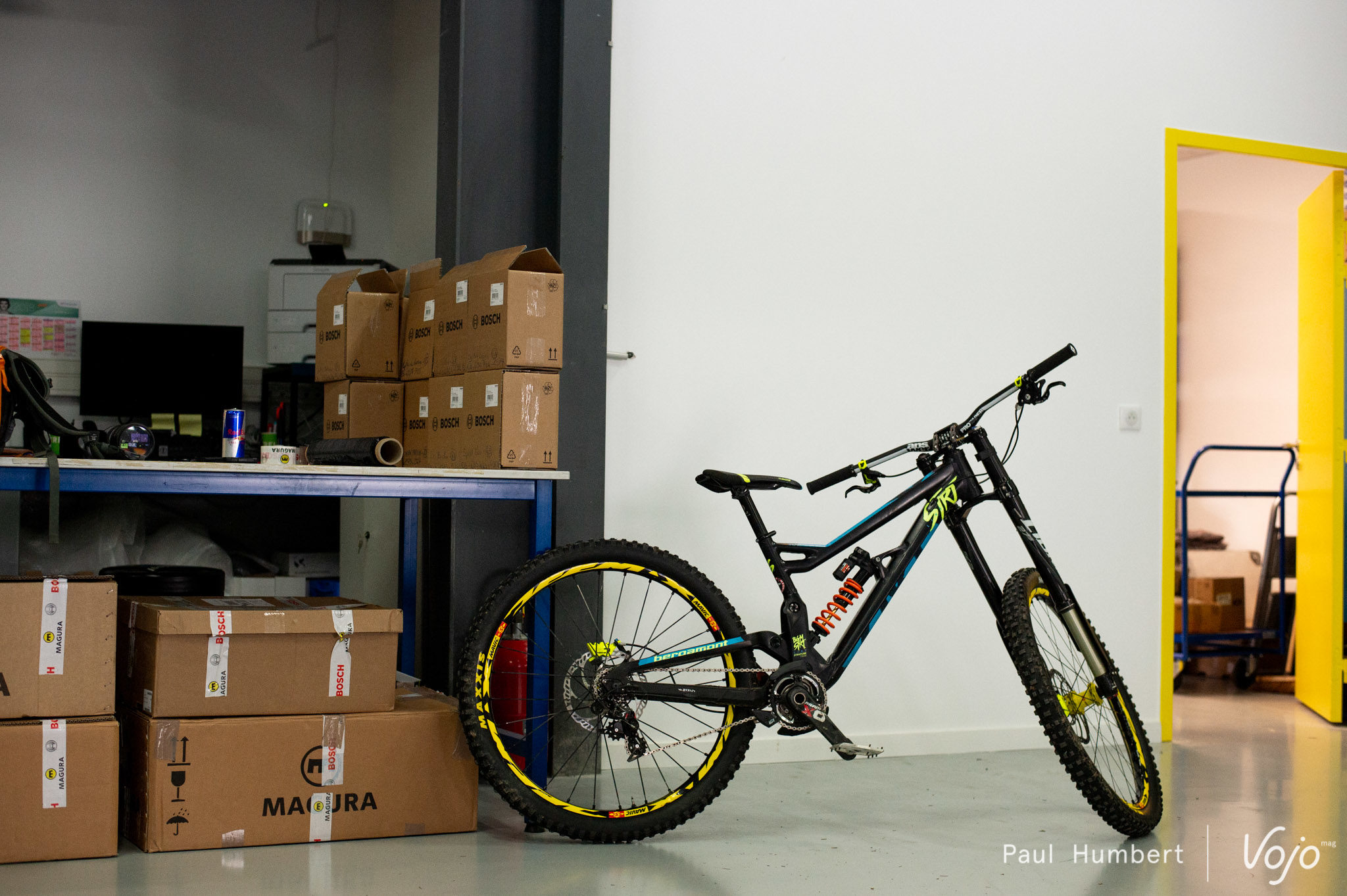 Sur une des premières tables en rentrant, on repère la boite de freins destinée à Morgane Charre. L’ambassadrice Bergamont est déjà là et son vélo de descente attend justement son nouvel équipement.