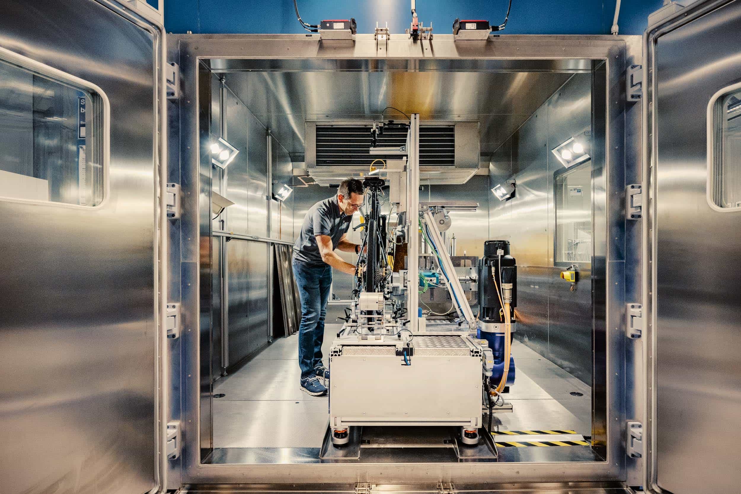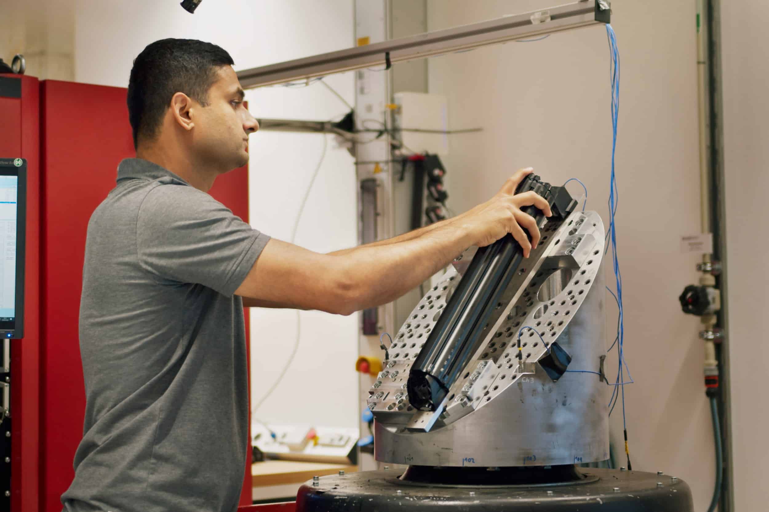 Dans la salle d’à côté, les batteries sont soumises à des vibrations dans diverses positions pour simuler un transport : à 45° comme si elle était dans le tube diagonal d’un vélo, à l’horizontal comme sur une palette… La sécurité, encore et toujours.