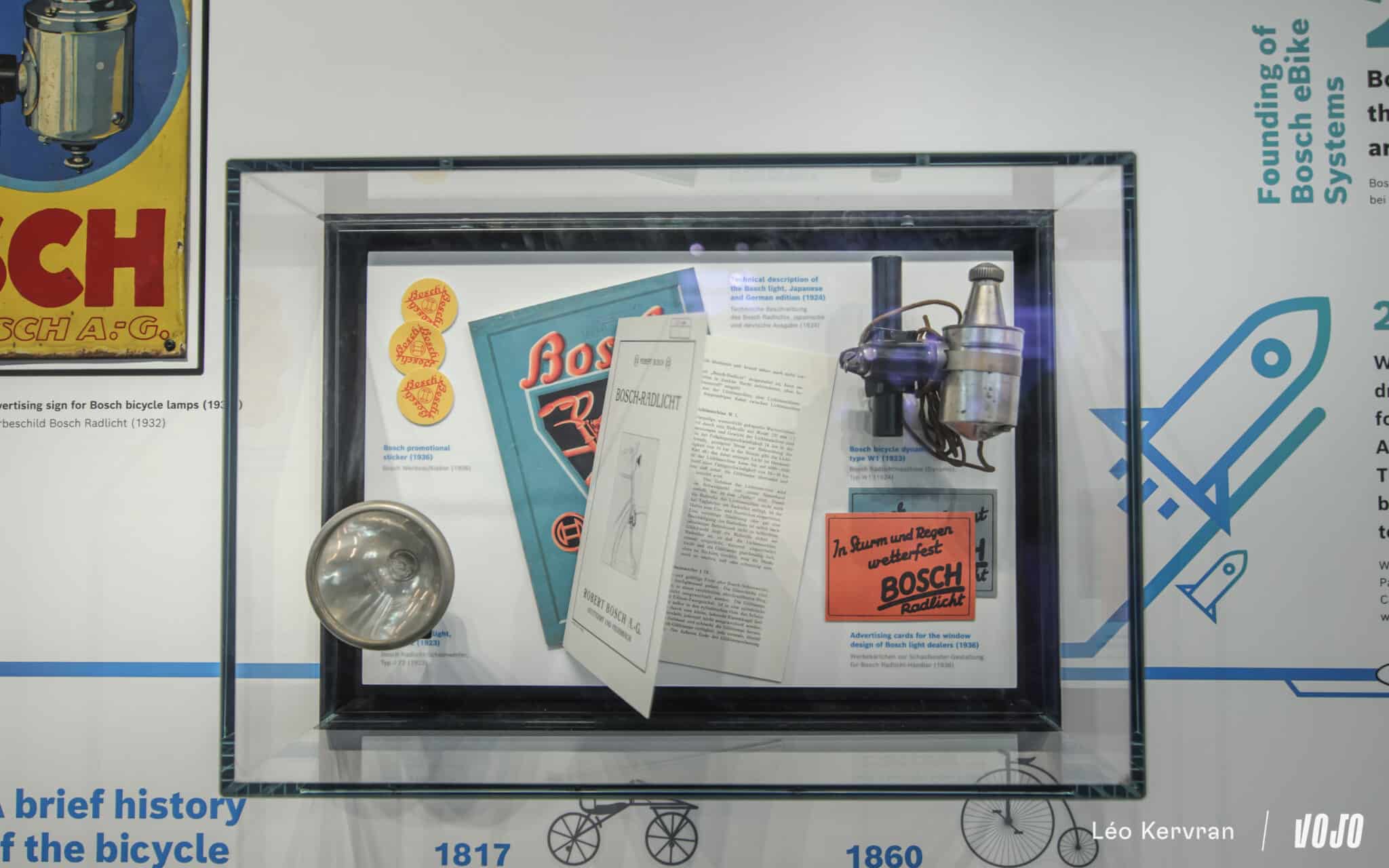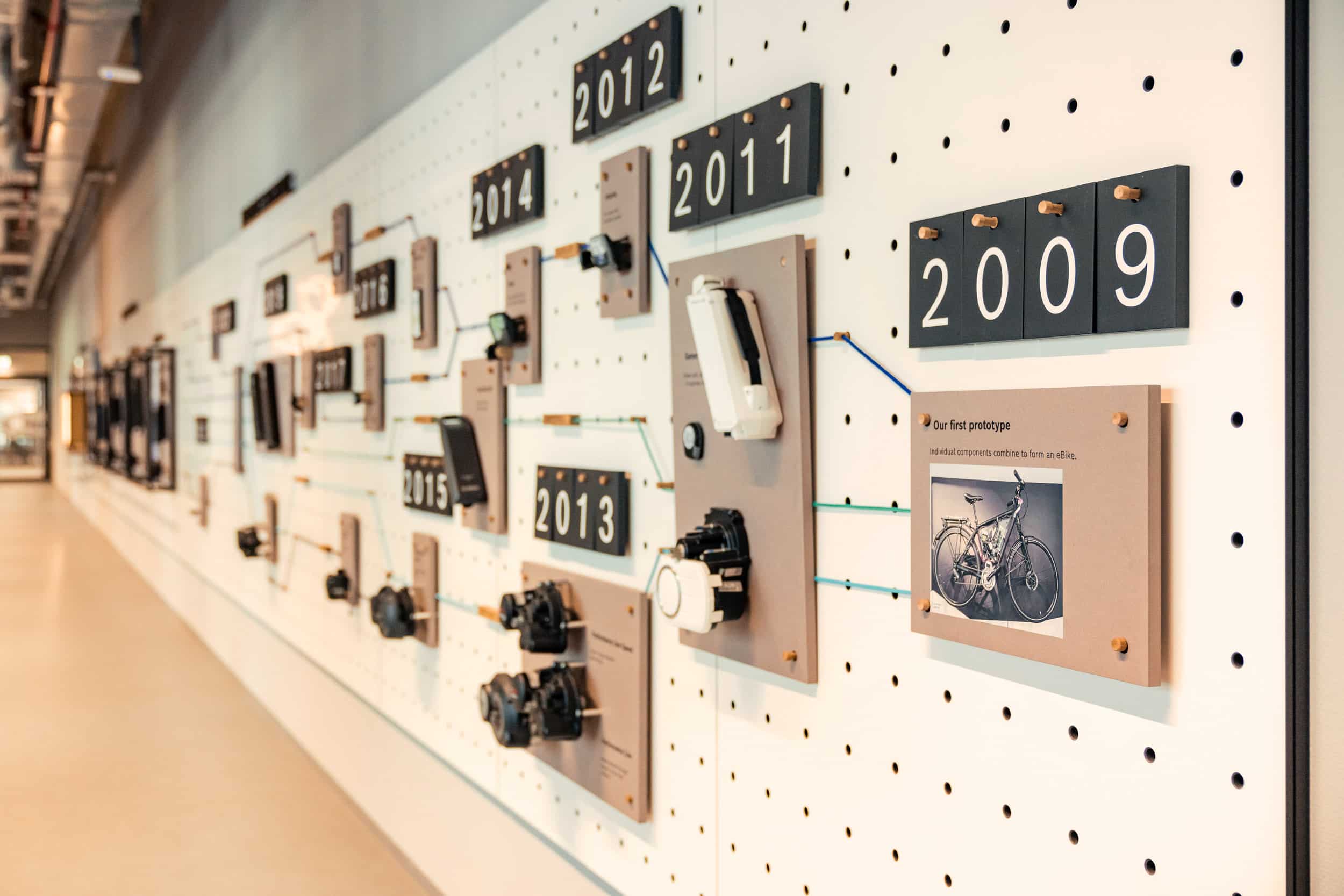 Pour avancer plus loin, il nous faut poser nos appareils photo : Bosch tient à contrôler tout ce qui sort de ses locaux et les objectifs un peu trop curieux des journalistes spécialisés ne sont certainement pas de son goût. Dans le couloir qui s’ensuit, on découvre un mur qui retrace les moments marquants de Bosch dans le segment, du premier prototype en 2009 jusqu’à l’ABS en passant par les diverses générations et évolutions de moteur, de commande, de batterie, de logiciel (l’arrivée du mode eMTB en 2017 notamment)…