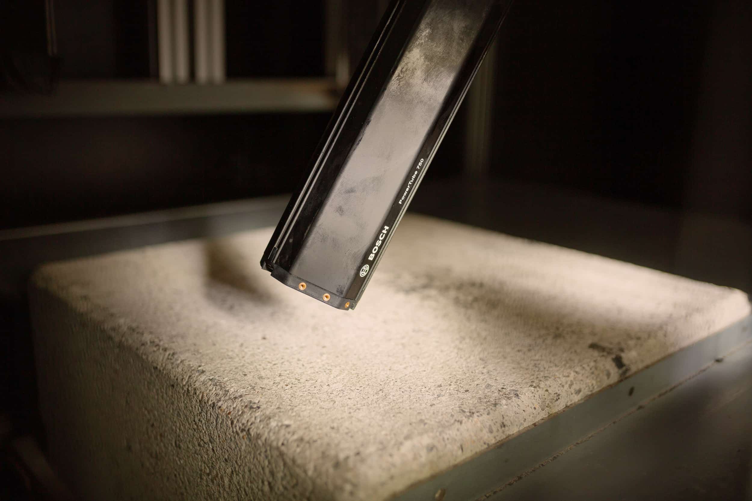 En dessous, on a donc un « petit » espace laboratoire. Petit entre guillemets, car si on se doute que Bosch a beaucoup plus de moyens à sa disposition, ce qu’on a pu voir serait déjà bien grand et confortable pour d’autres marques. Ici, on teste notamment les batteries, d’un point de vue électrique et fonctionnement, mais pas seulement, à l’image de ce « drop test » où la batterie fait une chute d’1 m de haut pour « atterrir » sur une plaque en béton. Bosch vérifiera ensuite le bon fonctionnement de l’ensemble et étudiera la vidéo du test, prise à l’aide d’une caméra haute vitesse, pour analyser l’impact plus en détail.