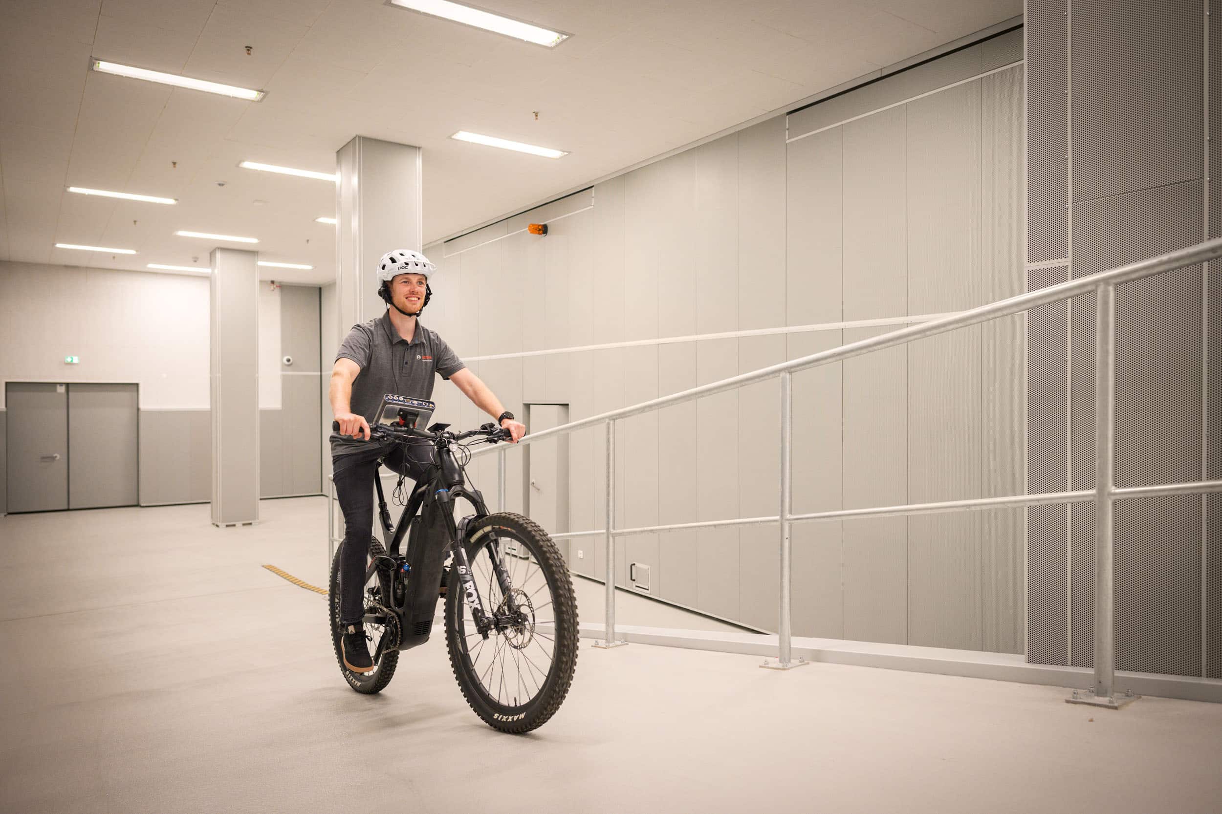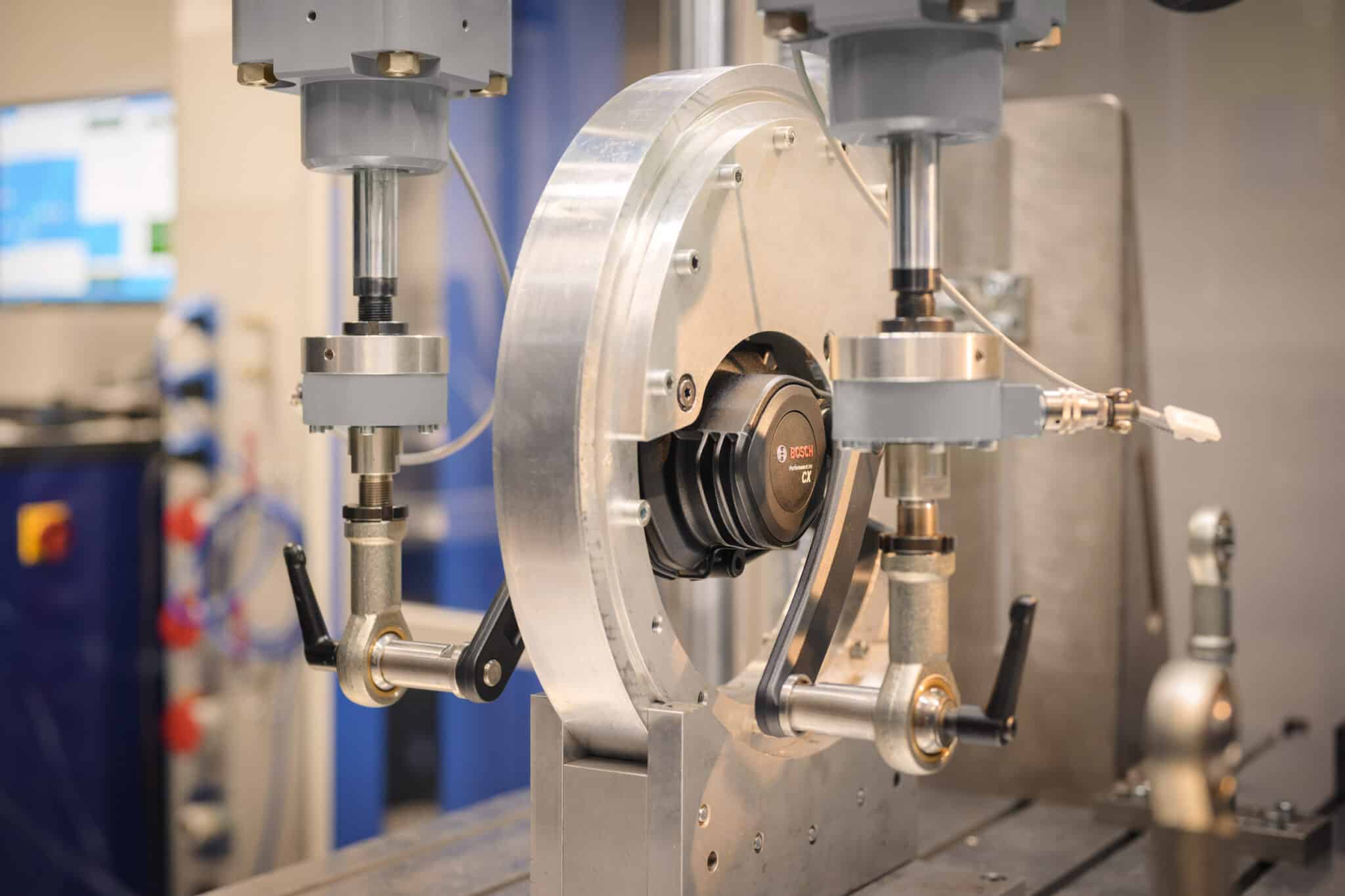 Des tests, toujours des tests : ici sur un vélo complet, pour recréer des conditions au plus proche de la réalité. Entre ces photos communiquées par Bosch et notre visite, un énorme ventilateur pour simuler le vent du déplacement a été rajouté.