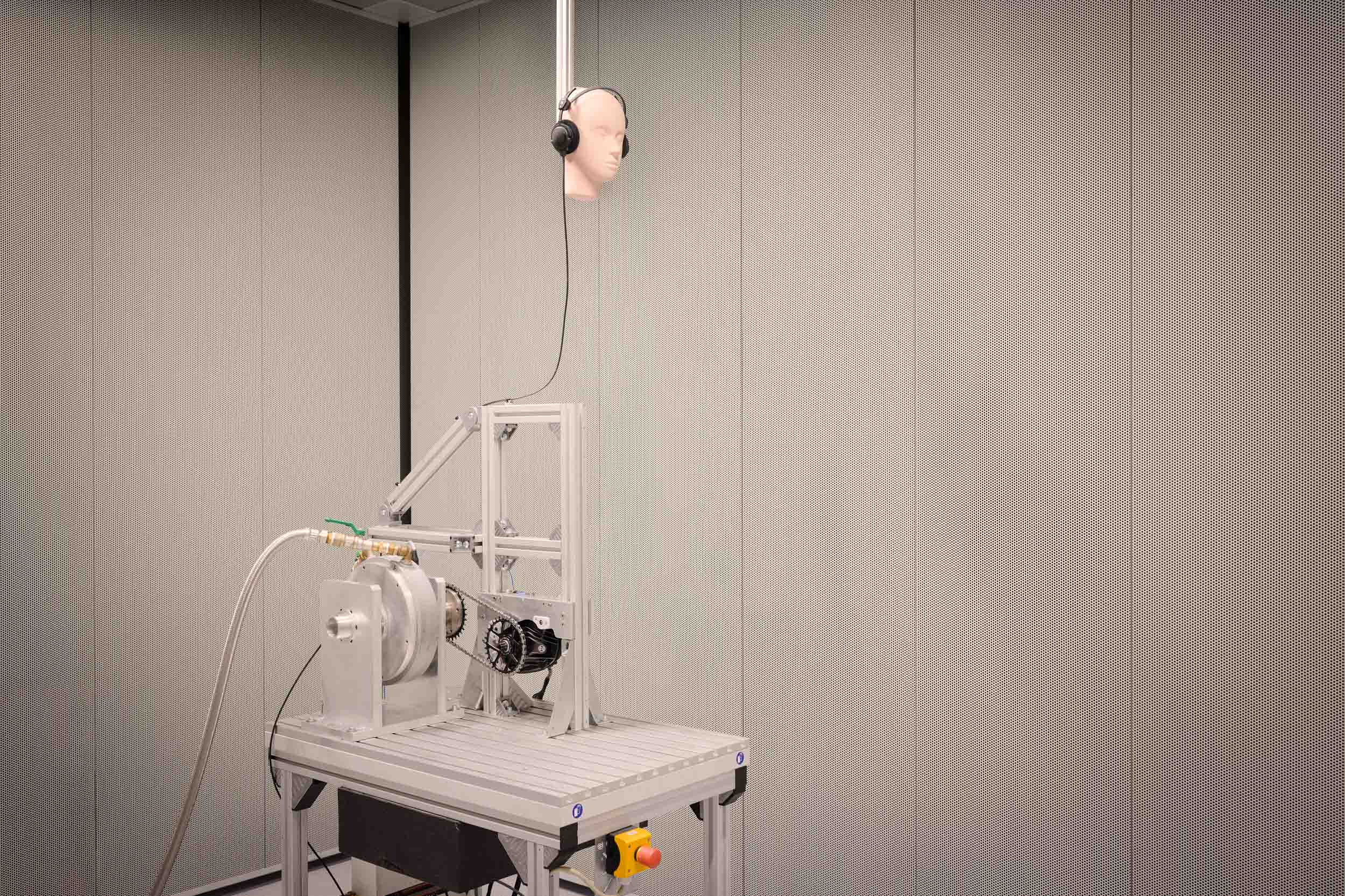 Toutefois, le plus impressionnant et remarquable est certainement le laboratoire d’acoustique, qui mesure le niveau de bruit et les composantes psychoacoustiques du fonctionnement du moteur (perception du bruit, suivant sa tonalité). On trouve ici deux pièces parfaitement isolées des bruits du bâtiment, l’une petite et dédiée aux tests « quantitatifs » (souci du détail, des capteurs sont placé à la hauteur de la tête de l’utilisateur ou l’utilisatrice et pas seulement au niveau du moteur)…