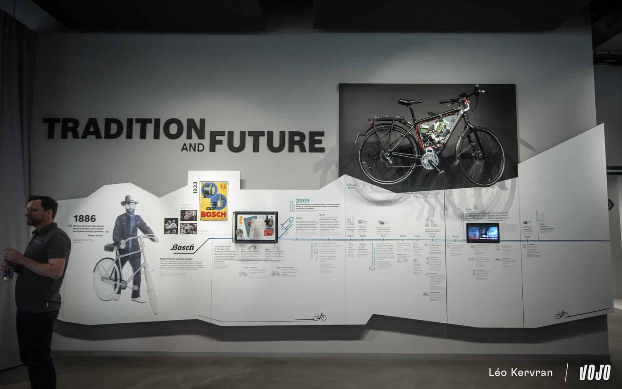 Dans le hall, des fresques rappellent l’histoire de la marque depuis ses débuts en 1886 avec des dynamo (déjà, le vélo n’était pas très loin) ainsi que sa vision de ce que doit offrir un vélo à assistance électrique.
