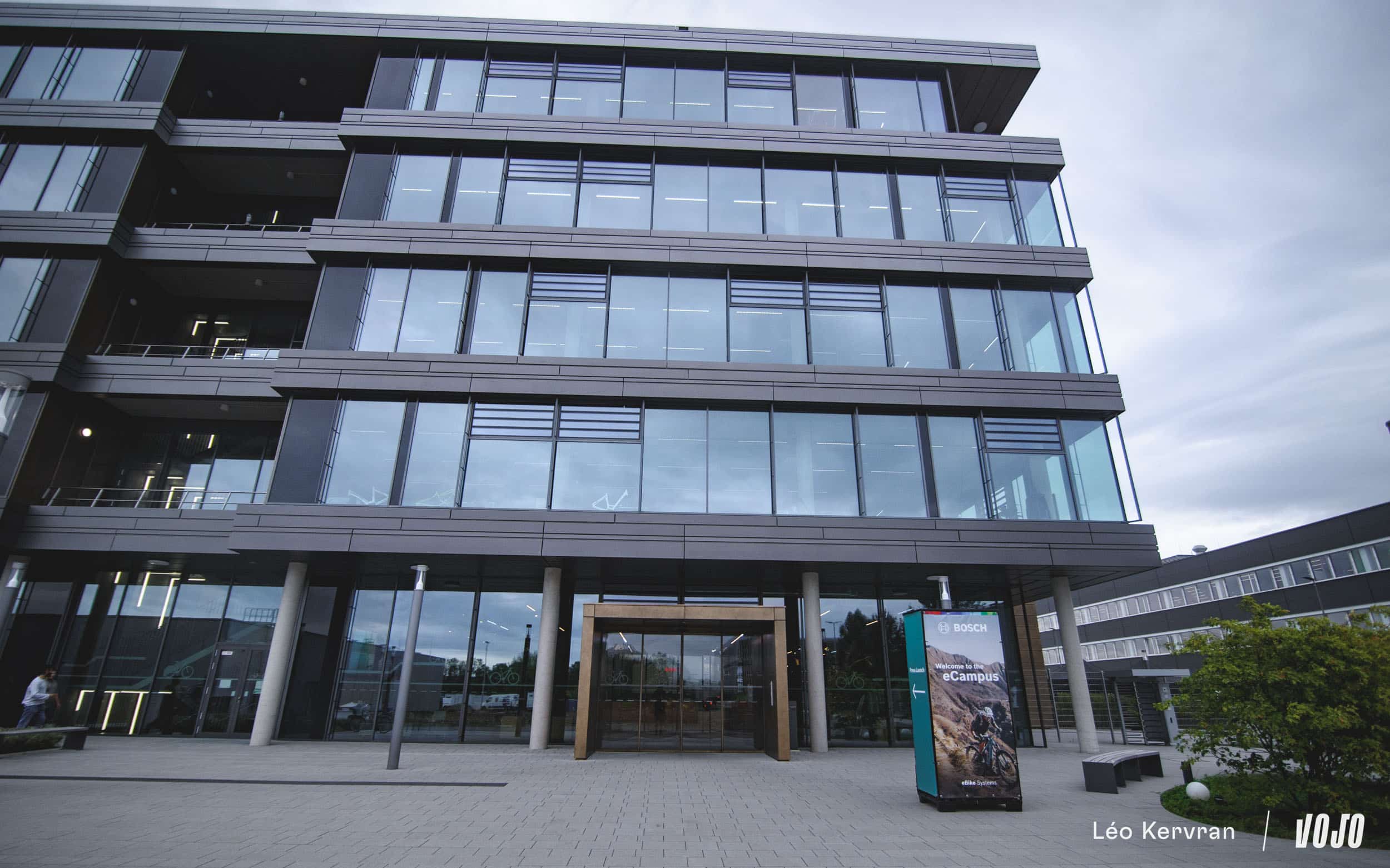 La façade du bâtiment et le hall d’accueil : voici où s’arrêtent généralement les journalistes qui sont invités sur le Bosch eBike Campus. Nous sommes dans le Bade-Würtemberg, à 35 min en train au sud de Stuttgart et c’est ici, dans cet immense bâtiment doté de ses propres pistes d’essai à l’arrière… et à l’intérieur, que Bosch développe tous ses systèmes d’assistance électrique pour vélo depuis 2021.