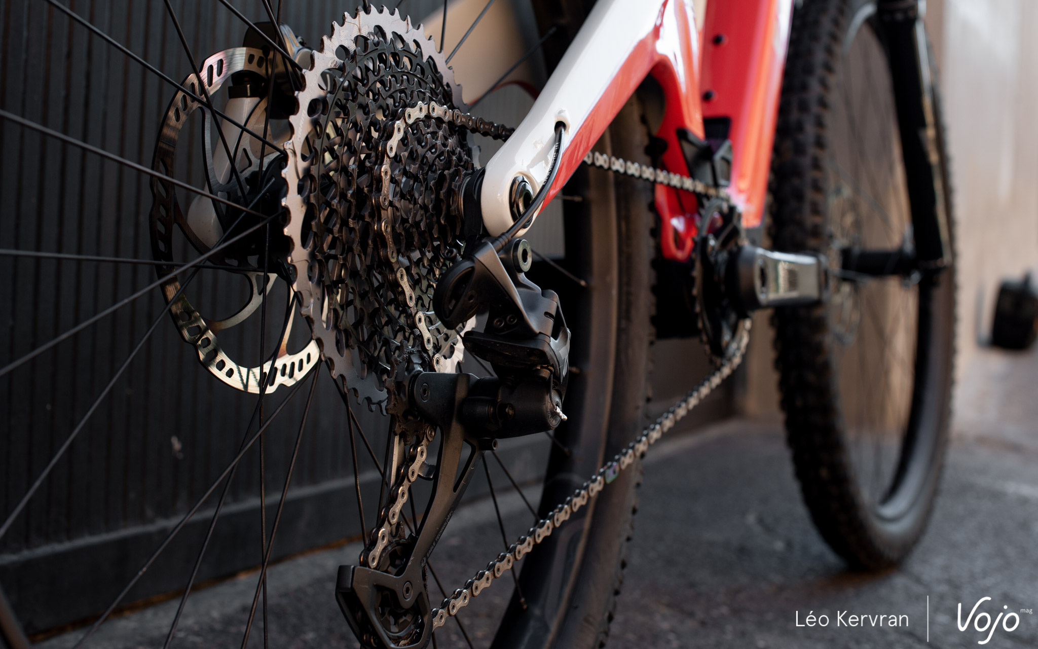 On reste dans le groupe Sram pour la transmission avec du X01 Eagle mécanique, en cassette 10-50 et plateau de 32 dents (pédalier Praxis, manivelles 160 ou 165 mm).