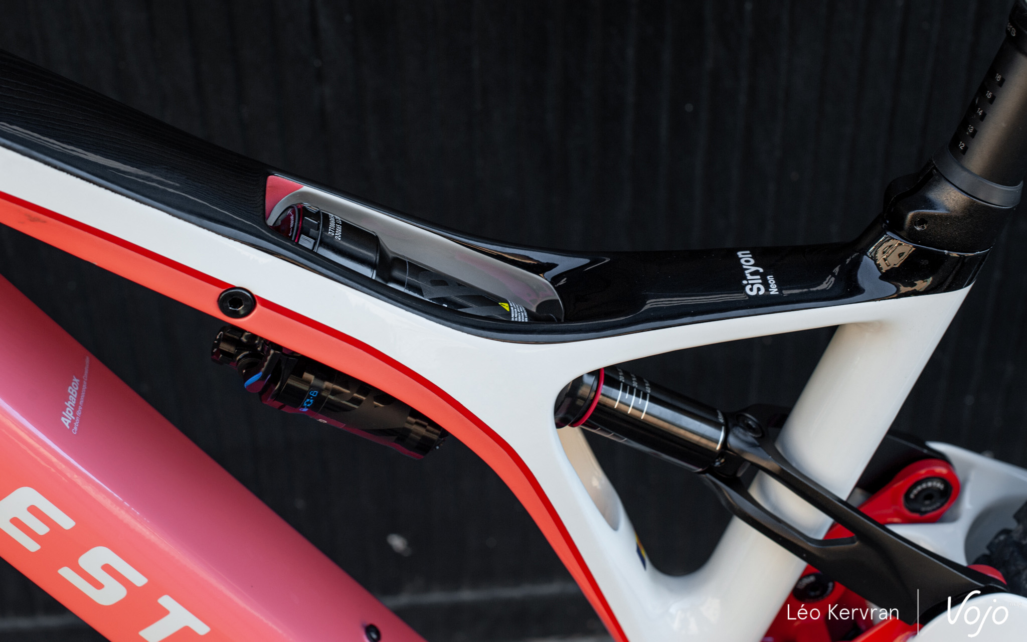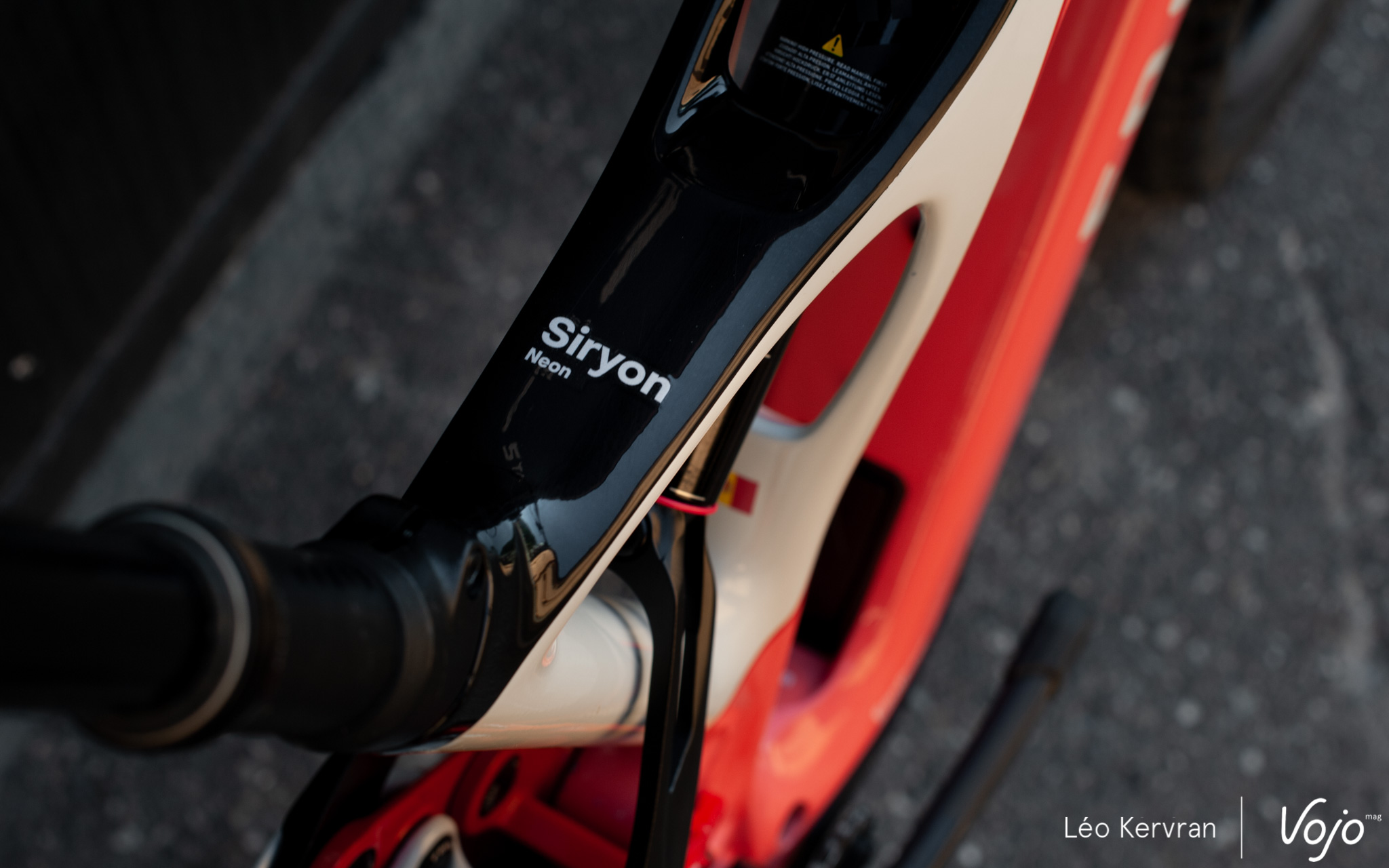 Très réussi en photo, le Syrion l’est tout autant lorsqu’on l’a réellement sous les yeux. La peinture brillante, la jolie ligne rouge qui sépare le rose du blanc, le « puits » et toute la zone autour du tube de selle et du tube supérieur, la suspension arrière… La finition est superbe et donne une belle impression de fluidité, en particulier dans ces tons clairs.