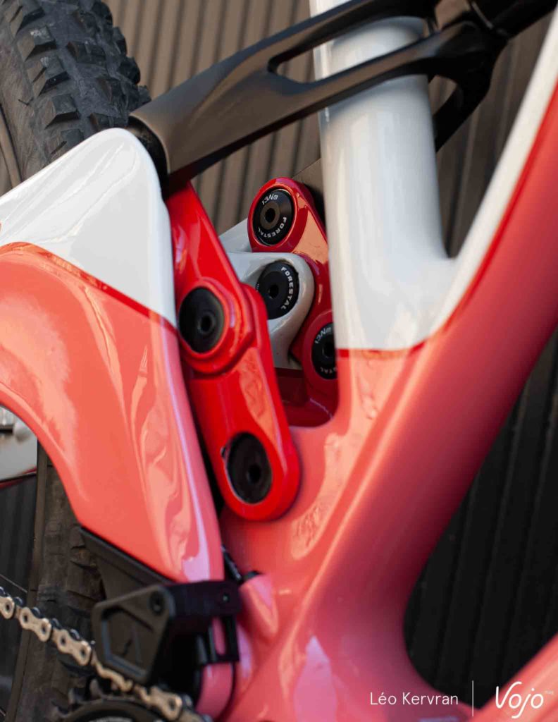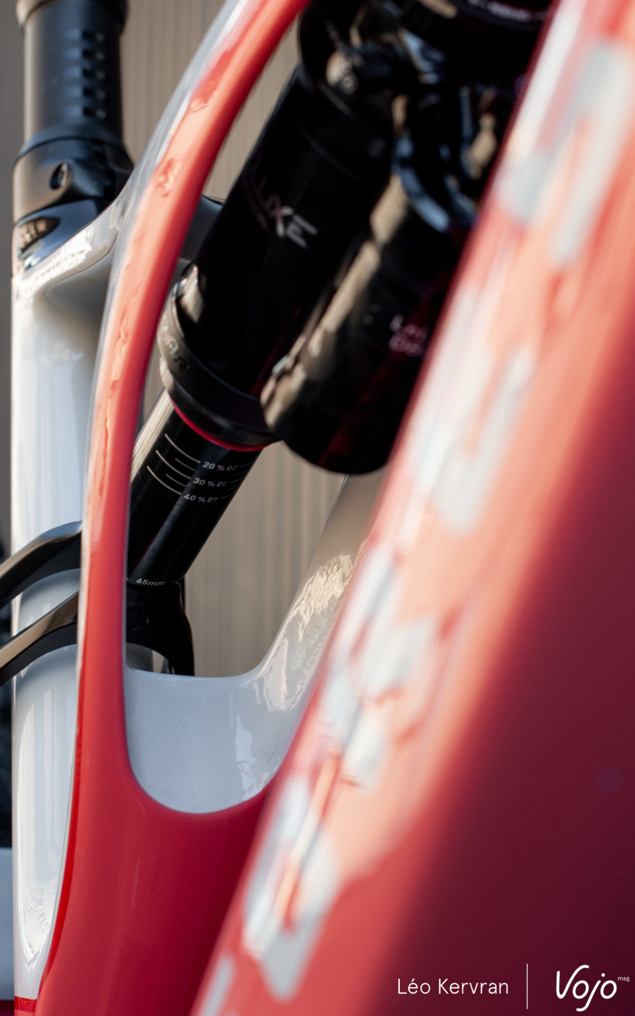 Très réussi en photo, le Syrion l’est tout autant lorsqu’on l’a réellement sous les yeux. La peinture brillante, la jolie ligne rouge qui sépare le rose du blanc, le « puits » et toute la zone autour du tube de selle et du tube supérieur, la suspension arrière… La finition est superbe et donne une belle impression de fluidité, en particulier dans ces tons clairs.
