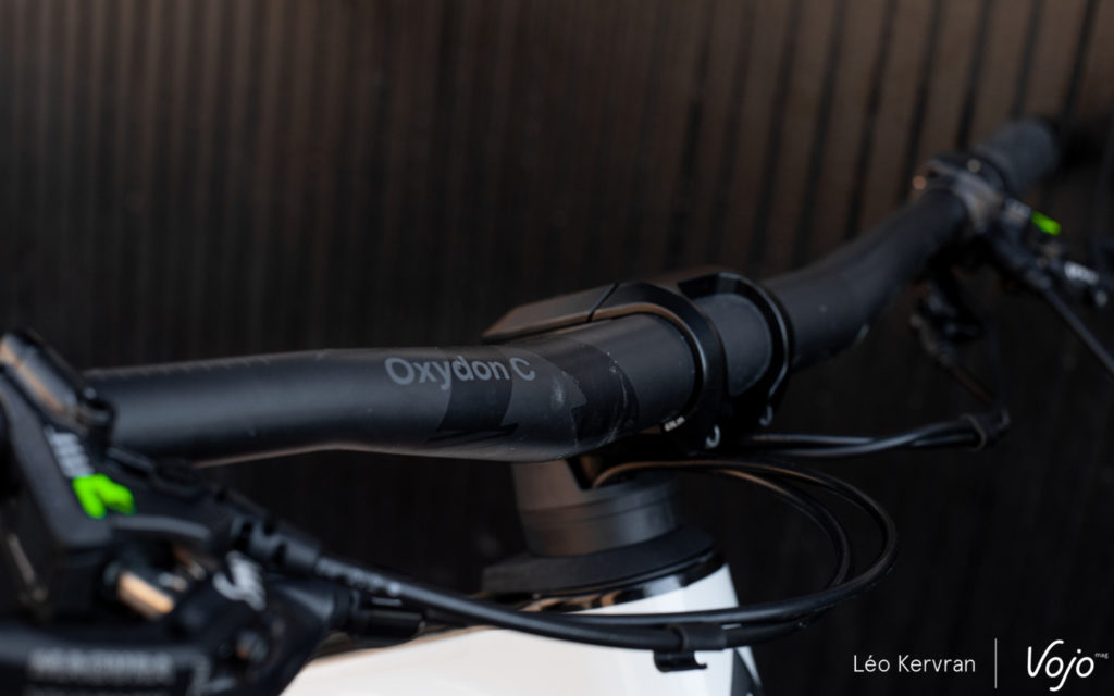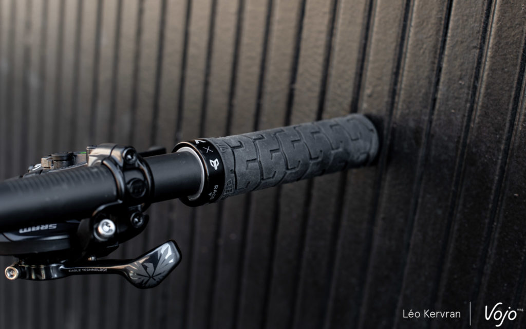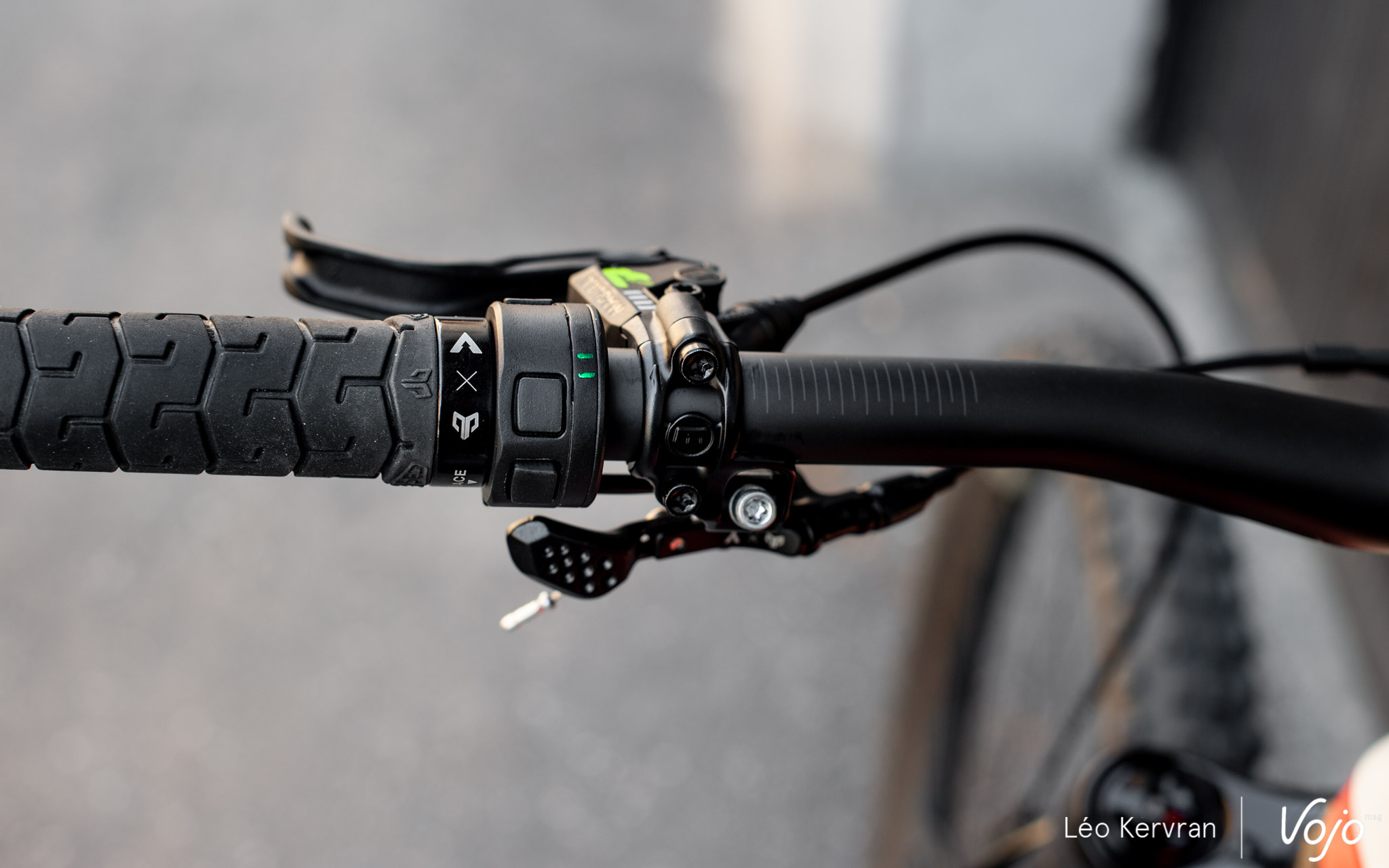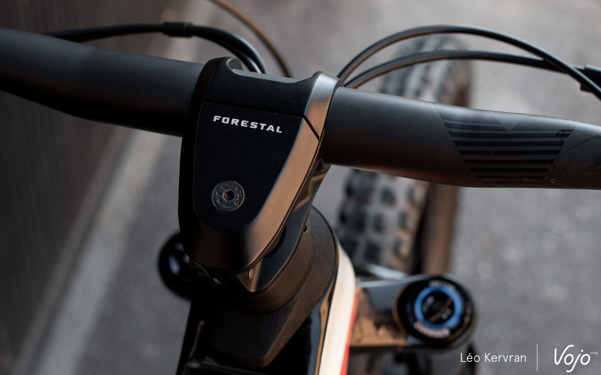 Enfin, en périphériques, on a une tige de selle Crankbrothers Highline 7, une selle Fizik Aidon X3 étudiée spécialement pour les VTTAE, un poste de pilotage Forestal de belle facture (cintre en 31,8 x 800 mm et potence en 45 mm) et les fameuses poignées Production Privée CR35, qui permettent d’ajuster encore les angles du cintre.