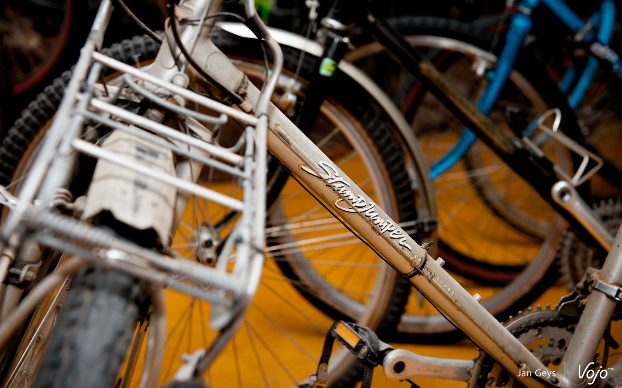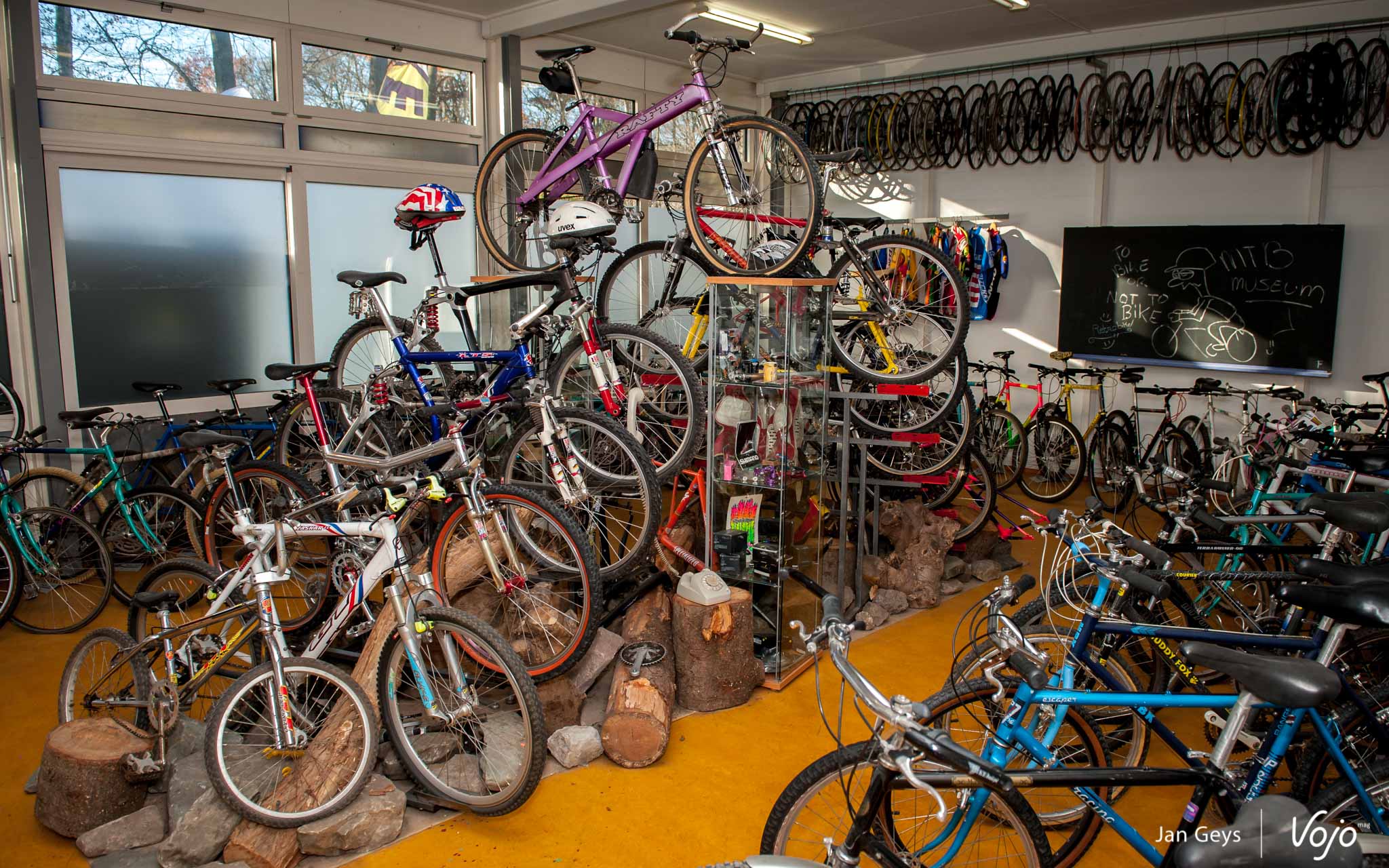 Dans les vieux locaux de l’école, Jeroen a laissé les tableaux et cartes aux murs, mais les anciens bureaux des élèves ont laissé la place à une collection immense de vélos en tous genres, et plus précisément, de VTT en tous genres. Impossible de tous les compter, je ne peux donc que croire Jeroen lorsqu’il m’annonce qu’il doit y en avoir plus de 700 (!) actuellement, représentant quelque 160 marques. Inutile de les nommer toutes, mais il est clair que quelques marques parmi les plus populaires et connues (Specialized, Cannondale, Rocky Mountain, Scott ou Giant) sont bien représentées.