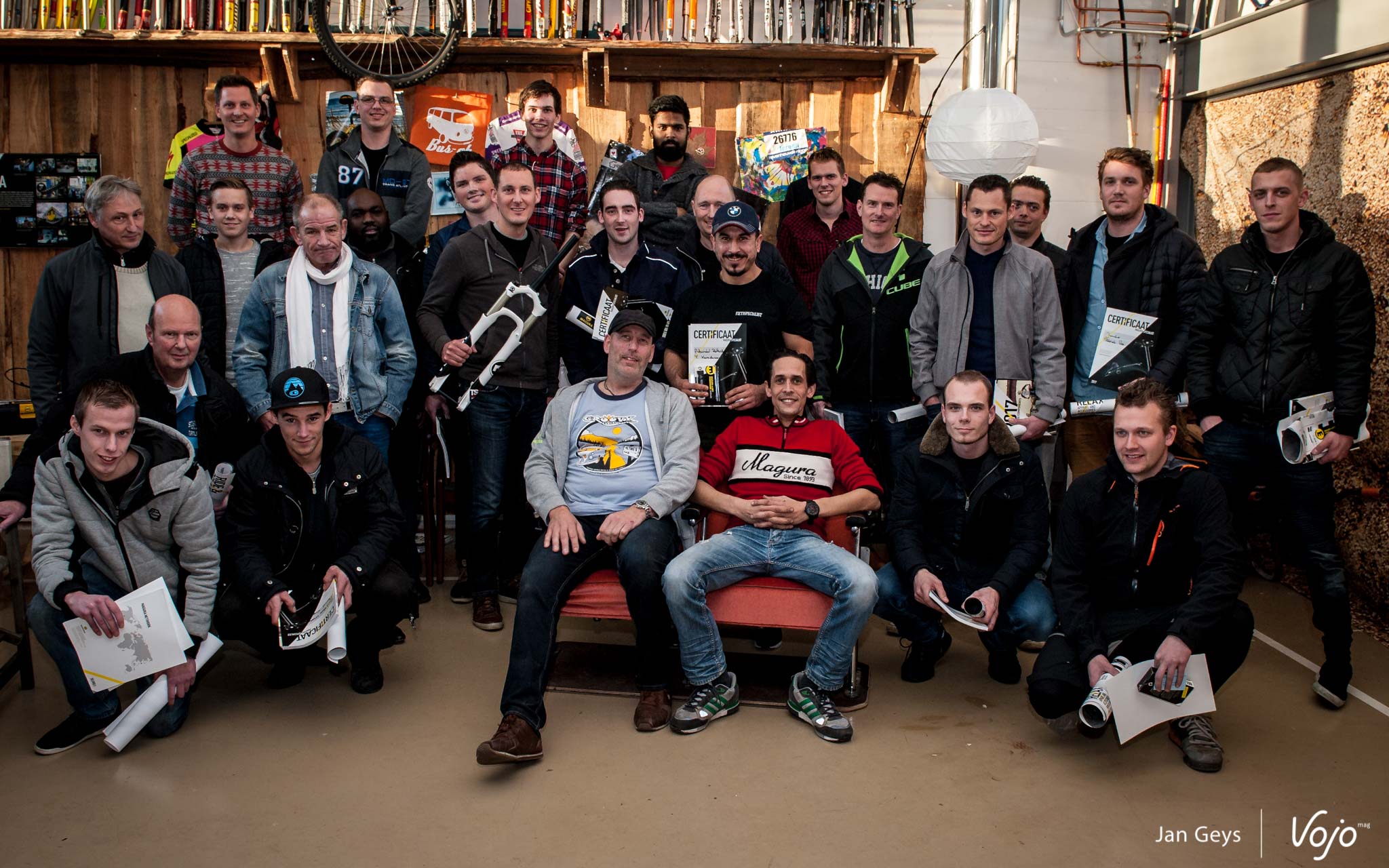 La journée se termine alors que je reviens dans la salle de gym pour retrouver Chiel qui clôture la formation avec quelques derniers conseils sur les plaquettes de frein et le centrage des étriers. Chaque participant reçoit finalement un certificat et un petit cadeau, mais pas avant d’avoir posé pour la photo de groupe obligatoire !