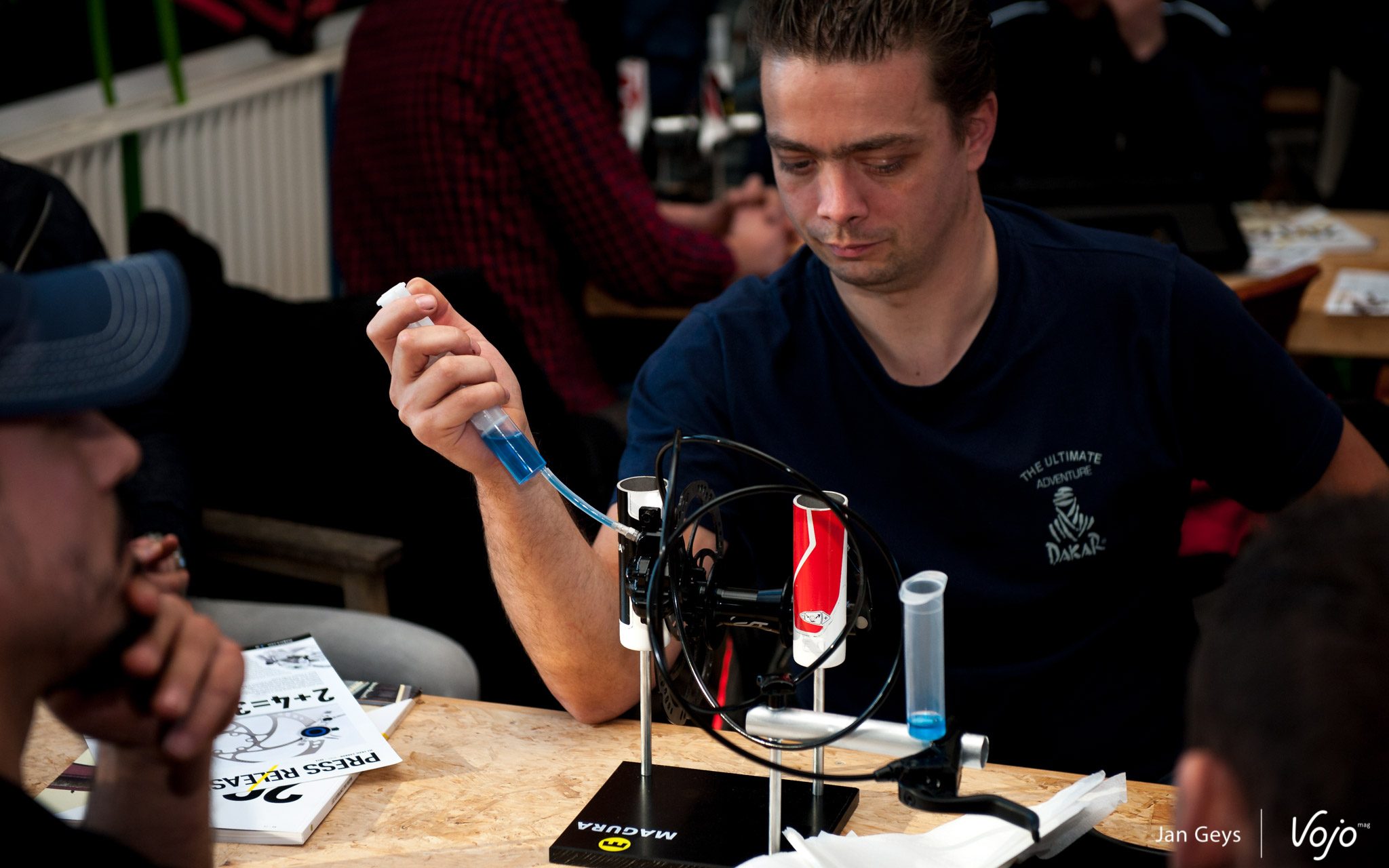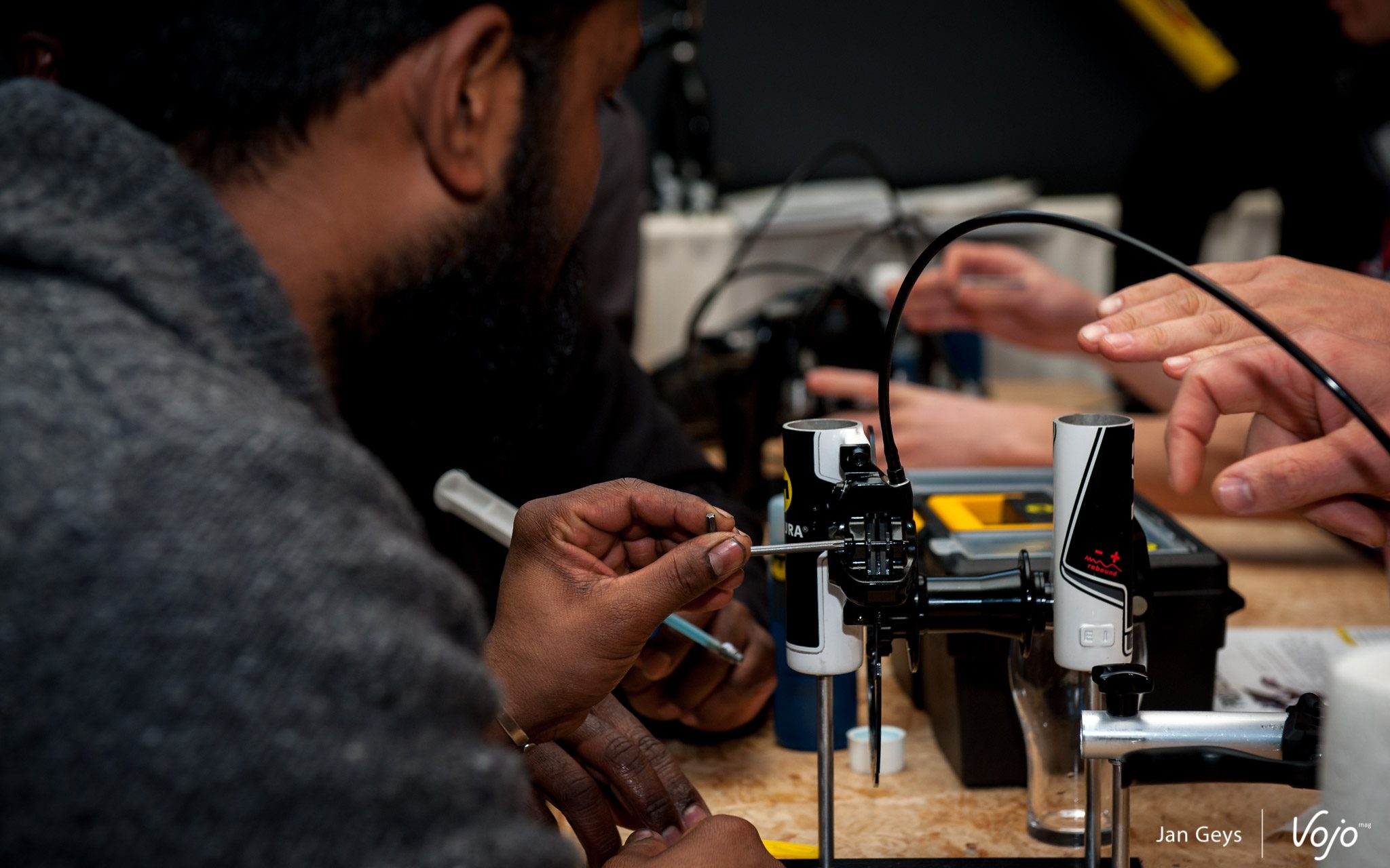 Mais retournons à l’essentiel de notre visite. Chiel a installé ses invités confortablement dans la salle de gym et se lance dans son discours d’accueil, tout en situant brièvement Magura. Dans le monde du VTT, la marque est surtout synonyme de freins et de suspensions. D’ailleurs, Chiel commence la formation en expliquant le fonctionnement des célèbres freins hydrauliques sur jante, les HS. En plus des conseils habituels, les revendeurs (qui sont d’ailleurs les invités exclusifs de ces journées de formation, de façon à ce que le clients puissent leur remettre leurs précieux composants en toute confiance) reçoivent également des astuces plus pointues. Comment “splitter” un frein, par exemple, si l’on souhaite actionner 2 freins avec une seule main. En plus des explications techniques sur les suspensions et les tiges de selle télescopiques de la marque, Chiel explique également aux revendeurs comment régler eux-mêmes des petits soucis ou encore comment optimiser le travail en atelier en général.