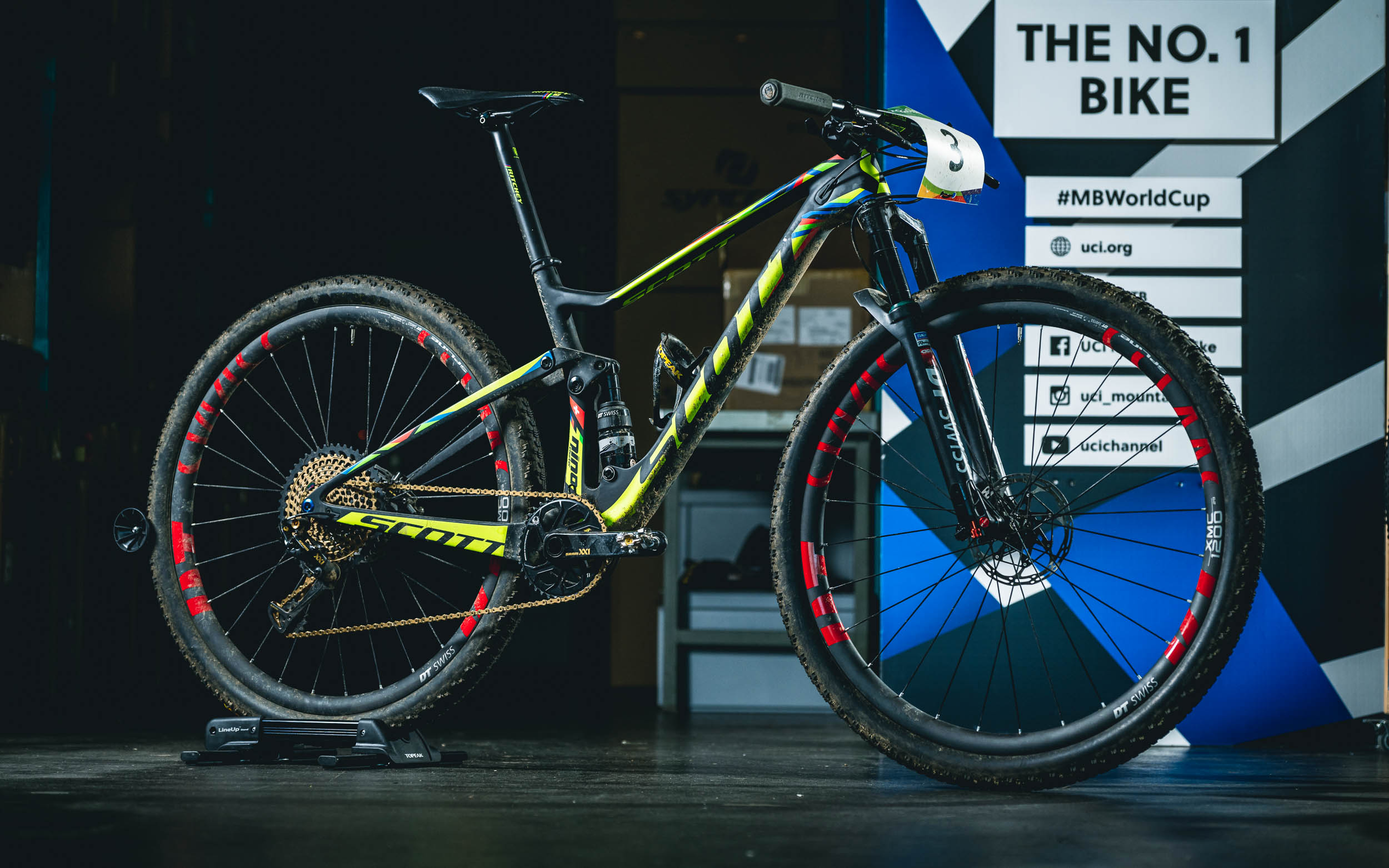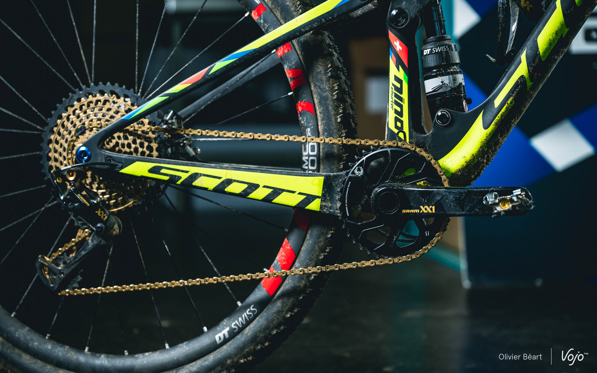 Par rapport au Spark roulé aux JO de Rio, le cadre est identique avec simplement ici une peinture spéciale faisant référence à l’or olympique et à ses principales autres victoires. Par contre, il y a du nouveau du côté des suspensions avec l’arrivée de RockShox à la place de DT Swiss ; le team s’appelant désormais Scott-Sram, ce qui est toujours le cas aujourd’hui.